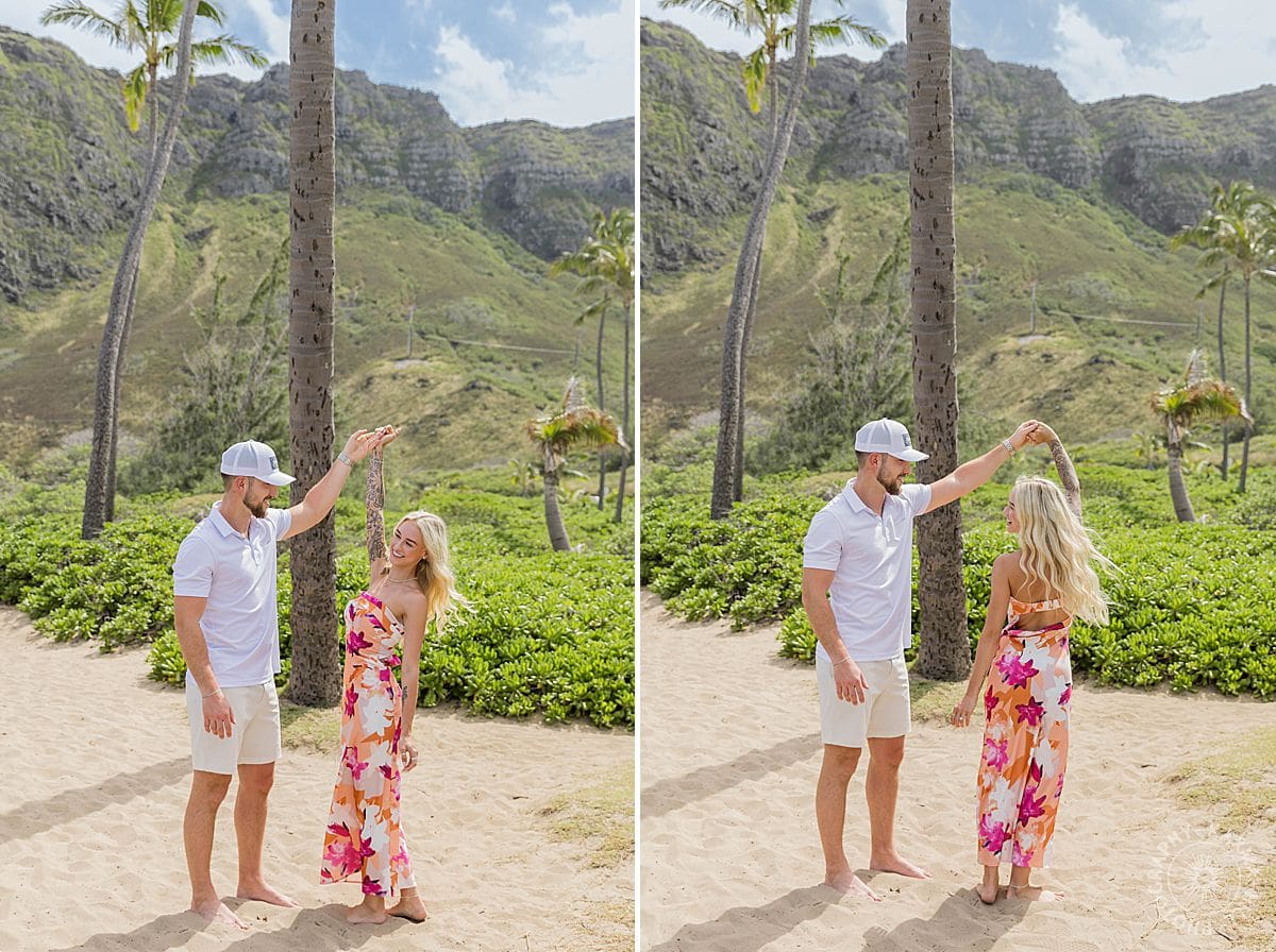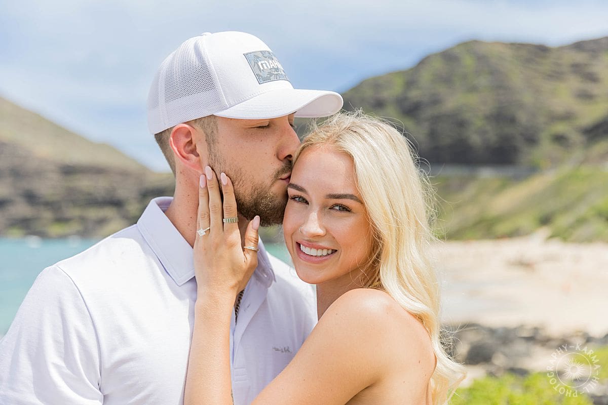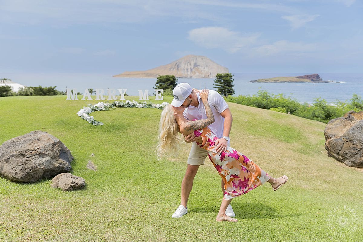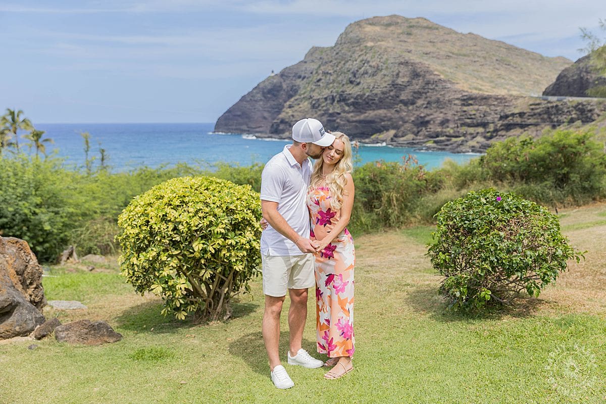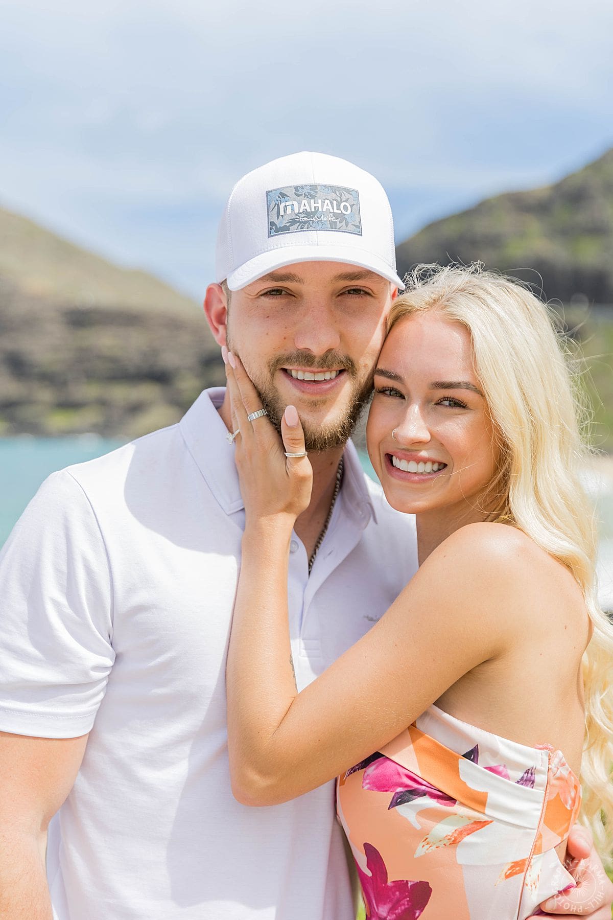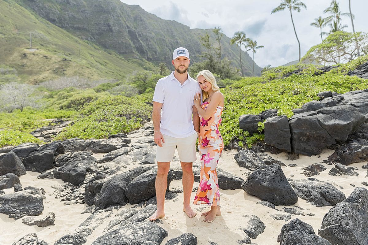 After she said yes (!!!), the two of them soaked in the moment—just standing there, hand in hand at the beach, the ocean breeze swirling around them, and the most incredible view. Like, “how is this real life?” level scenery. They posed for a few Oahu proposal portraits with the backdrop looking like a postcard for paradise. The joy was impossible to miss.