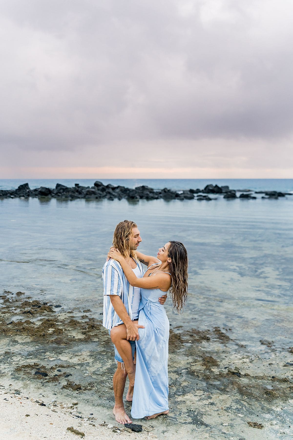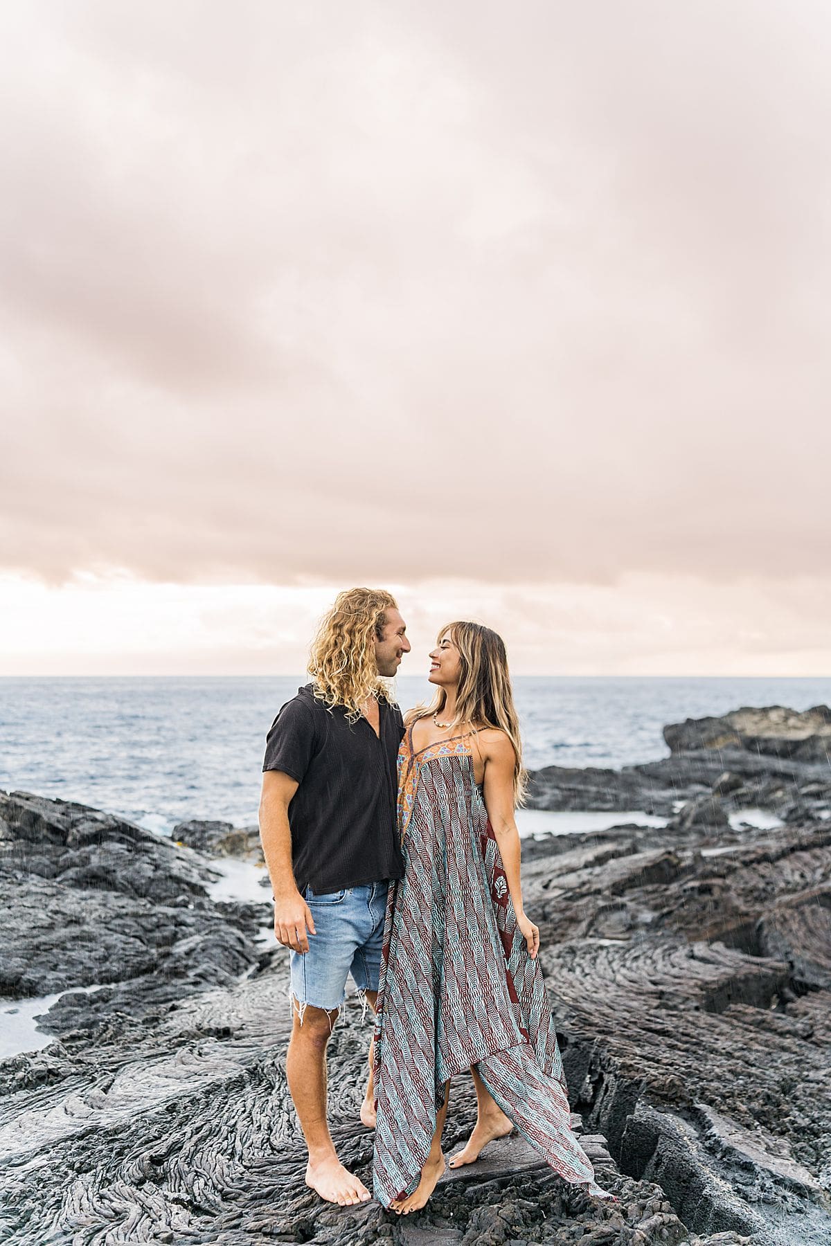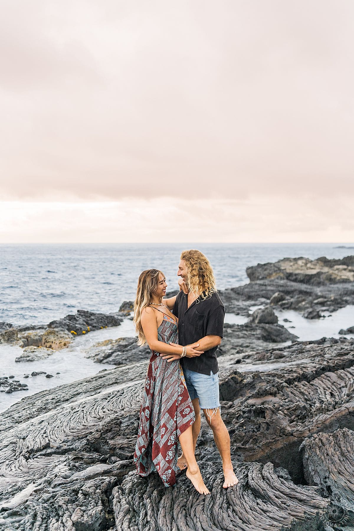 The sky stretched out in shades of soft lavender and peach, casting a dreamy glow over everything, while the ocean rushed onto the lava rocks. And there they were: Ashton with his carefree curls and sun-kissed charm, and Angelene in a flowy dress that brought the aloha vibes. Every moment felt like a scene from the ultimate beachside love story.