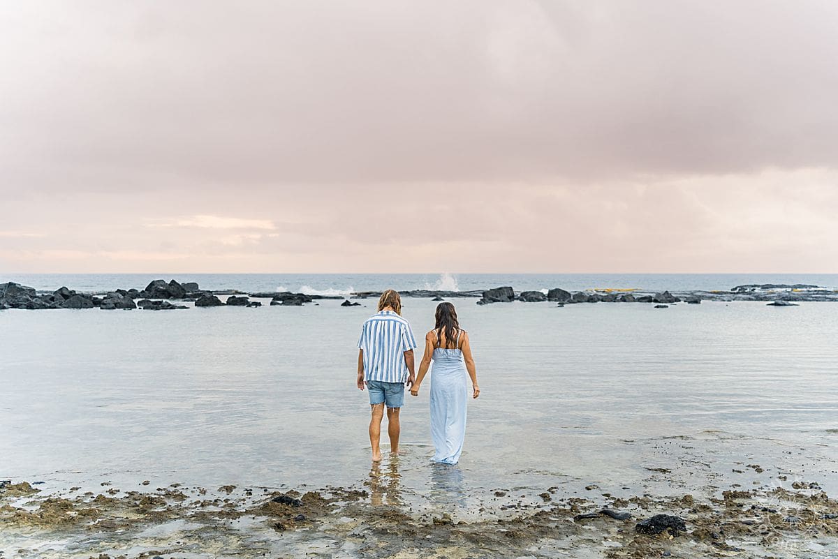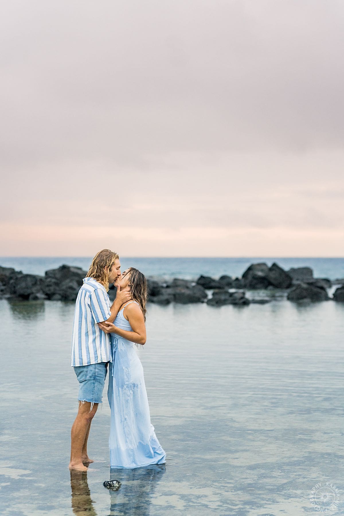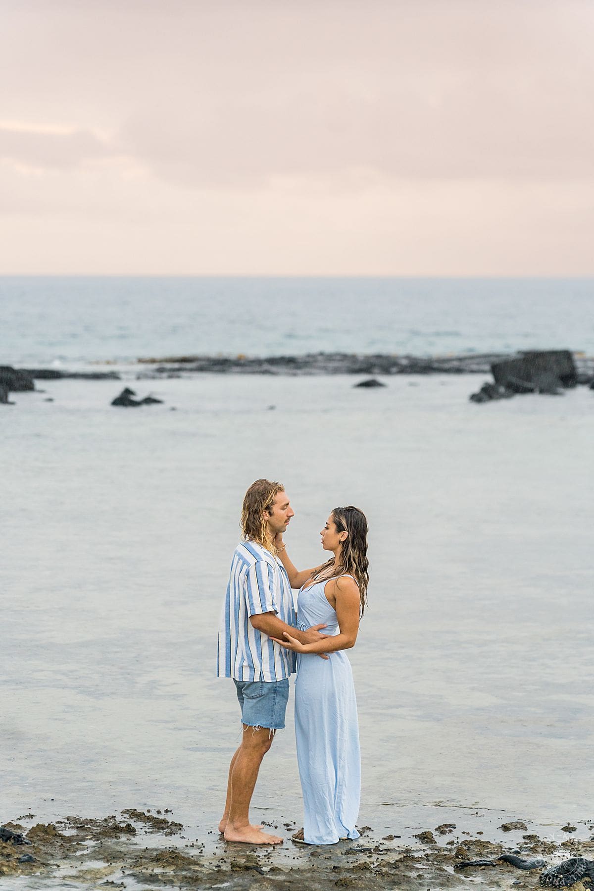 The sky stretched out in shades of soft lavender and peach, casting a dreamy glow over everything, while the ocean rushed onto the lava rocks. And there they were: Ashton with his carefree curls and sun-kissed charm, and Angelene in a flowy dress that brought the aloha vibes. Every moment felt like a scene from the ultimate beachside love story.