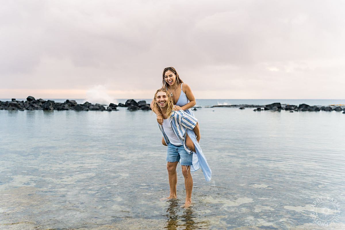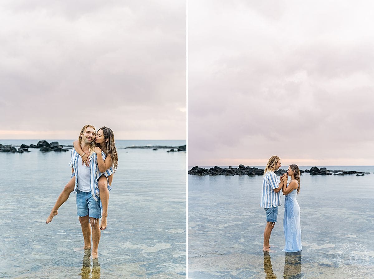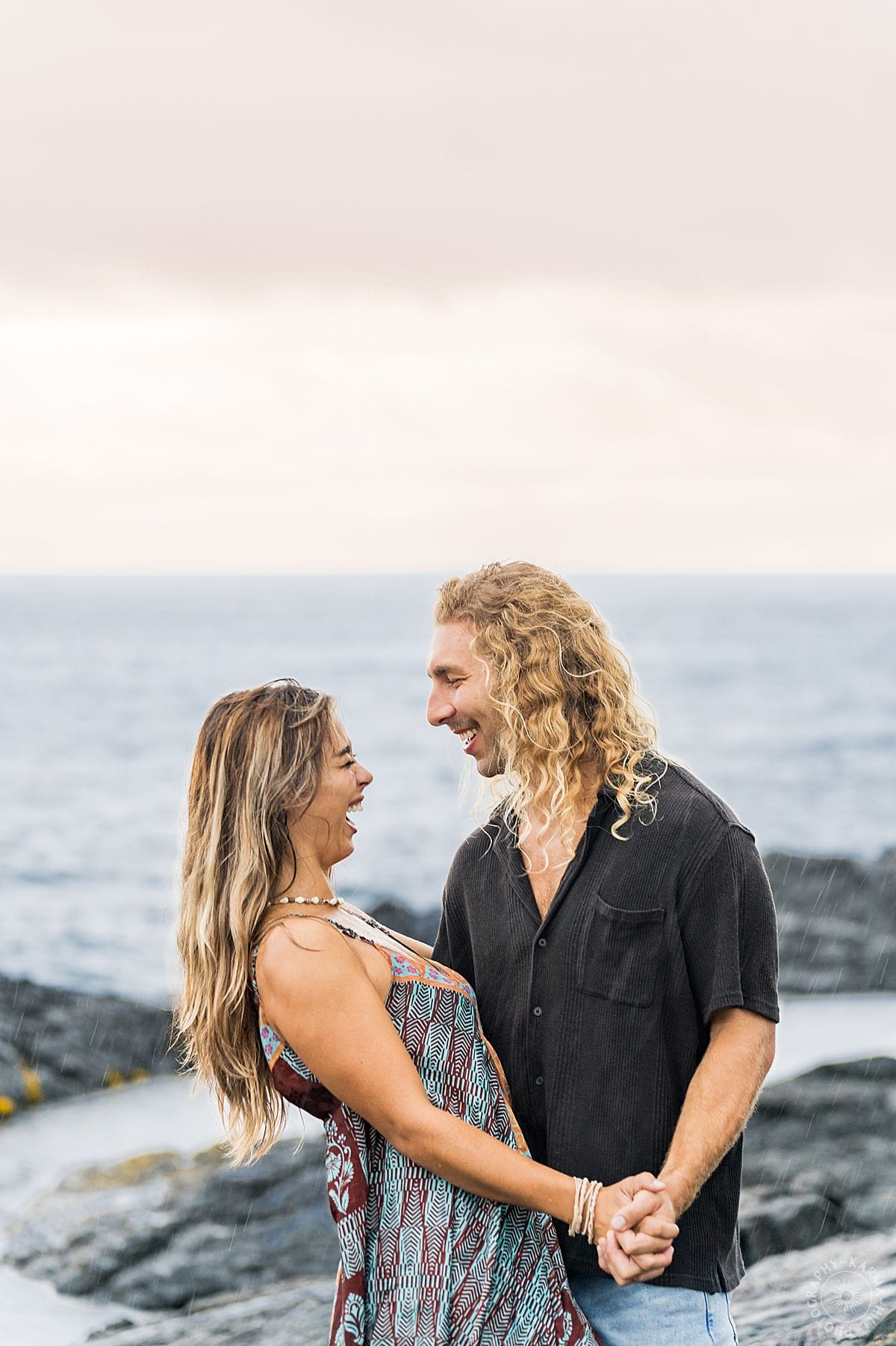 Our Big Island couples portrait session caught everything: the sweet forehead kisses, the piggyback rides, the casual strolls that somehow looked like editorial fashion campaigns. And rain? What rain! Even the slightly wild waves got in on the action, offering a little drama to the softness of their chemistry.