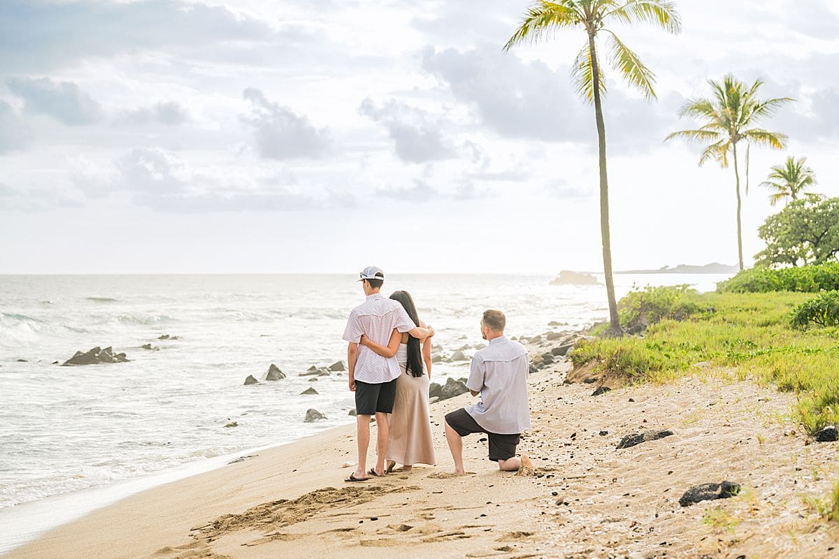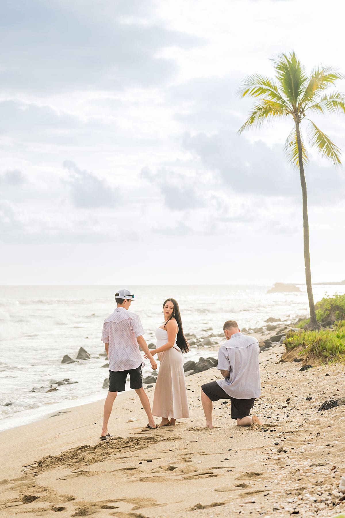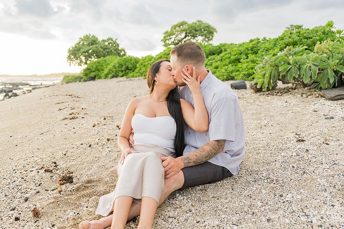Austin and Mia’s Big Island proposal portrait took place at Old Kona Airport Beach, where lava rocks meet golden sand and the sky can’t decide if it wants to be pink, gold, or just impossibly dreamy. It was the kind of evening that makes you feel like something big is about to happen. Spoiler alert: it did.
