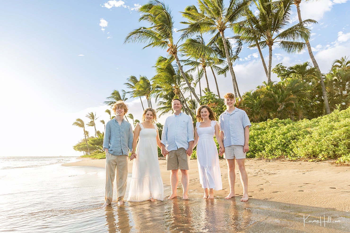 Their kiddos had fun goofing around together, which makes candid moments so fun and sweet! You can really see their personalities and connections. We love how everyone coordinated in matching whites and blues for a dreamy and beachy look for their portrait session. Our Maui family photographer ensured to get some stellar sunset portraits of our sweet family too! Even if they got their dresses and shorts wet, it all added to their portraits’ relaxed and carefree feeling…