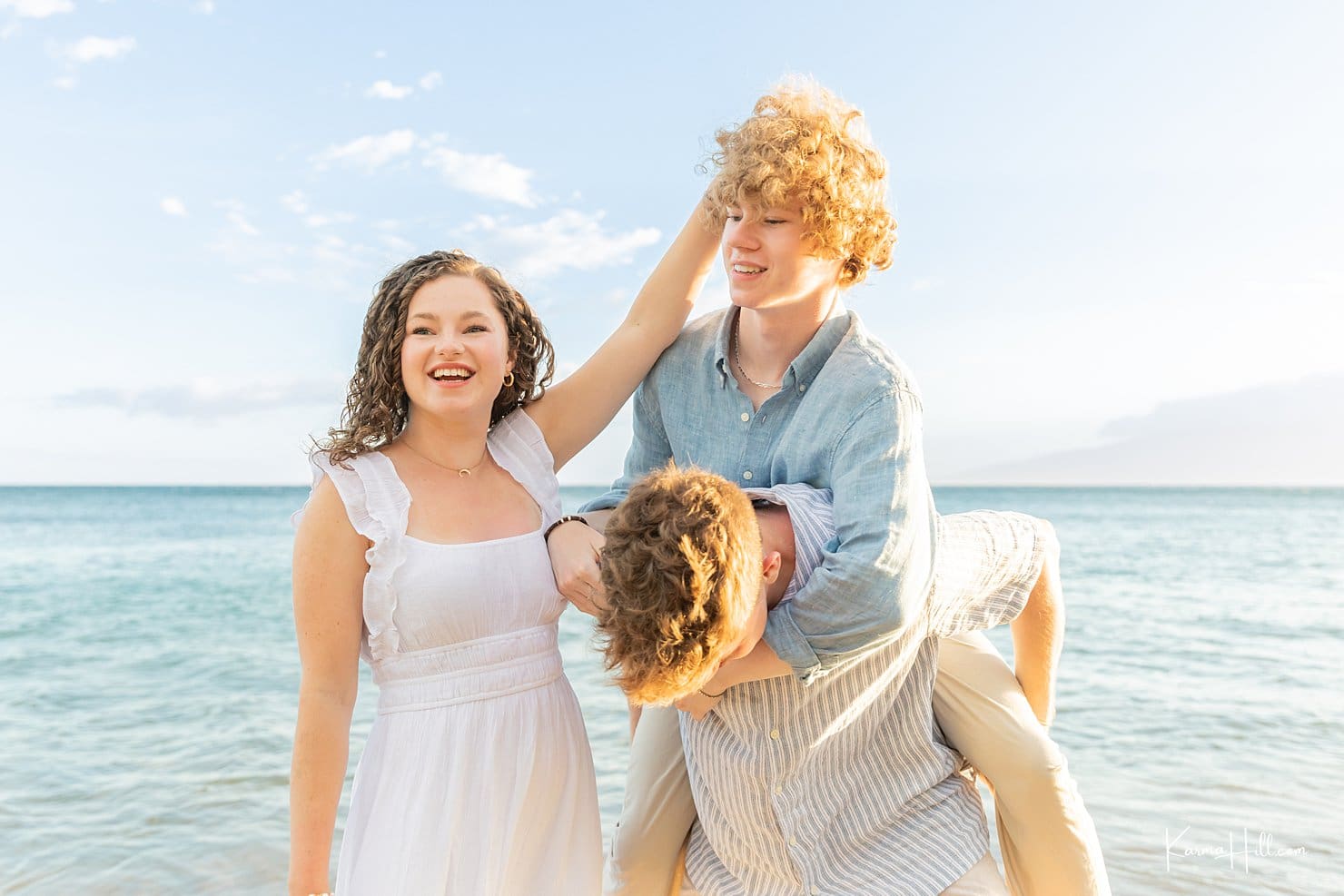 Joshua and Lydia are parents to three amazing kids, Emma, Ben, and Ethan. Two are in college, one in high school, and they are so close. They had the best time on the beach with our Maui family photographer at Baby Beach, soaking up the sunshine and the last of their summer break. If only summer vacation lasted longer! Thankfully they have some amazing new memories to savor for years to come…