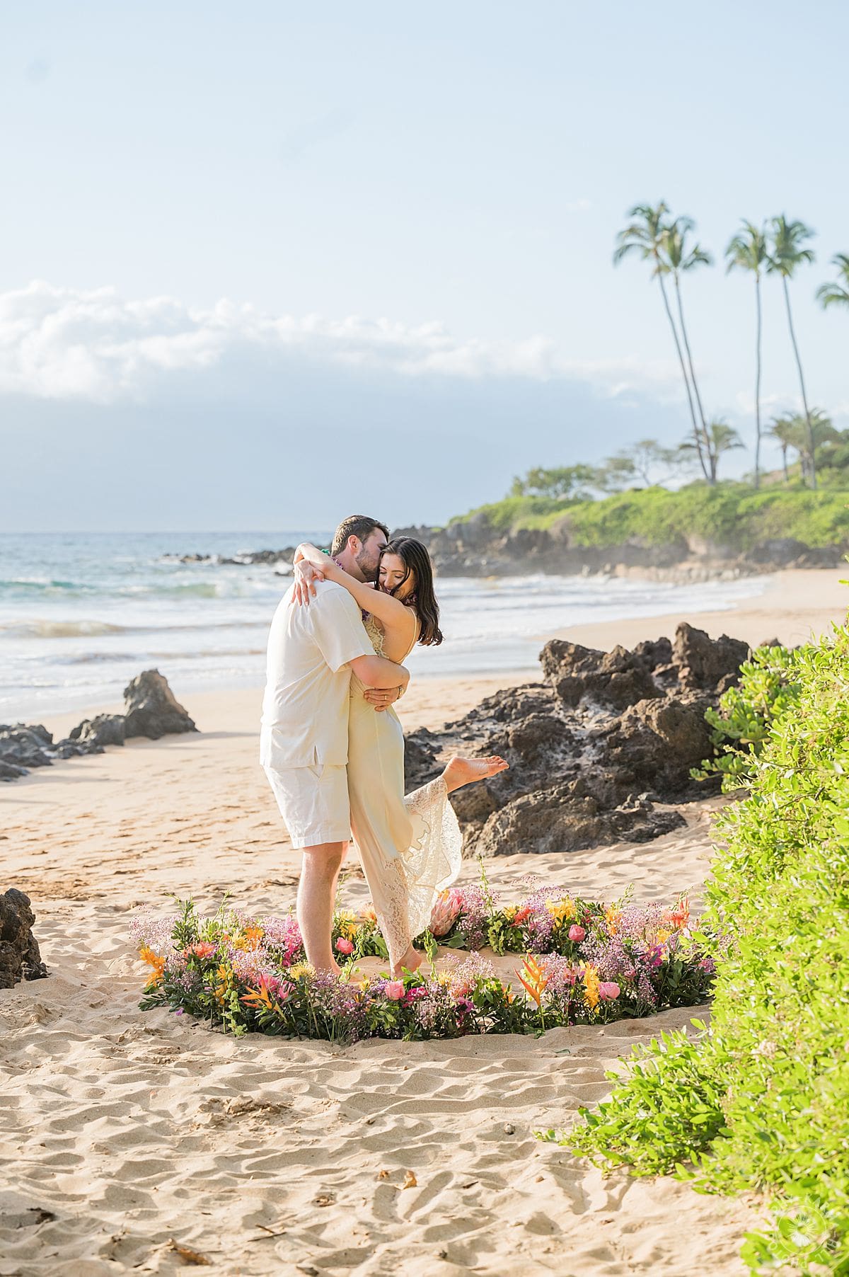 Maui proposal portraits have a certain kind of magic to them, and Casey and Emily’s moment was no exception. Picture this: golden hour on a quiet beach, waves gently lapping the shore, and the kind of sunset that makes you want to frame it. Add to that a tropical flower circle so vibrant it could have been plucked straight from a tropical fairytale, and you’ve got the perfect recipe for a life-changing “yes.”