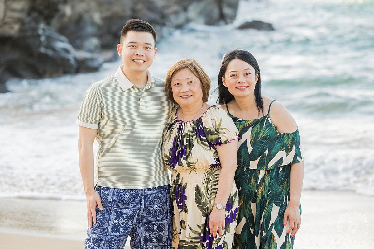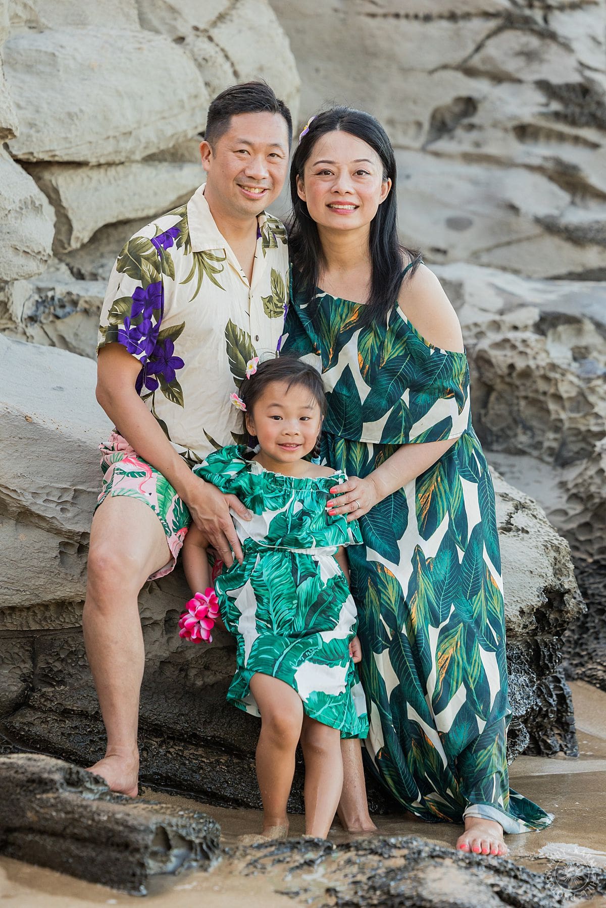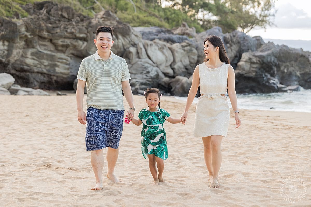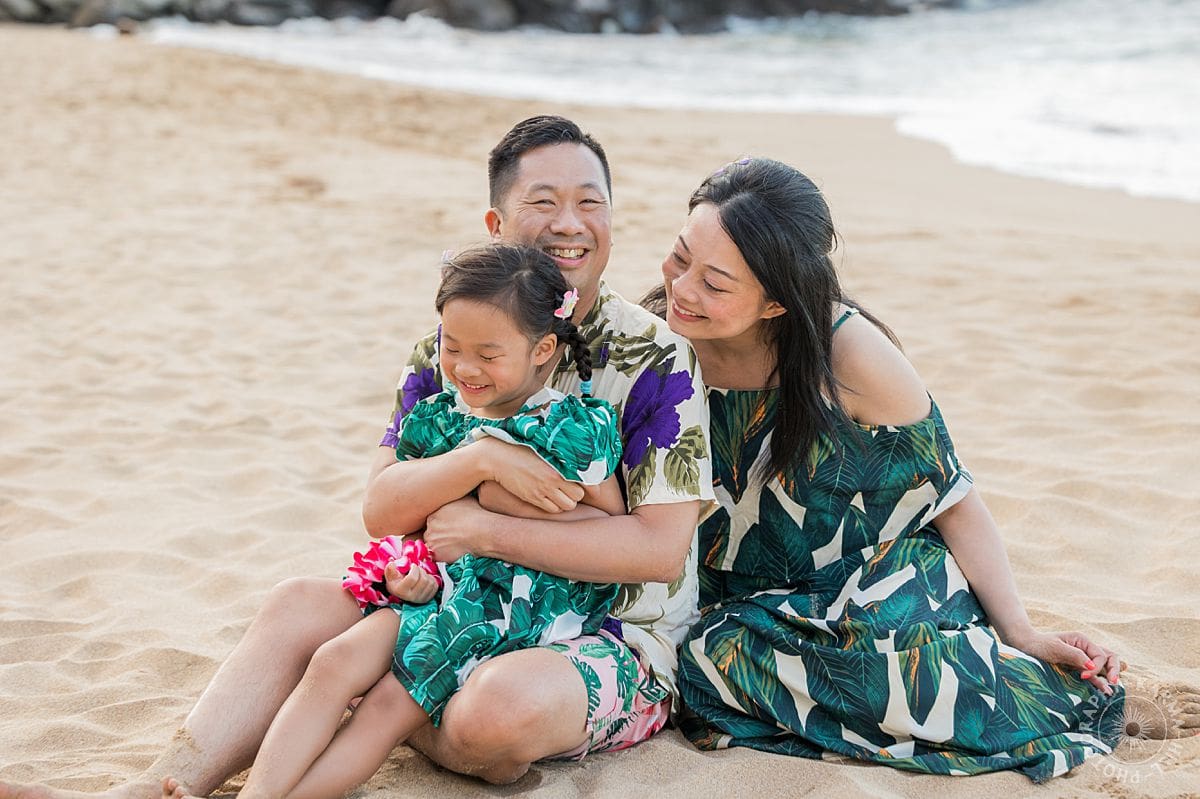 Okay, picture this: The ocean is doing that shimmery thing it does, DT Fleming Beach is serving up soft golden light like it’s its job (spoiler: it kind of is), and the Chan family is absolutely thriving in coordinated aloha prints. That’s the vibe.