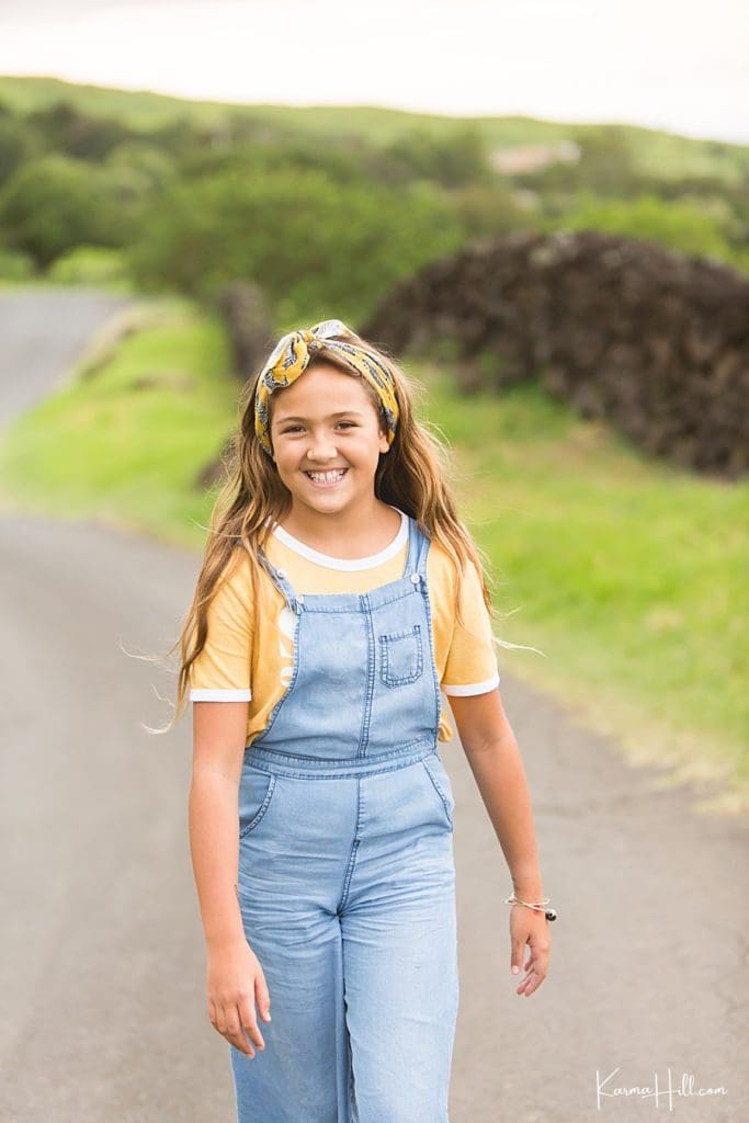 We’re all over the overalls! We love the look Presley brought to her Hawaii family portraits on this sunset evening at Thompson Road. This Upcountry location is a prime spot flooded with vintage feels, so overalls paired with a mustard headband and shirt were the perfect combo! Old Navy has a great selection of overalls, and if you’re looking for inspo for the whole fam, come read our Top 10 Best Dressed Families of 2019 for outstanding outfit examples.