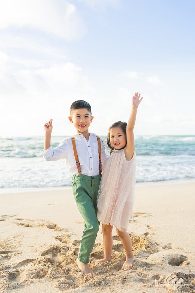We’re green with envy over how stylish these awesome kids are! If your Hawaii family portraits are captured on one of our gorgeous beaches, consider dressing your future-doctors-and-presidents in shades to complement the rich colors of the seascape. And that means more than just the blues! From olive to teal to seafoam, accenting the emeralds of the ocean will liven up your color palette and add a soft touch of unexpected vibrance.
