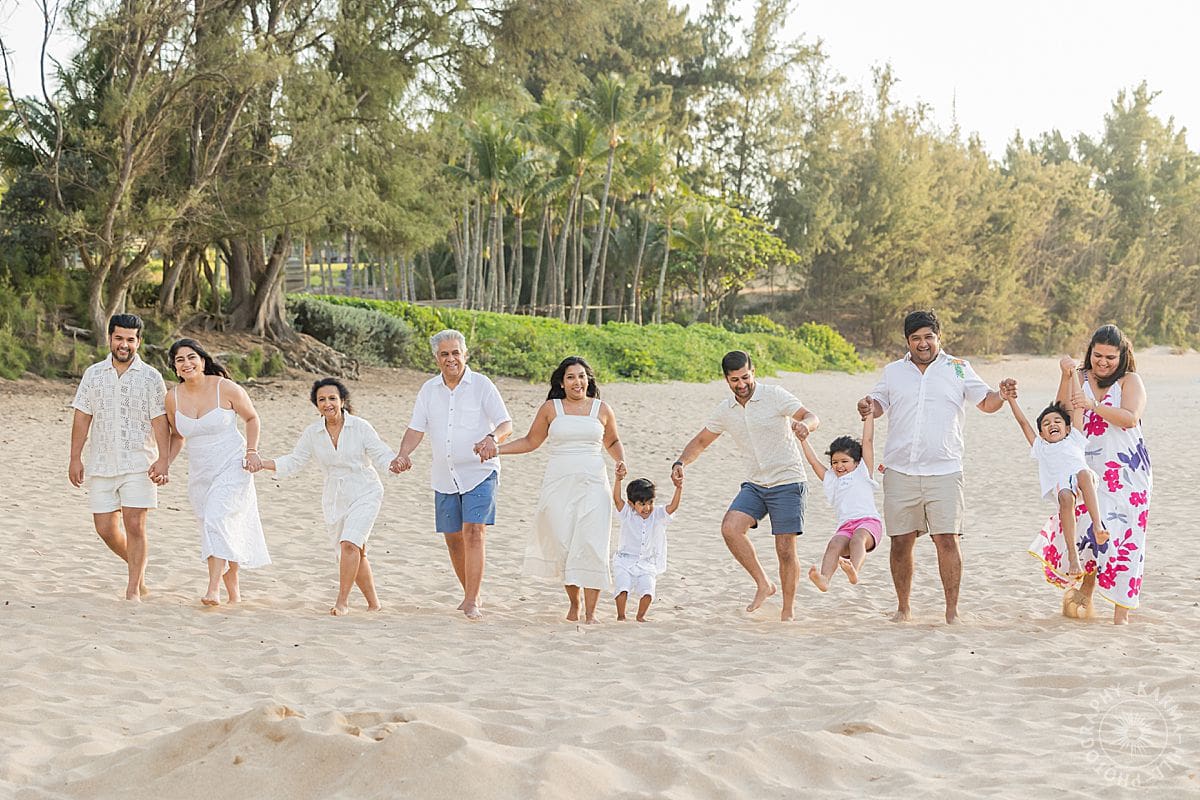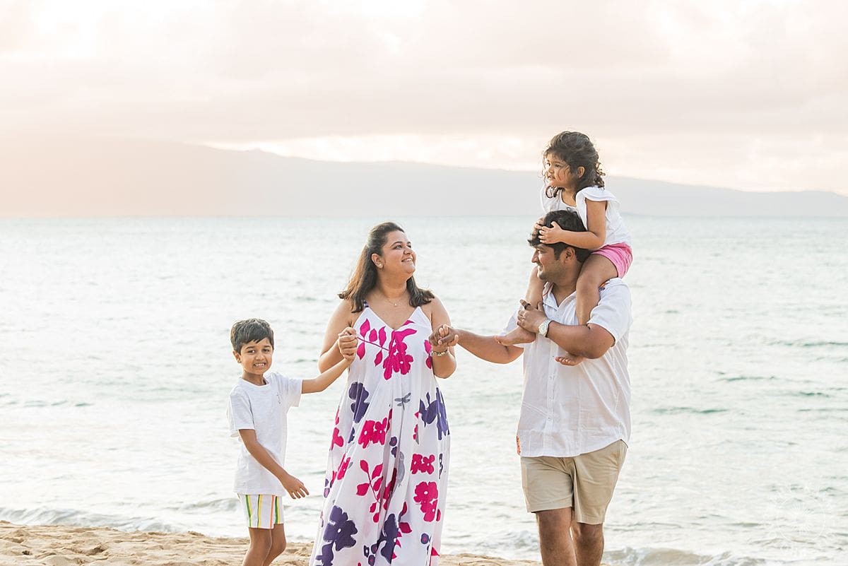 From the grandparents holding hands with their grandkids in the sand, to individual families laughing in that warm Maui light, it was a perfect mix of timeless and joyful. They wore breezy white with vibrant florals that popped against the ocean blue. The kids were full of energy (and excellent stick-collecting skills), and there was this feeling of connection woven through every frame, like, yes, these are our people and we belong together.