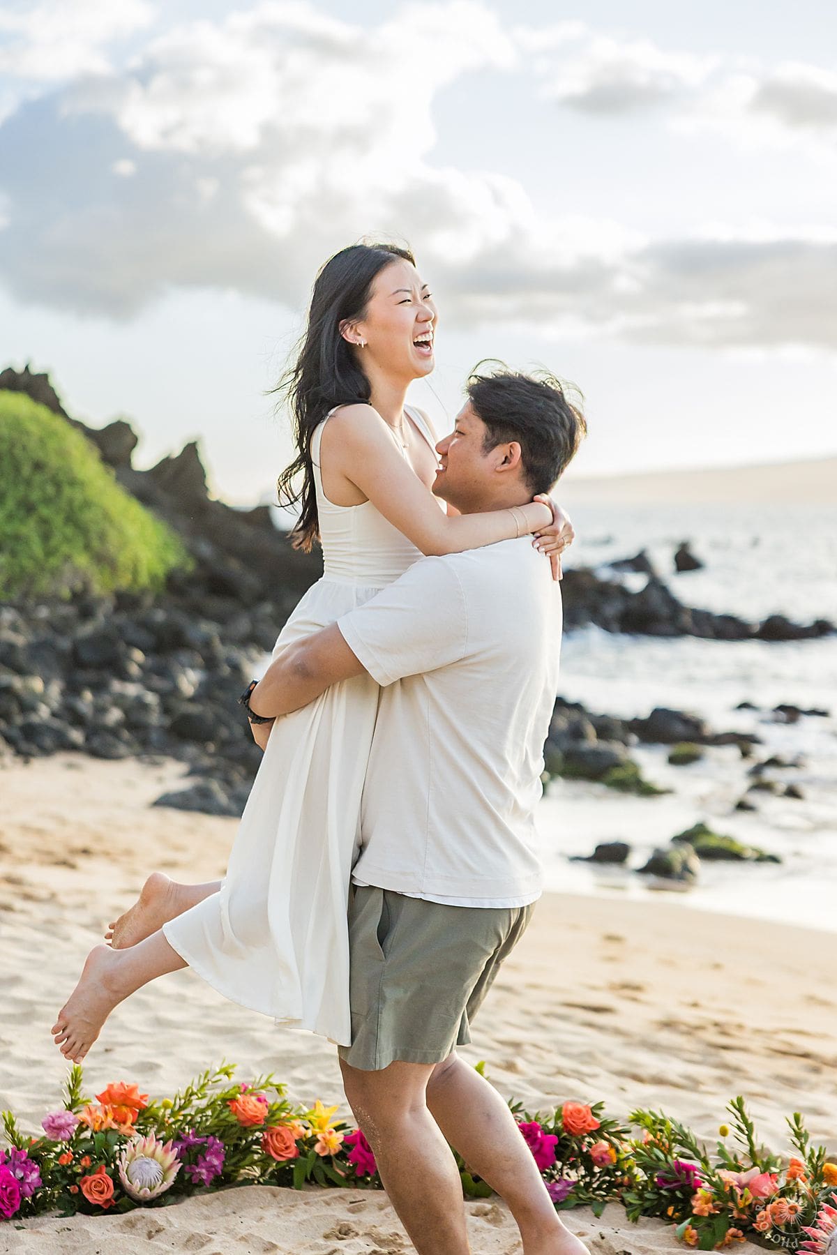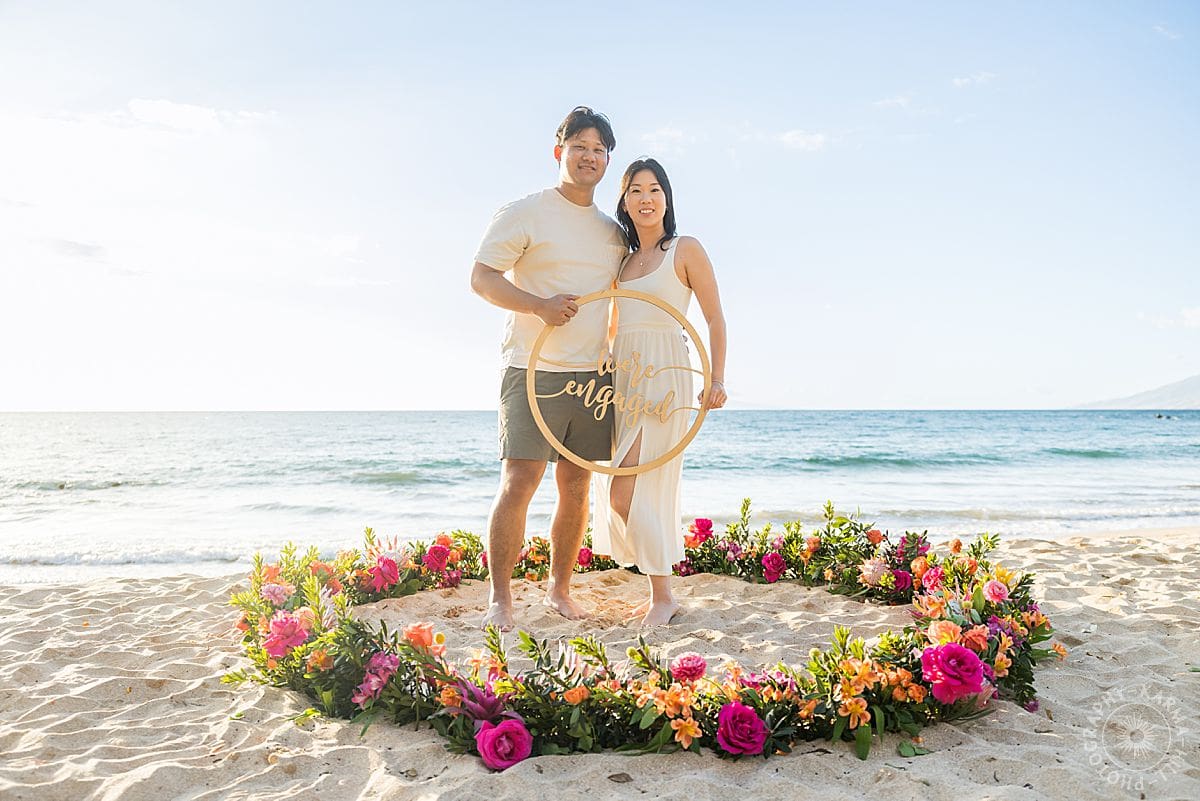 David had been rehearsing this moment, a Maui proposal portrait, in his head for weeks… the words, the timing, the way he’d lead Maria across the sand as if they were simply taking a sunset stroll. But nothing could have prepared him for how perfect it all became at Southside Beach. The soft Maui light wrapped everything in a dreamy, golden glow. He guided her toward a stunning tropical flower circle, vibrant with color. And then, with a breath that held every emotion he’d been saving for this very instant, he dropped to one knee.
