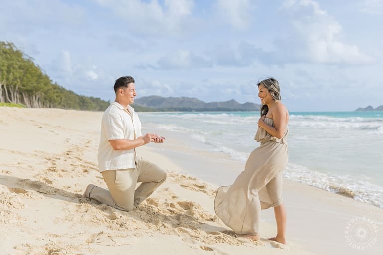 Here is a sweet Oahu proposal portrait for you! Okay, picture this: you’re on a picture-perfect beach in Hawaii, the sand is white and warm beneath your feet, the ocean is the kind of blue that looks like it was filtered by Mother Nature herself, and you’ve been told it’s just a casual portrait session.