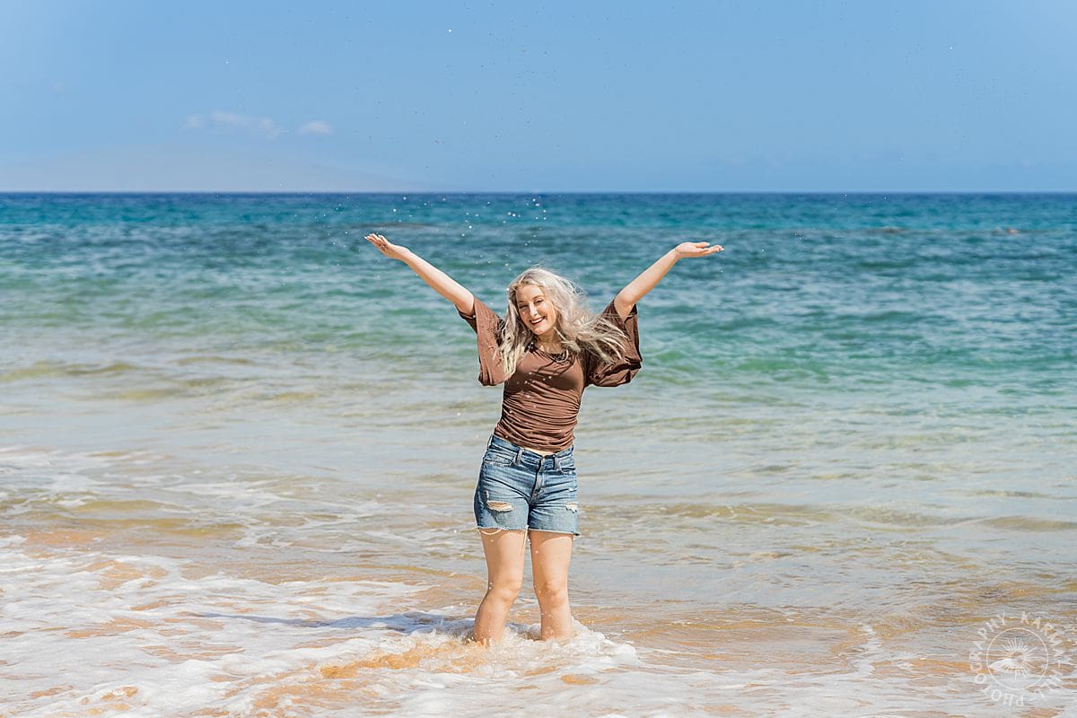 The morning couldn’t have been more perfect for her Maui senior portrait. Bright, vibrant colors everywhere you looked, blue skies that practically hummed, the ocean sparkling like it had been waiting for this exact day, and the lush greenery framing every shot. We started at Polo Beach, where the waves gently curled along the shore, the sun bouncing off the water with that signature Maui vibrancy. Ella looked completely at ease, ready to model, twirl, laugh, and simply enjoy the moment.