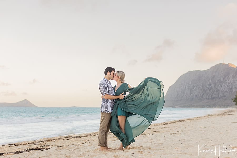 Setting the scene for these photos was Waimanalo Beach. Our stunning couple couldn’t have chosen a better location or time for their session because their backdrop was breathtaking! Striking mountains, ivory sand, and foamy azure waves decorate the background magically.