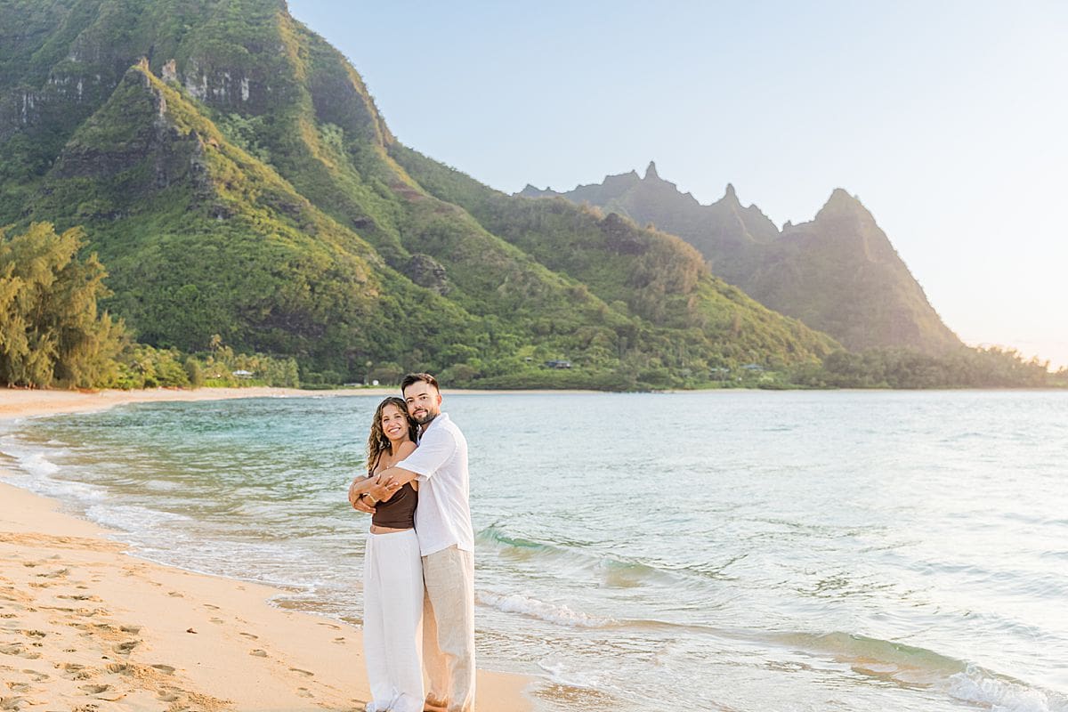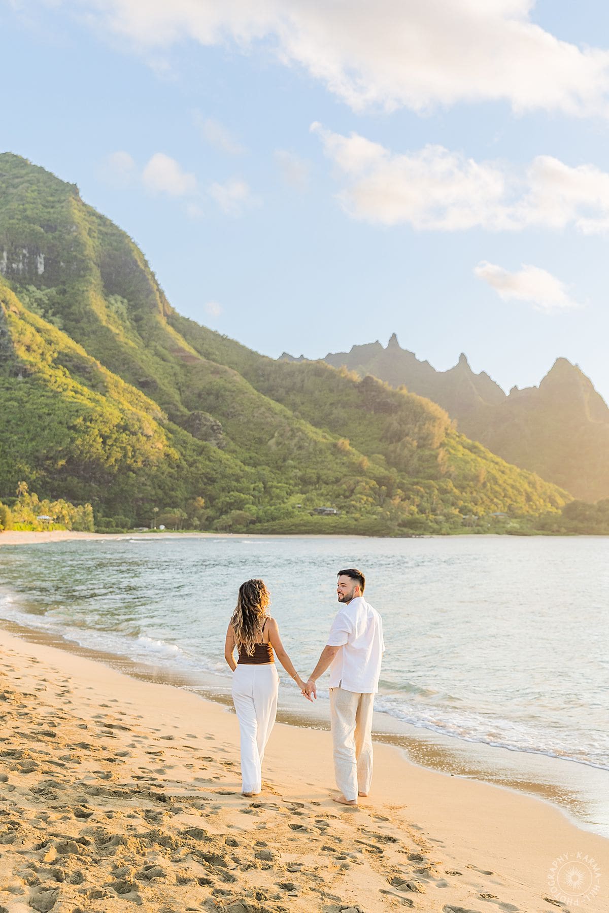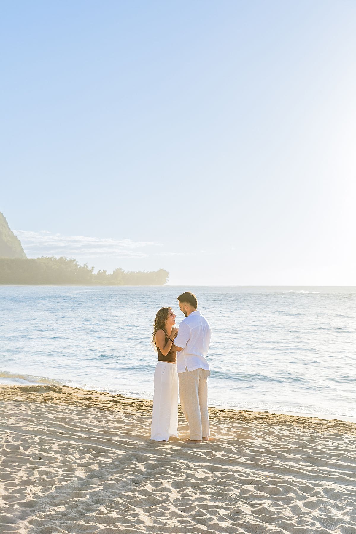 And then just as the golden light started to spill across the beach, making everything glow, Eric stopped, turned to her, and dropped to one knee. The timing was impeccable. The light hit, the waves hushed (or maybe that’s just how it felt), and in the background, the ridges of Tunnels stood proud and green, their peaks brushed with gold.