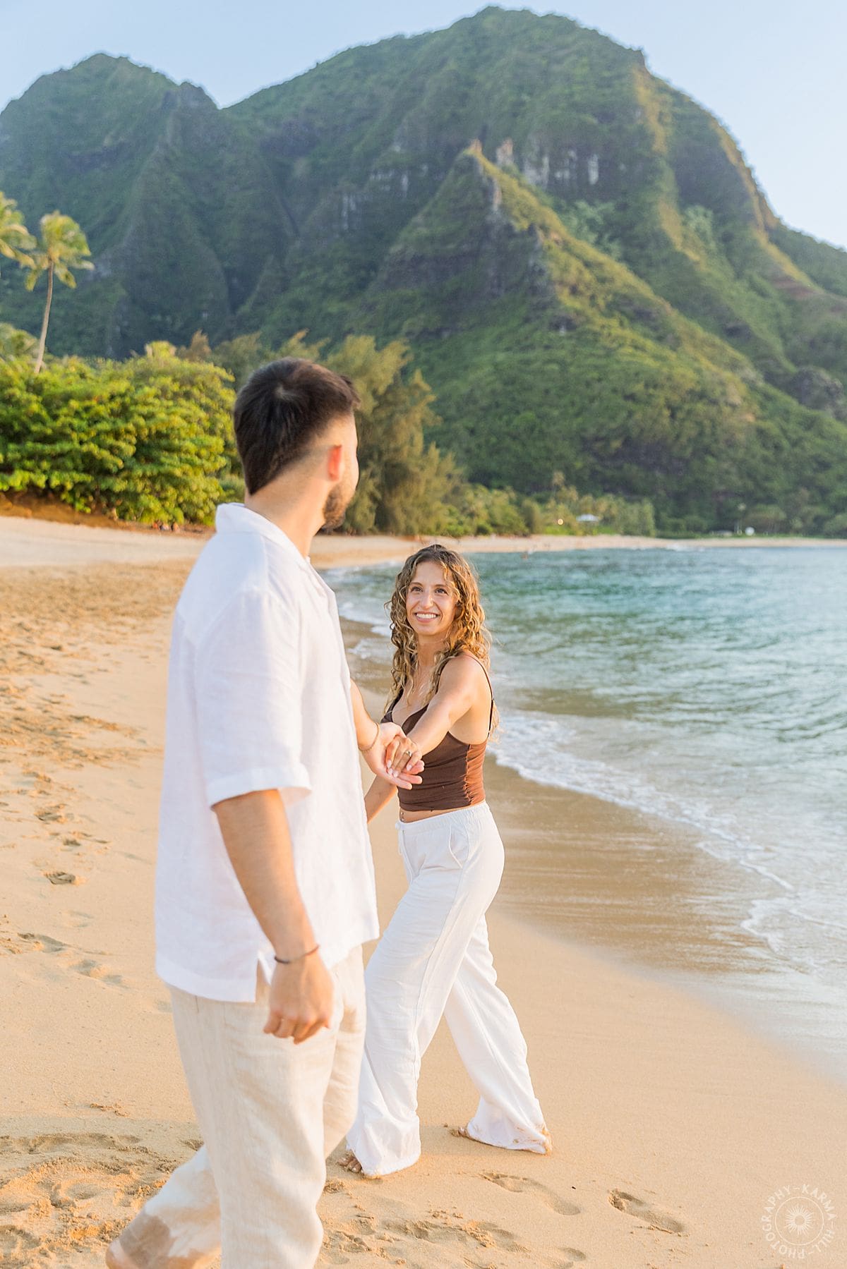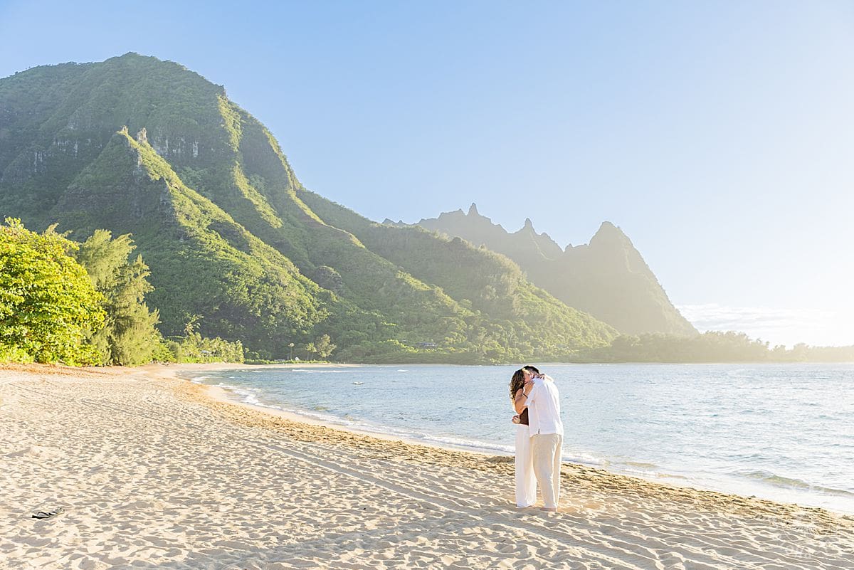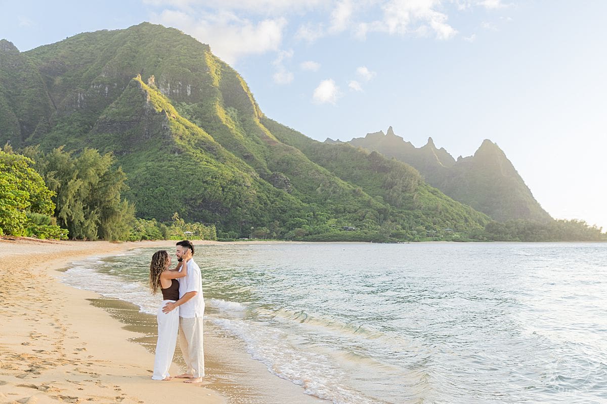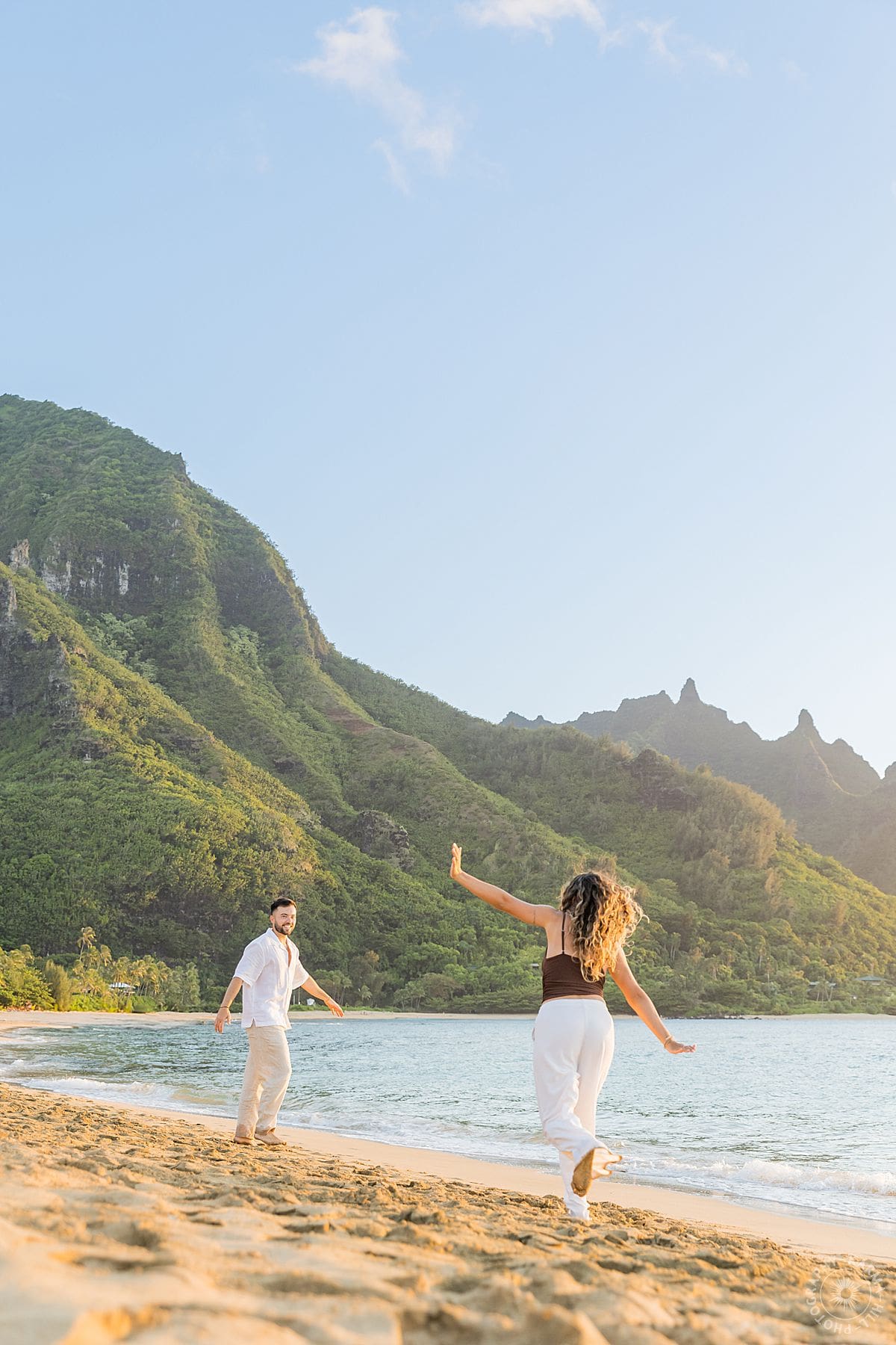 Eric had a plan, and it was a good one. Our photographer went full stealth: ninja-style hiding in plain sight with a long lens, blending into the scene as if simply photographing the coastline. Carla had no idea what was coming. She and Eric strolled along the sand, the ocean stretching endlessly on one side, the dramatic emerald mountains of Kauai towering on the other…