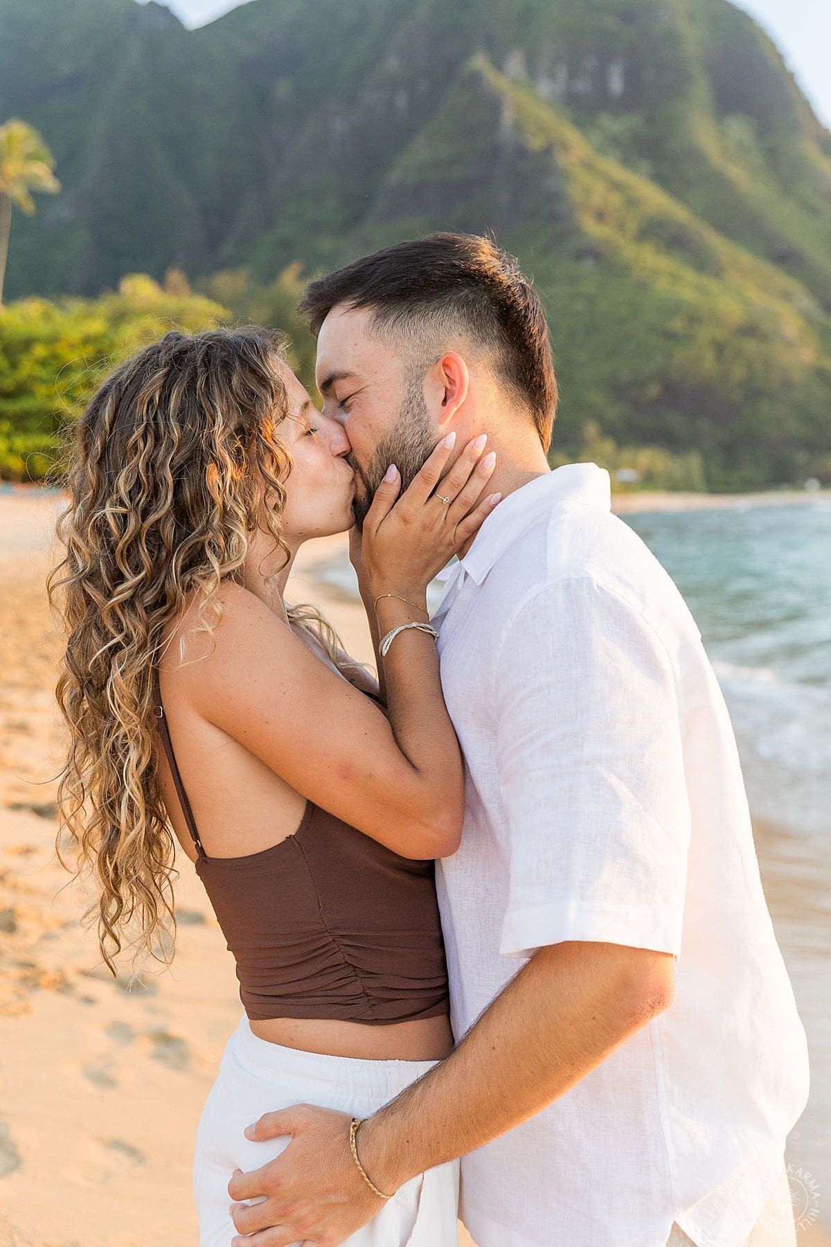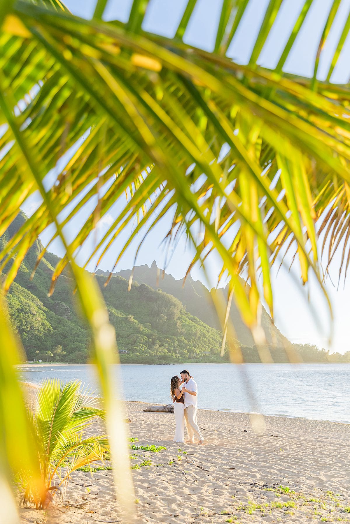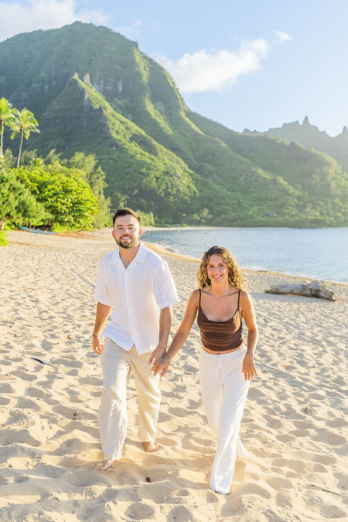 Eric had a plan, and it was a good one. Our photographer went full stealth: ninja-style hiding in plain sight with a long lens, blending into the scene as if simply photographing the coastline. Carla had no idea what was coming. She and Eric strolled along the sand, the ocean stretching endlessly on one side, the dramatic emerald mountains of Kauai towering on the other…