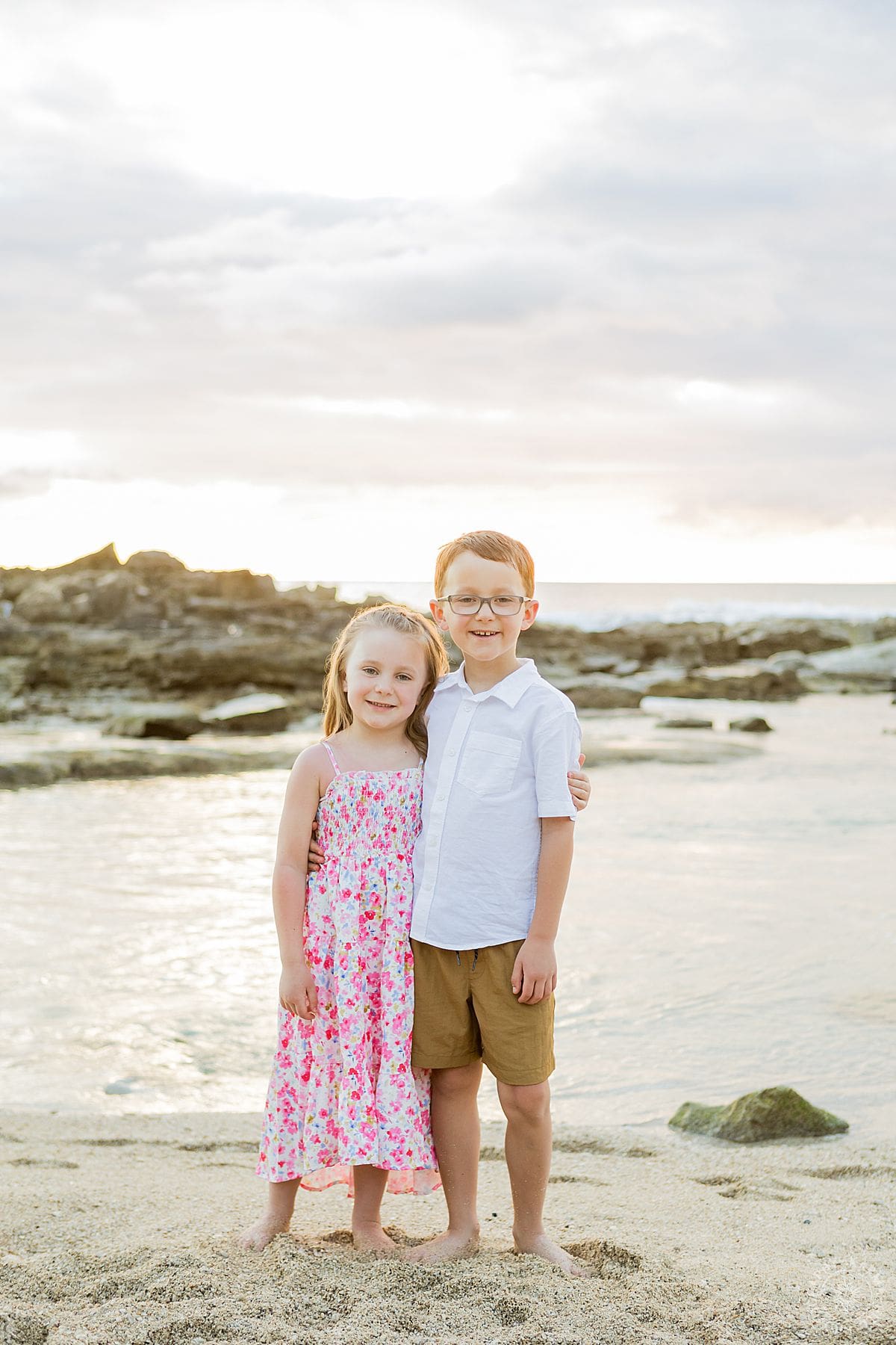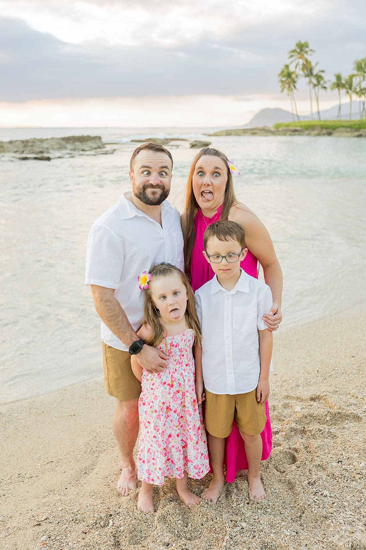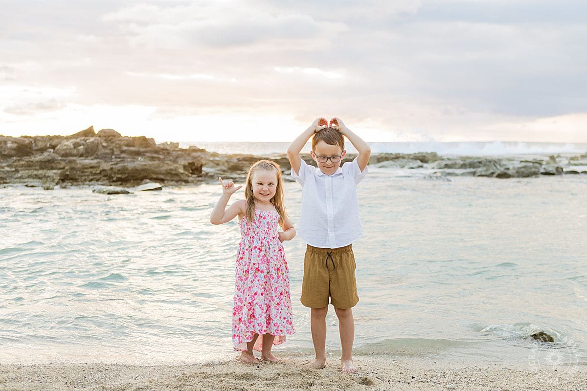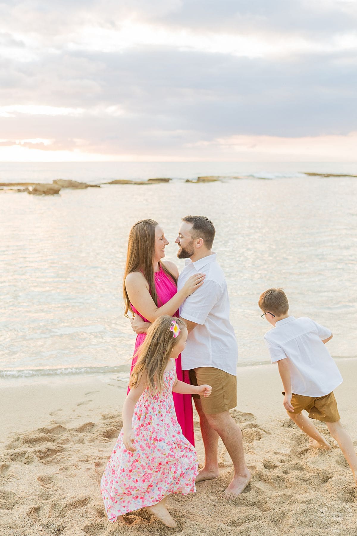 Michelle was all in on capturing it all in their Oahu family portrait—mom and kiddos, dad and kiddos, siblings bonding (or playfully bickering, let’s be real), and even a few sweet, just-the-two-of-them anniversary shots. The joy was palpable. The kids played, the parents laughed, and the ocean did its sparkly, cinematic thing. They clearly had so much fun playing and pulling silly faces!
