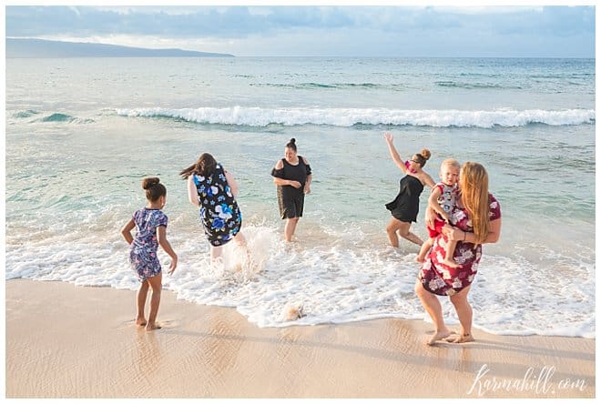 We are honored to have captured four generations in these Maui Family Portraits! With it being their first time to Maui, they were all in a celebratory mood. We loved watching them interact with each other, and express their unique personalities. How sweet are these four sisters? They are an exciting group that’s for sure! From jumping in the sand to splashing in the water, this evening was packed full of fun for all! Sweet Carter loved playing with his mom, aunties, grandma, and great grandma! He is the love of their lives. There is not a question in our minds that with these strong, loving, confident, role models in his life he will grow into a man any family would be proud of! We can only imagine how special this great grandma felt, watching her daughter and grand daughters with her great grandson on this magical Maui night.