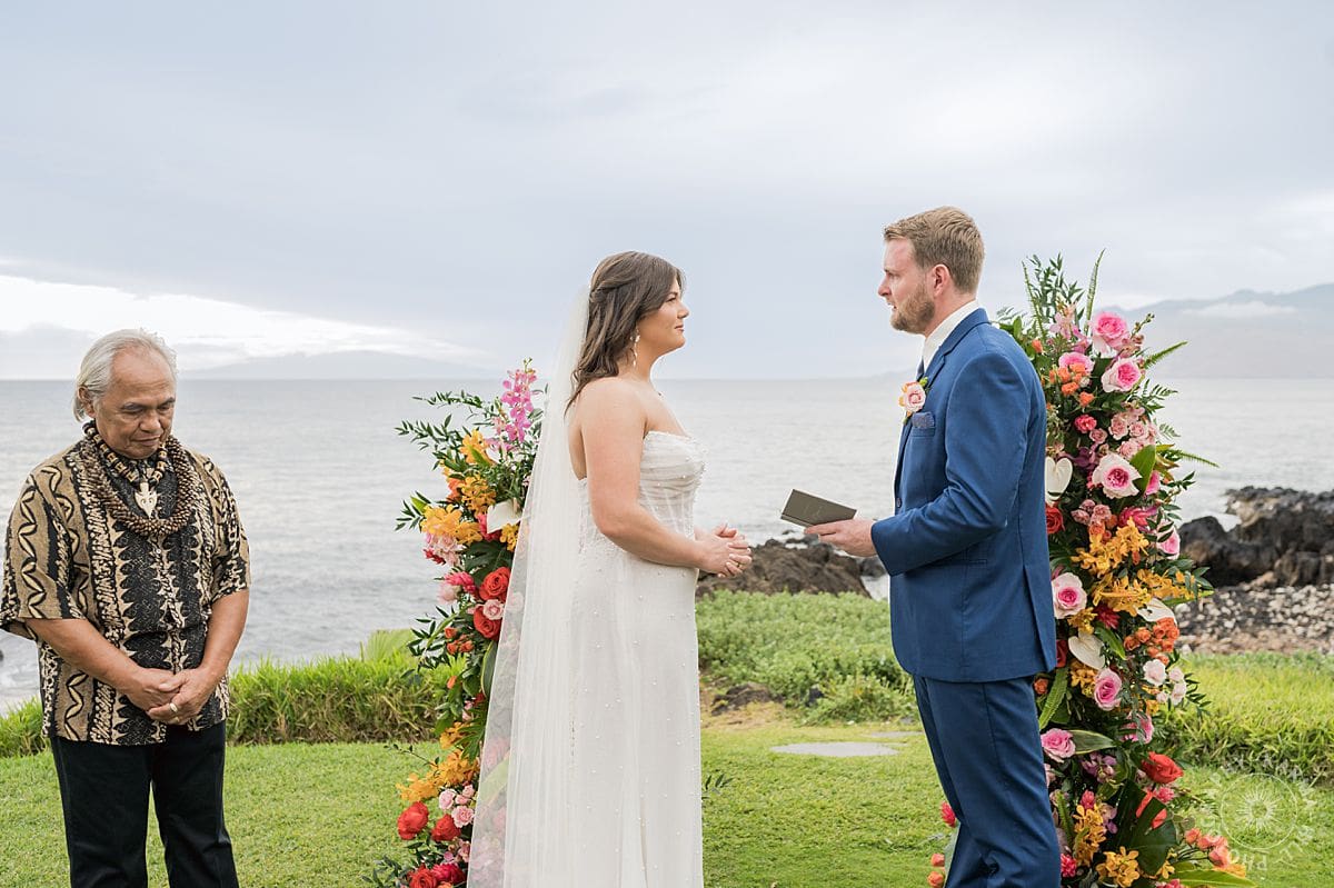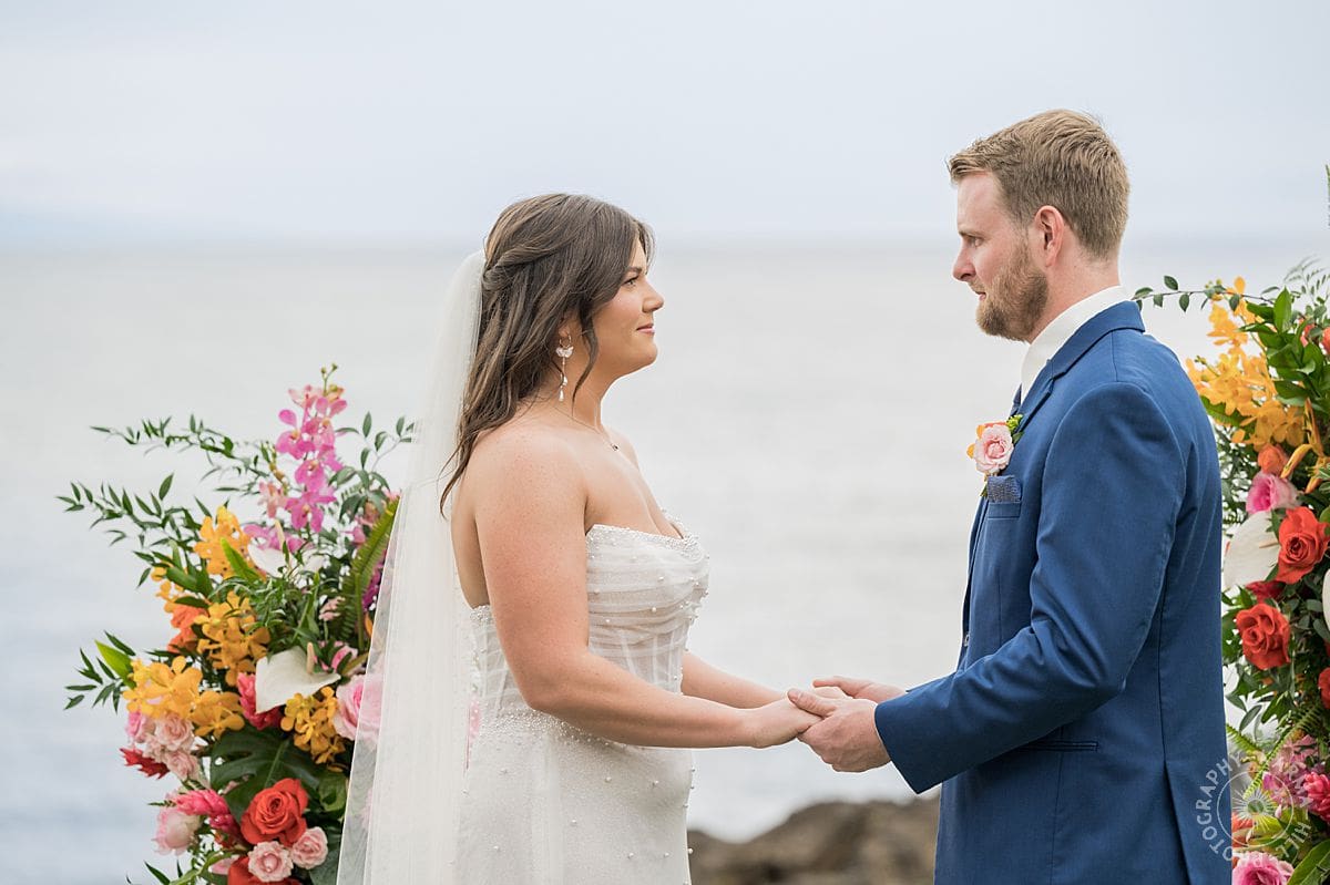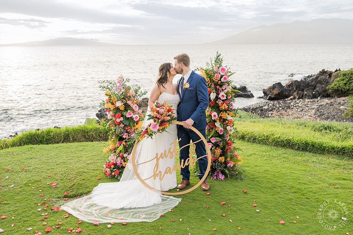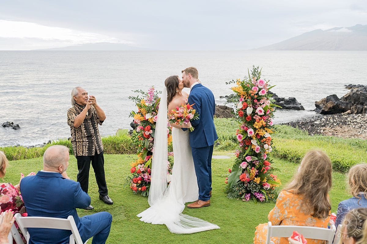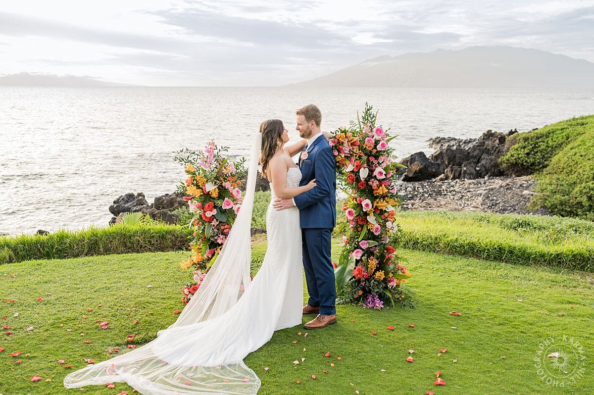The setup? Unbelievable. Towering floral arrangements bursting with bright, tropical colors framed their ceremony perfectly. The view of the Pacific stretched out behind like Maui itself was staging the perfect moment just for them. The vibrant floral colors make their wedding photography come alive!