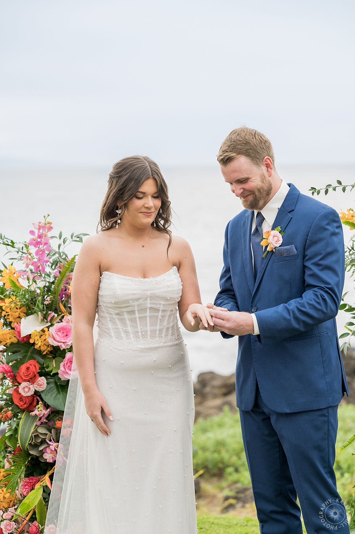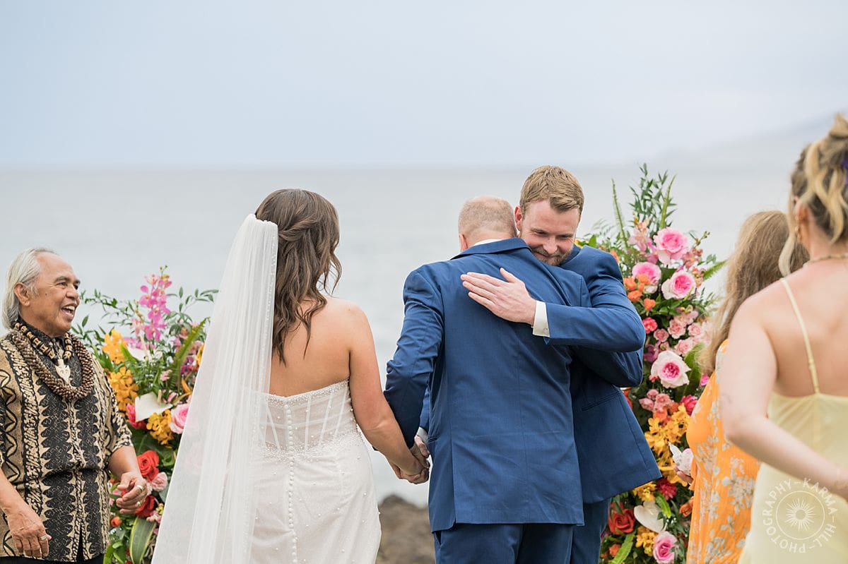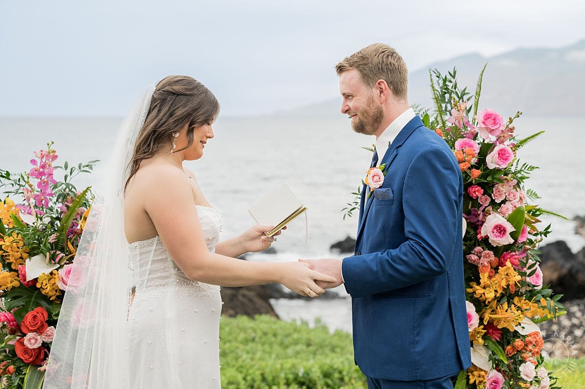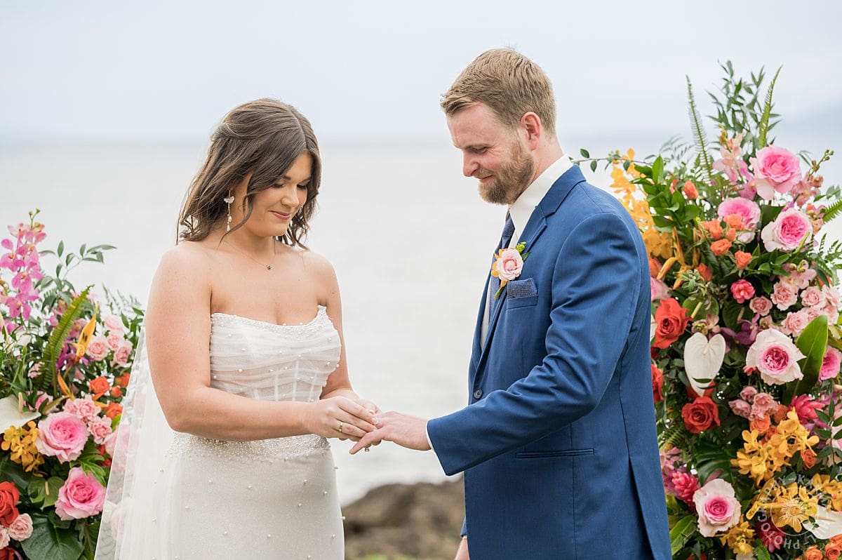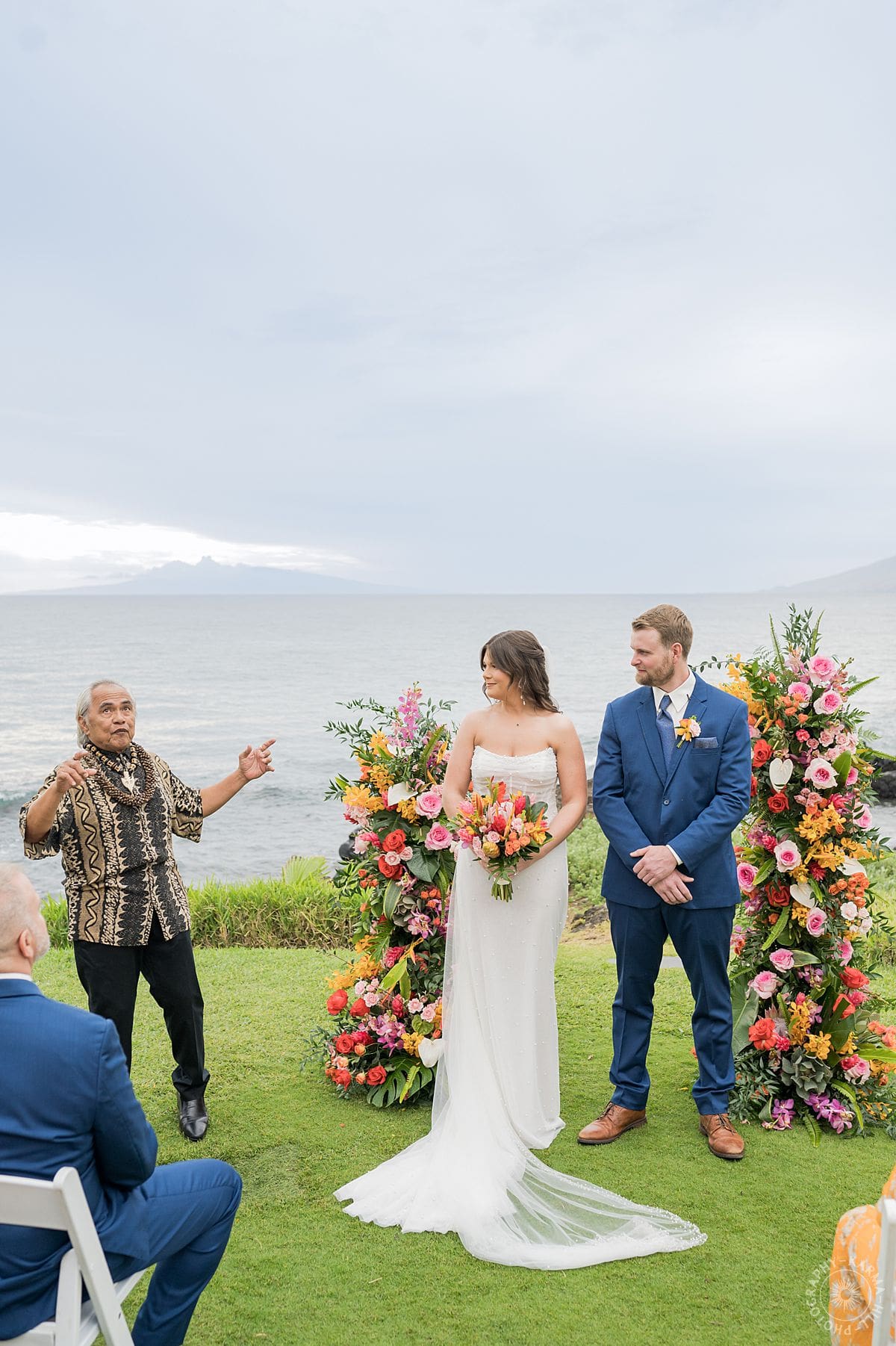 The setup? Unbelievable. Towering floral arrangements bursting with bright, tropical colors framed their ceremony perfectly. The view of the Pacific stretched out behind like Maui itself was staging the perfect moment just for them. The vibrant floral colors make their wedding photography come alive!