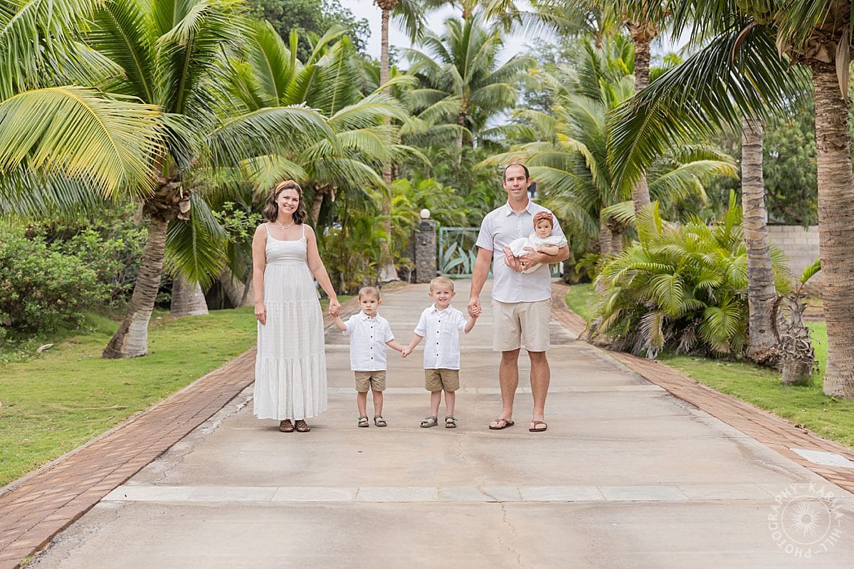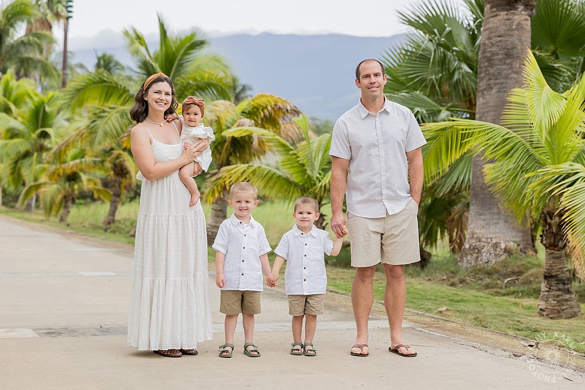 What made this session especially meaningful was the history. We photographed their wedding here in Maui, back when it was just the two of them dreaming about the future. To stand in a similar place years later, surrounded by the little humans who now make up that dream, felt incredibly special. Hawaii has quietly witnessed their story unfolding, chapter by chapter. The palm trees at St. Theresa’s Church added that perfect tropical and nostalgic touch to their Maui family portrait! (It’s where they were married, too!)