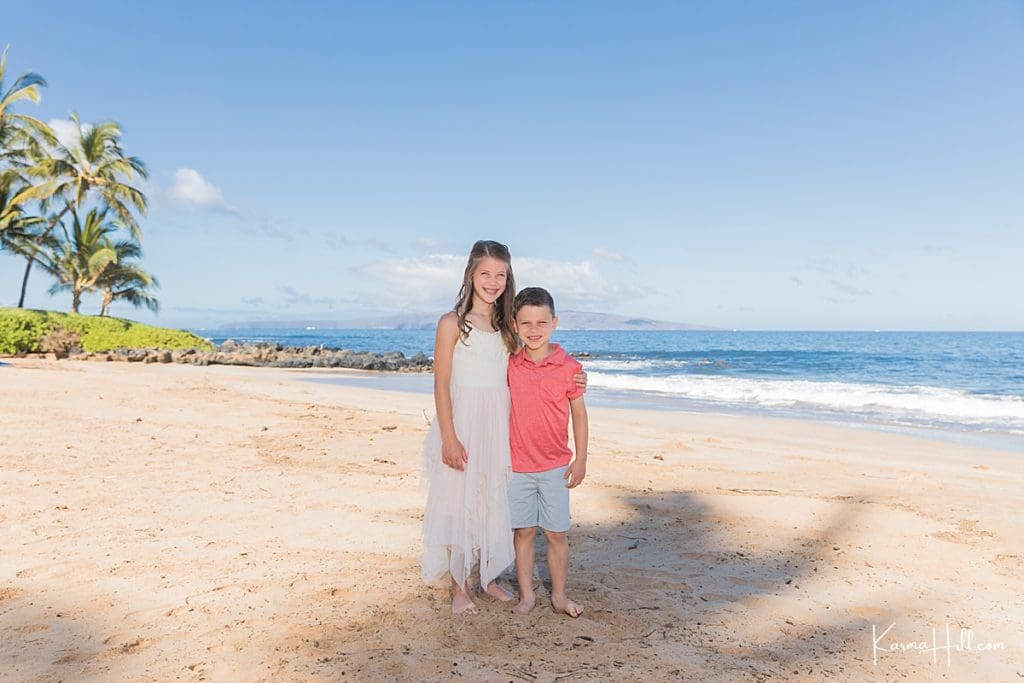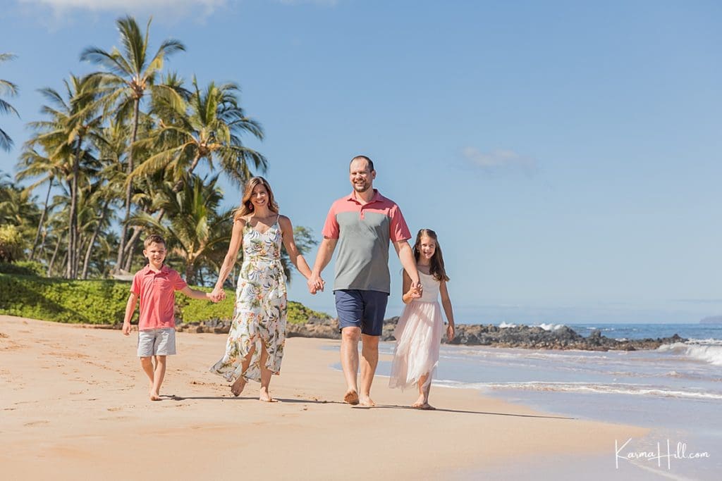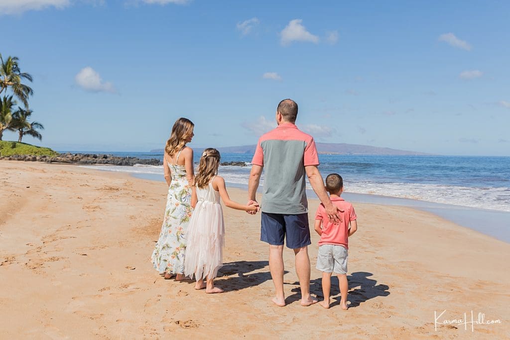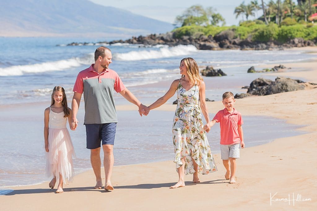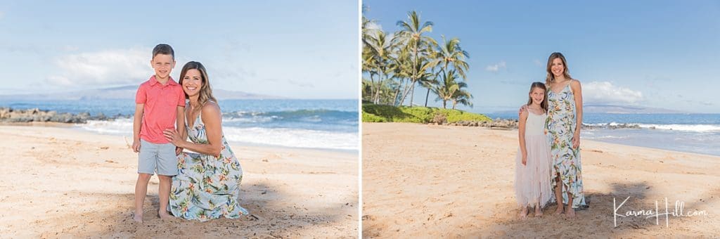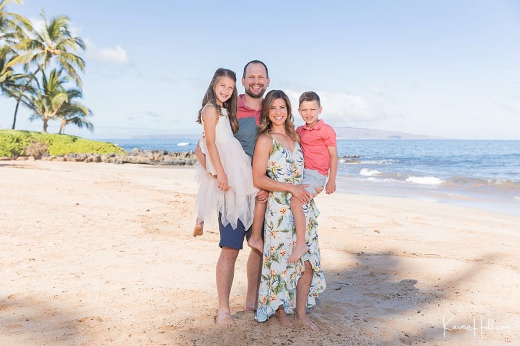 Our session took place on the white sands of Polo Beach. Located in the heart of Wailea, this gorgeous shoreline features swaying palms and sweeping views of the west side. Coordinated in coral, blush, and pops of florals, the Jablonskis looked right at home against the beauty of the island.