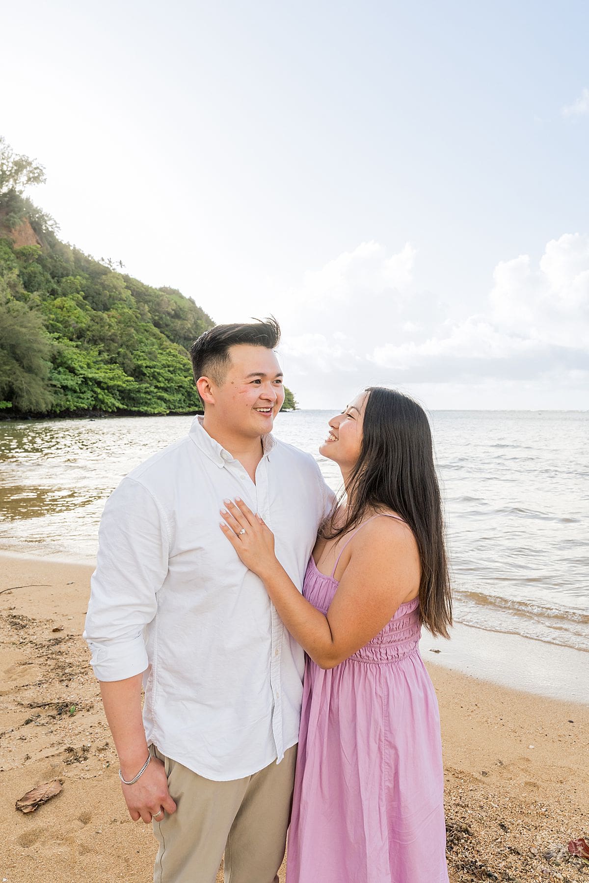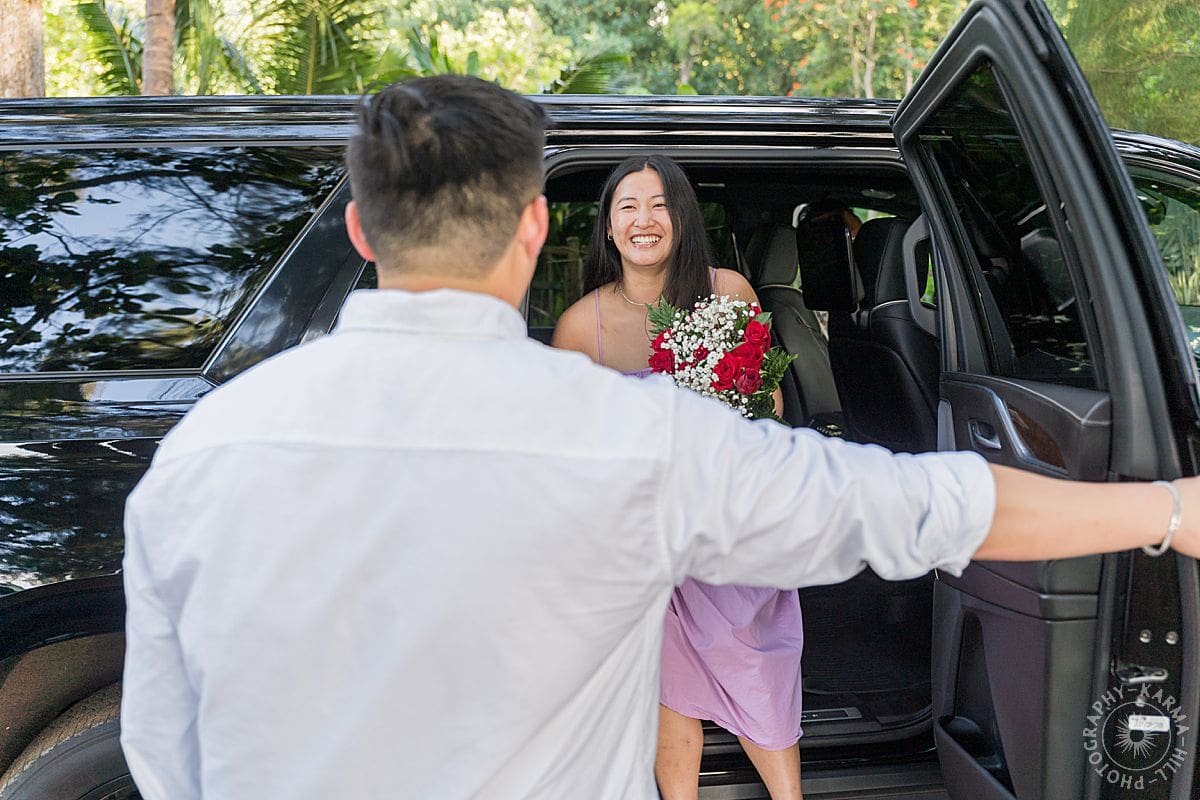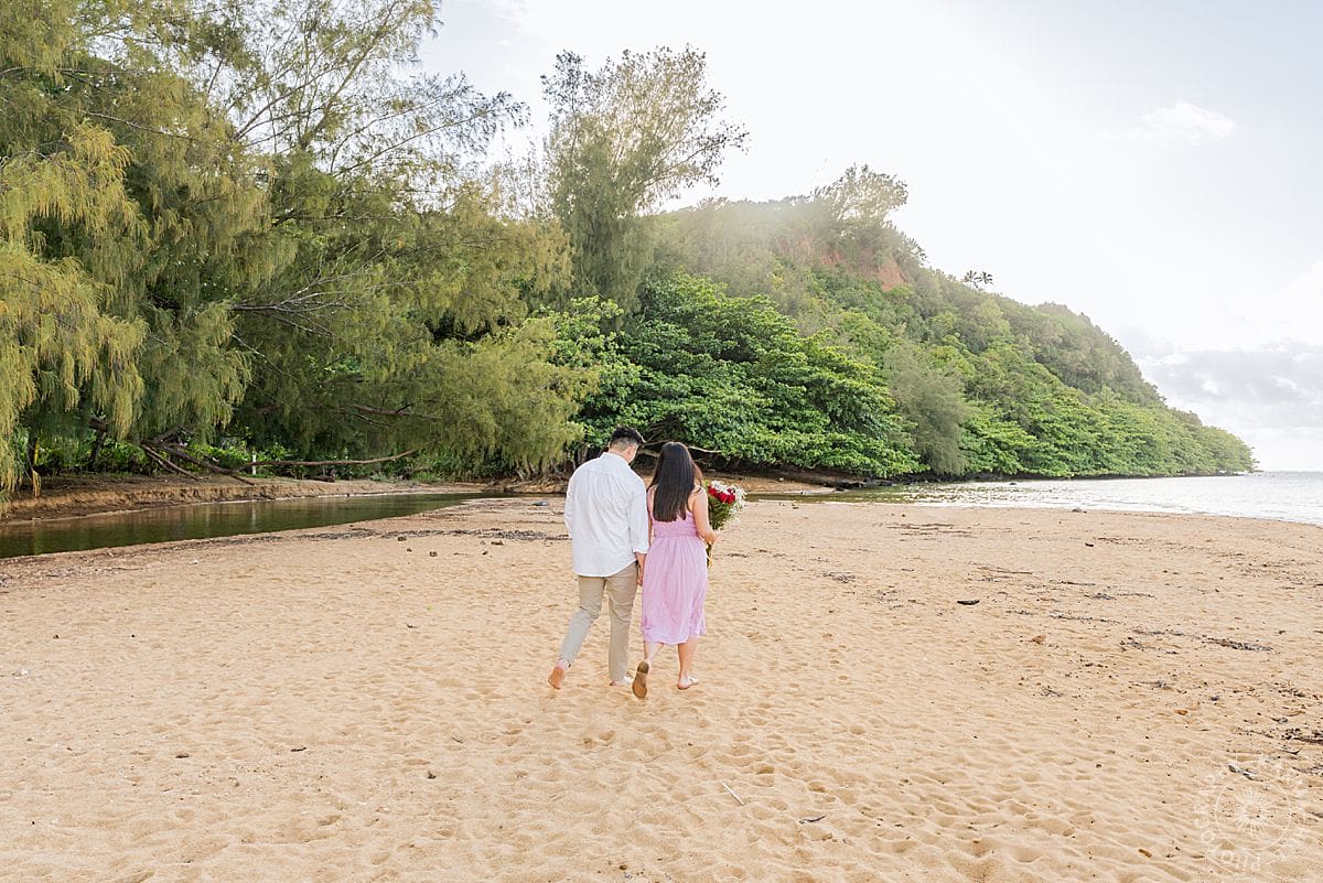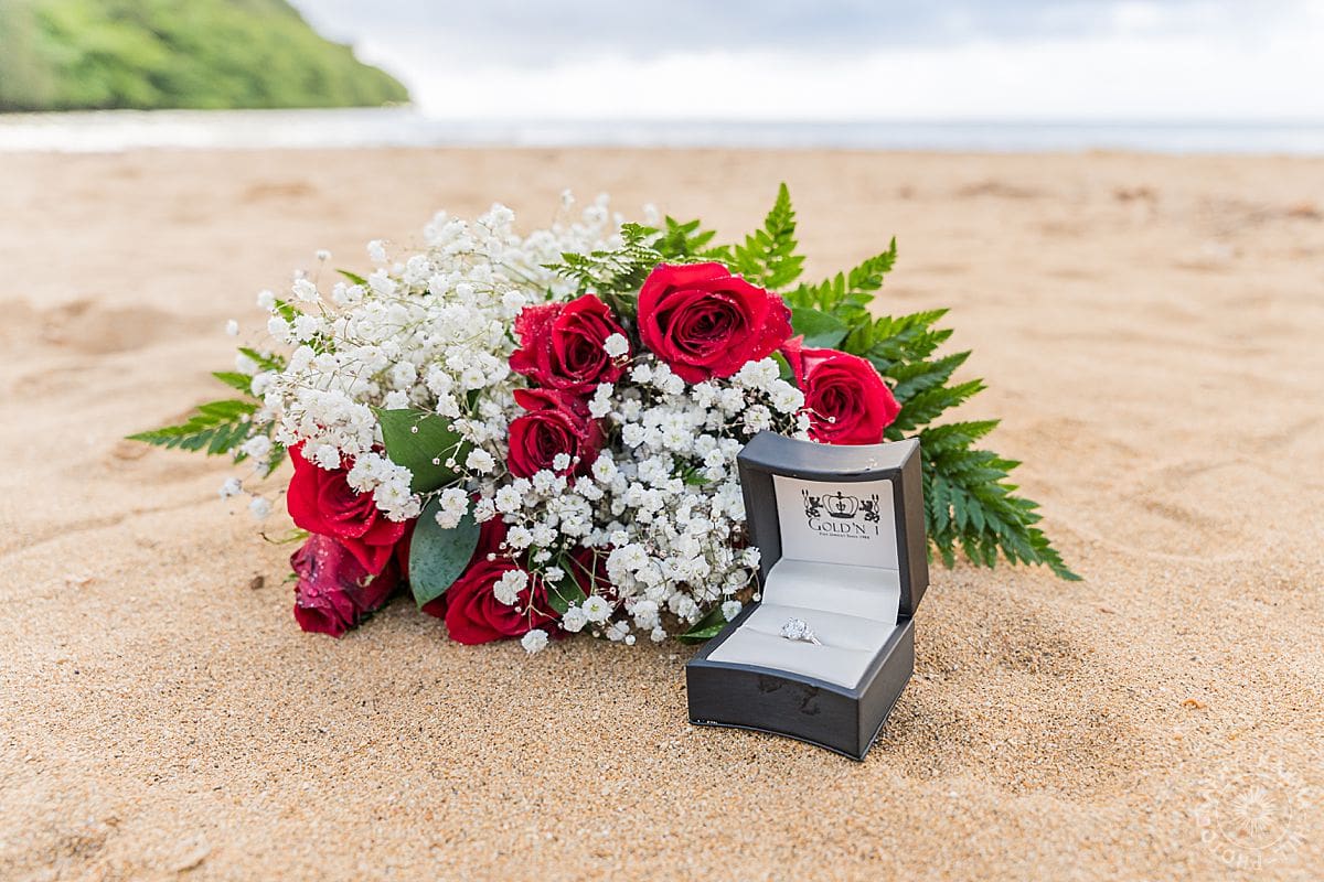 He’d orchestrated the whole thing with the precision of a man who knows his partner inside and out. A car to take her to the beach, check. (She had an inkling of what might be happening.) A bouquet of red roses (classic, elegant, heart-melting), check. A location that whispered peace and intimacy, Anini Beach, with its calm waters and soft light filtering through trees—check, check, check.