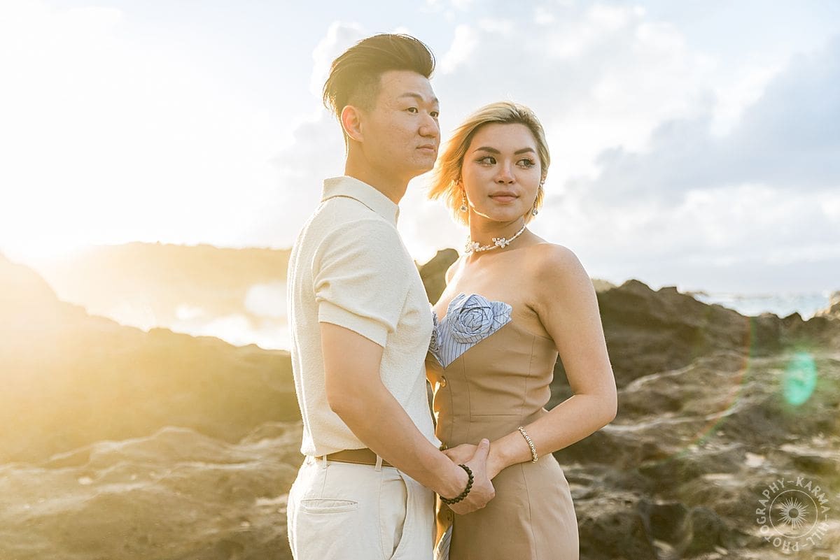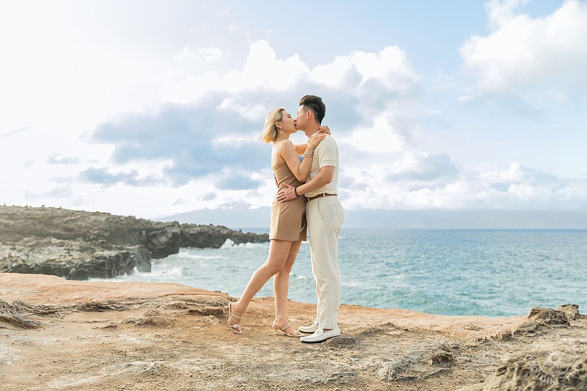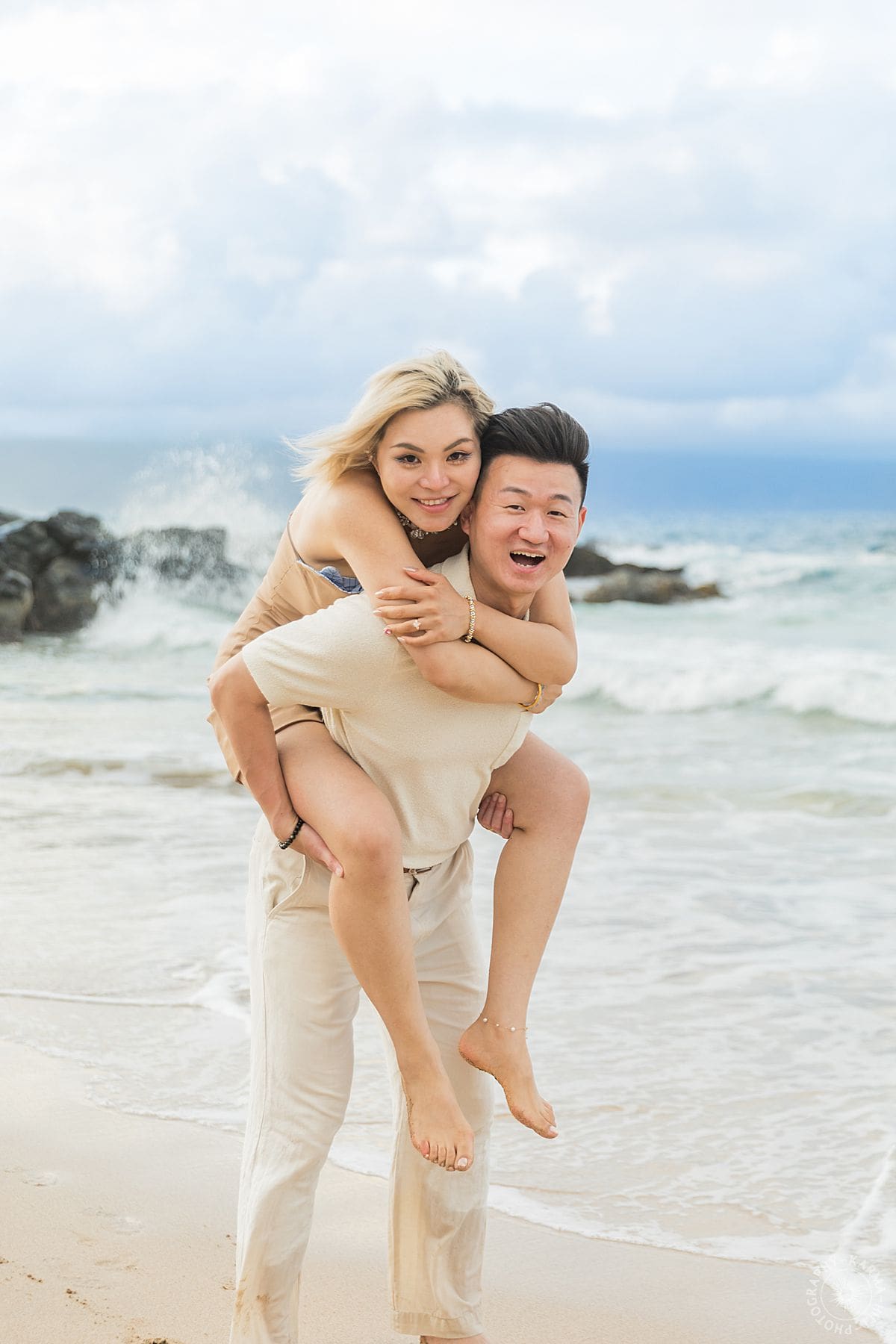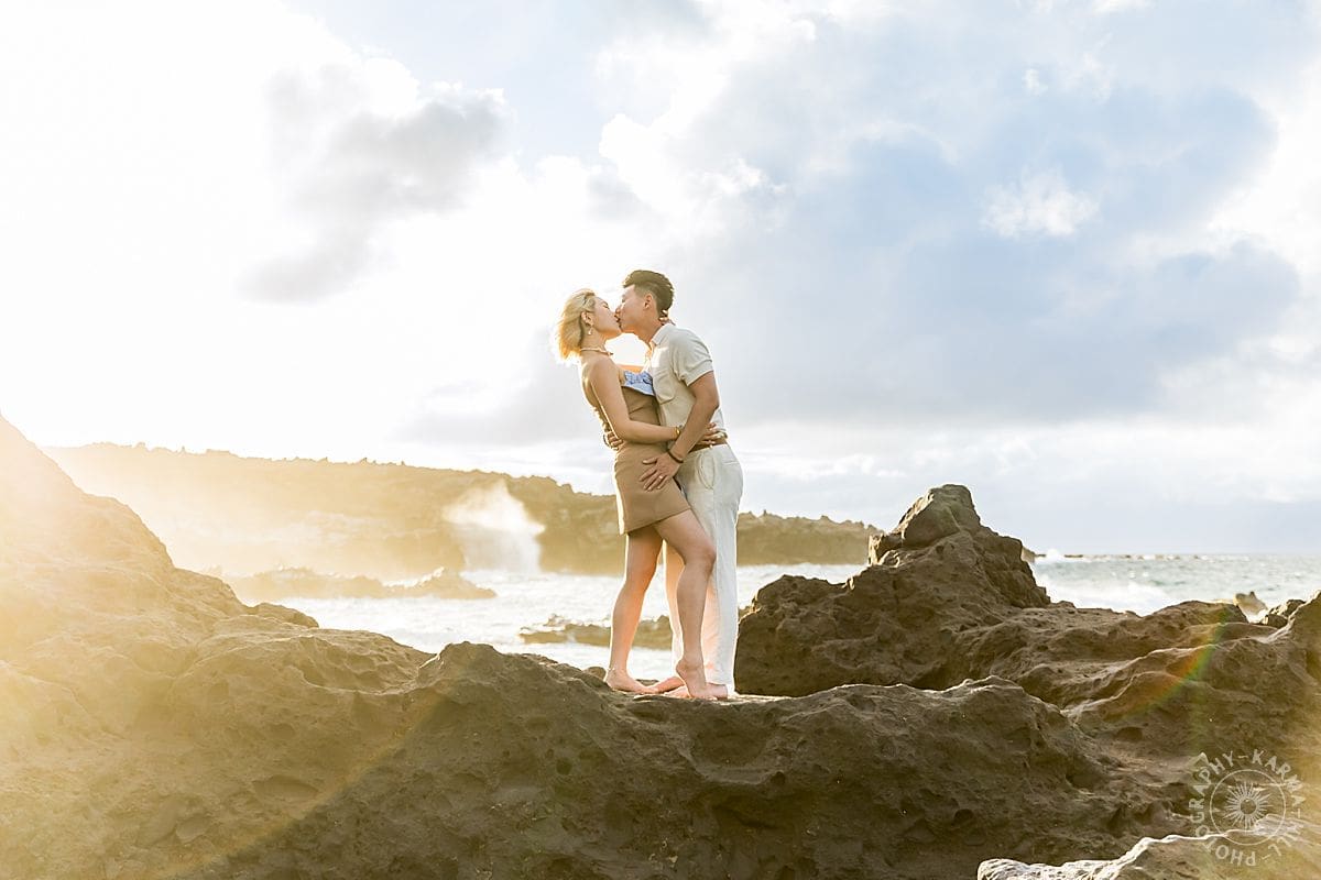 After the proposal, we captured stunning portraits around Ironwoods, warm light spilling over lava rocks, the waves glowing with sunset reflections, and the dramatic waves crashing on the rocks. It made for such epic and gorgeous portraits! Our Maui proposal photography style focuses on natural emotion and connection, and Kaiyi and Echo embodied both effortlessly. And Maui? Maui always does what it does best for epic moments like this!