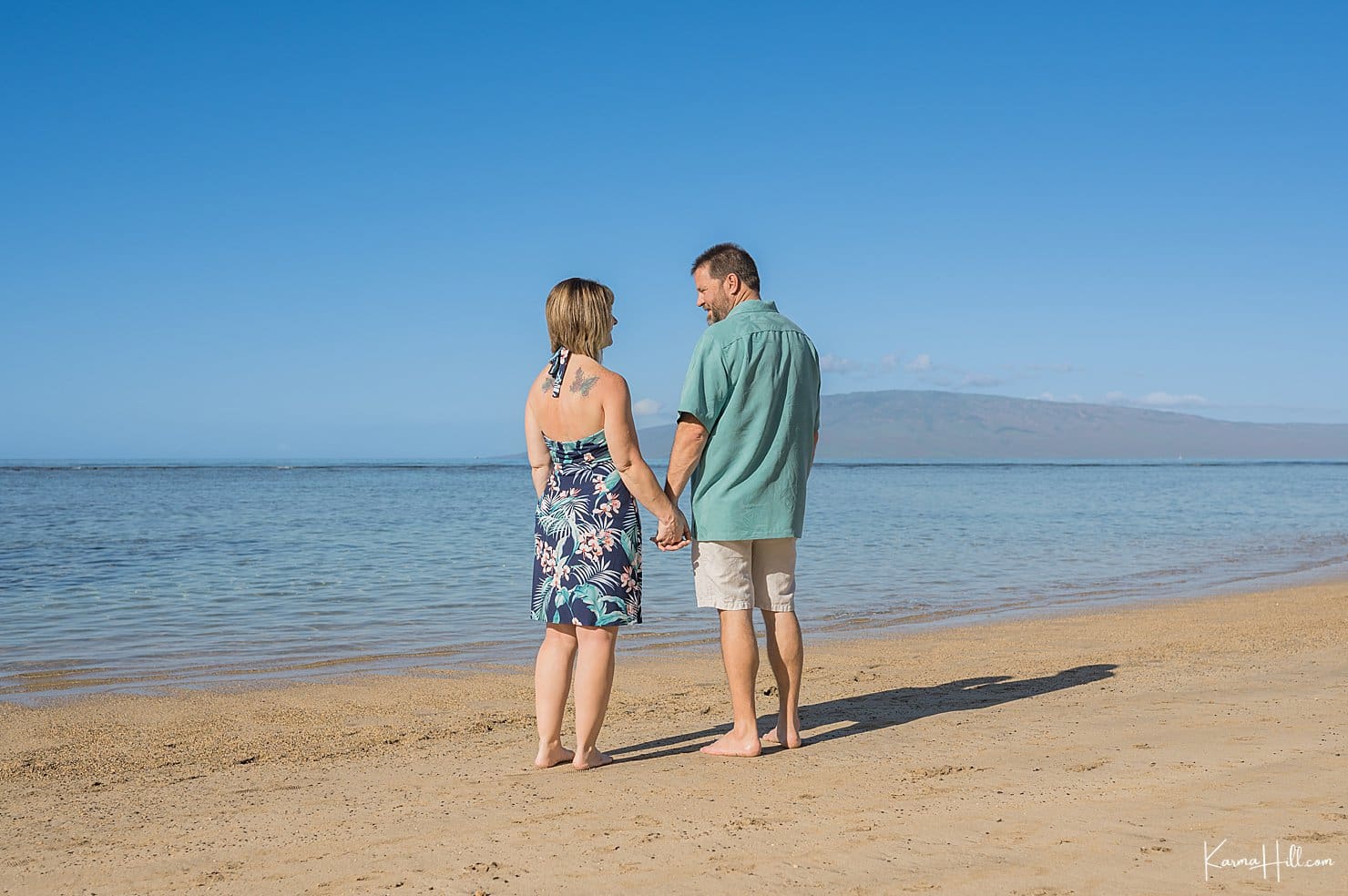 Maui holds a special place in their hearts; they love its relaxed and beachy lifestyle. It’s no wonder why they return time and time again! We were delighted to capture these love birds in the golden sunshine at Baby Beach in Lahaina. The water was incredibly calm, with hardly any clouds in the sky! Most Maui mornings are very bright, making the most vibrant and colorful photos for a Maui couples portrait like these! Our sweet pair have two adult children and savor their quality time and making the most of it just the two of them. Nothing quite says marriage bliss like a stroll down a gorgeous beach!