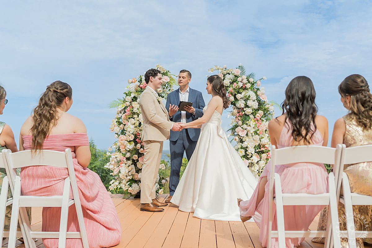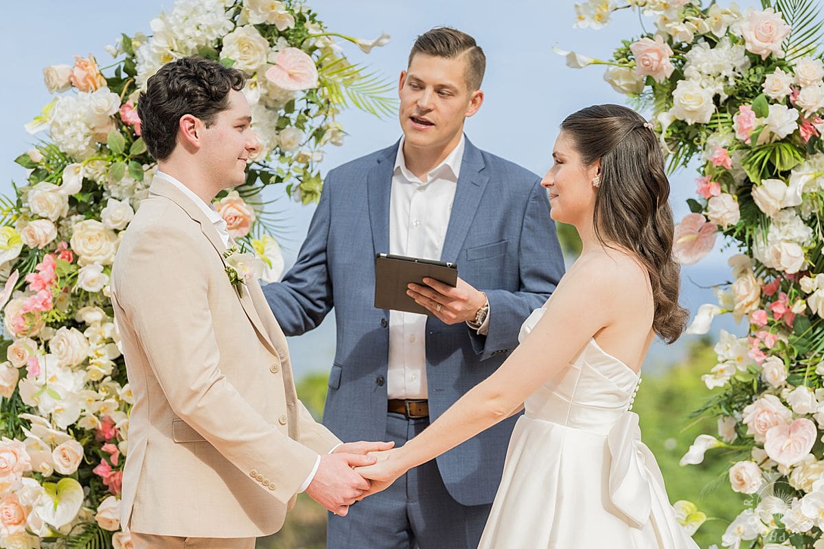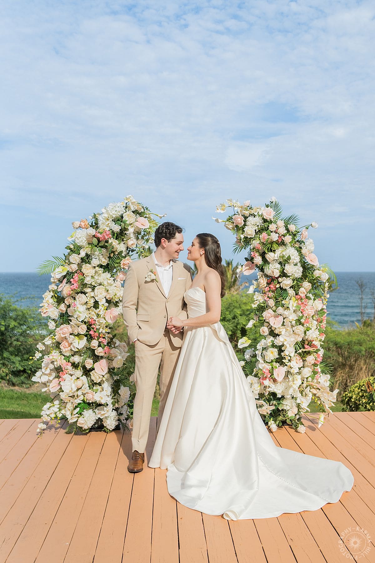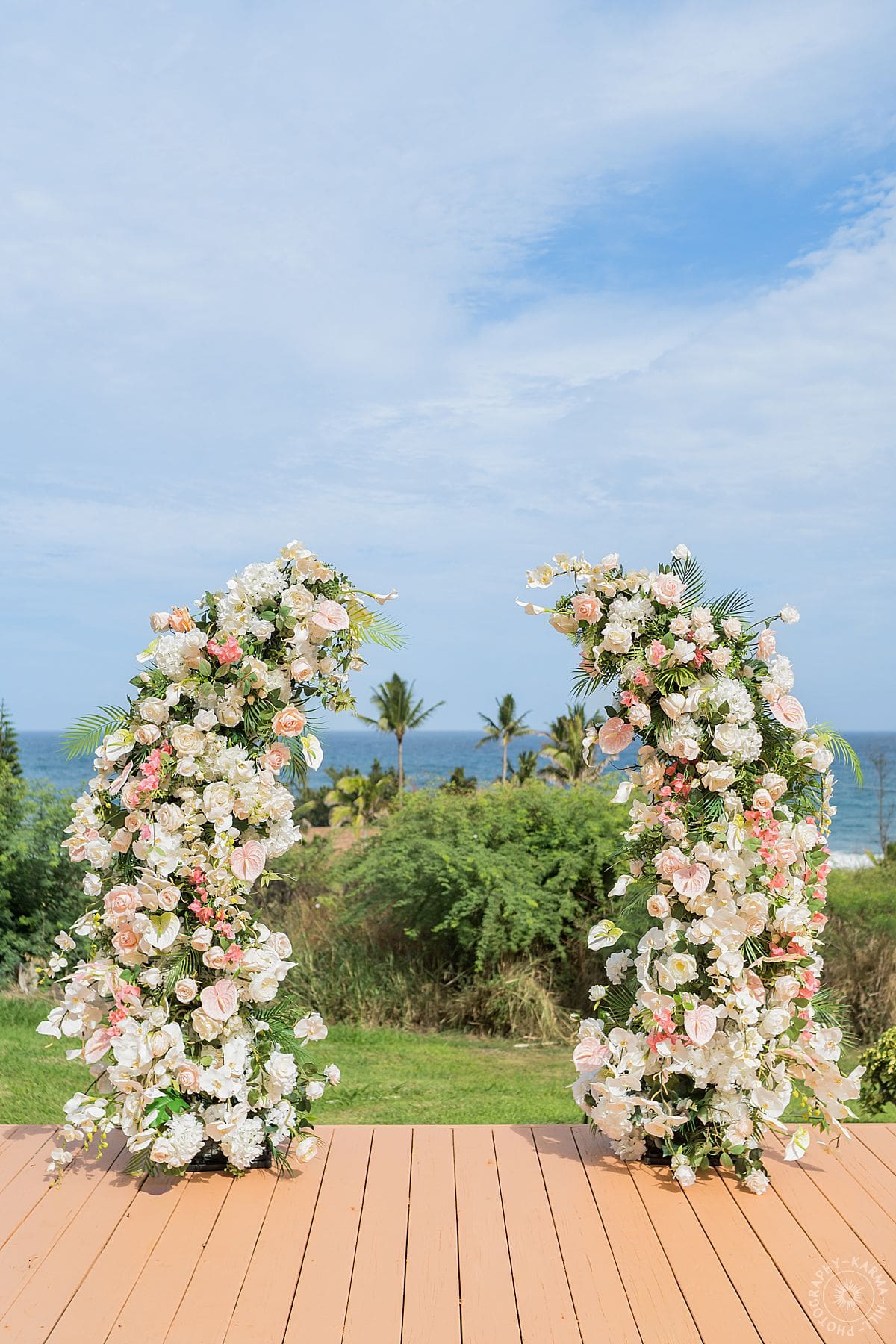 Kristen and Joey’s ceremony was pure island romance from start to finish! They exchanged vows on the deck overlooking the ocean, where the soft sound of waves mingled with laughter and happy tears. Framing the scene were two stunning floral silk towers, lush with tropical blooms in soft pastels and greenery, creating a dreamy archway that seemed to blend seamlessly with the horizon. It was absolutely stunning!