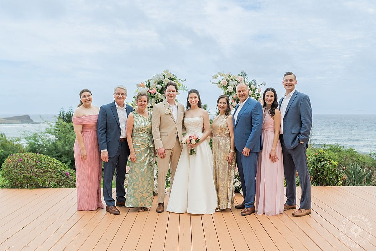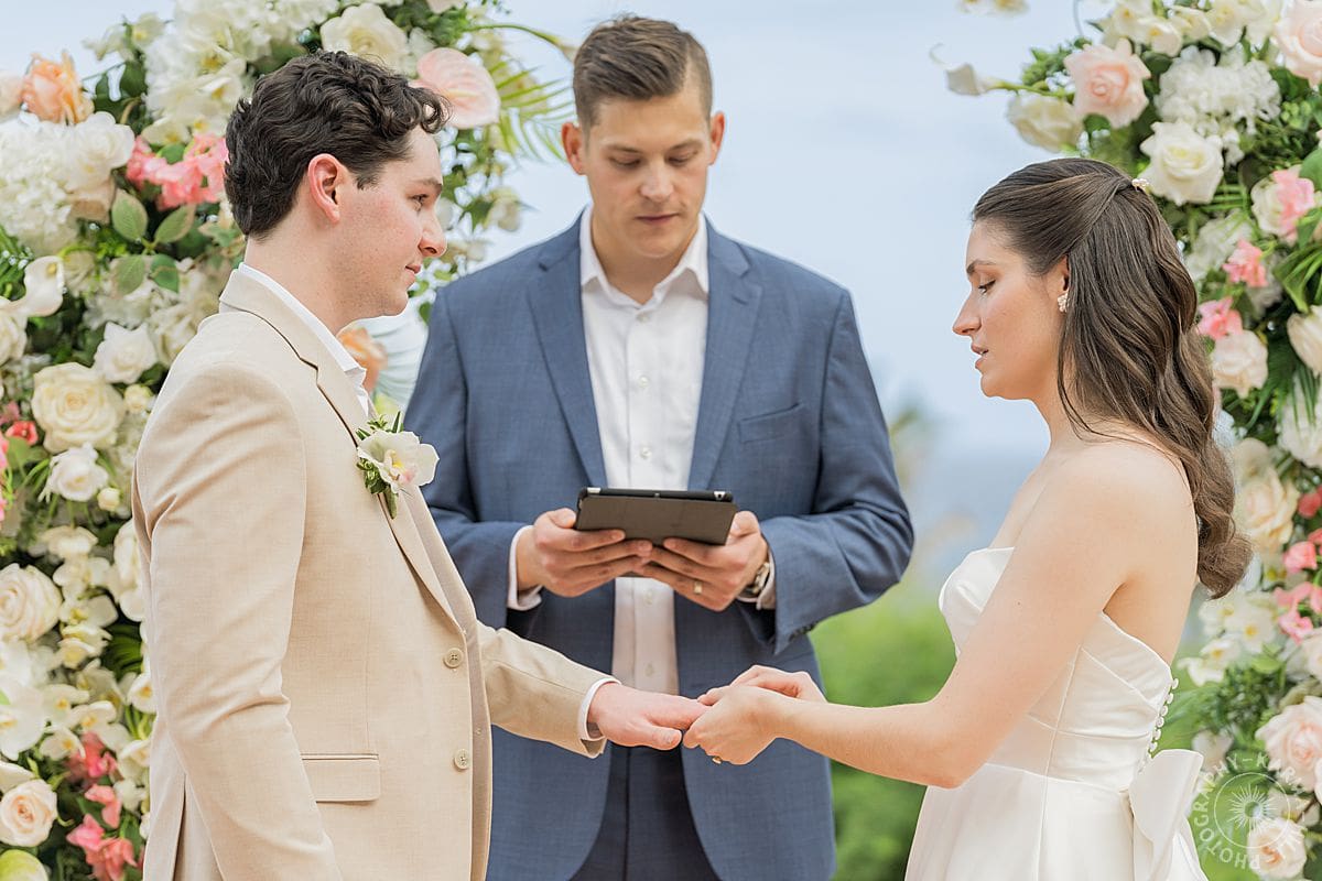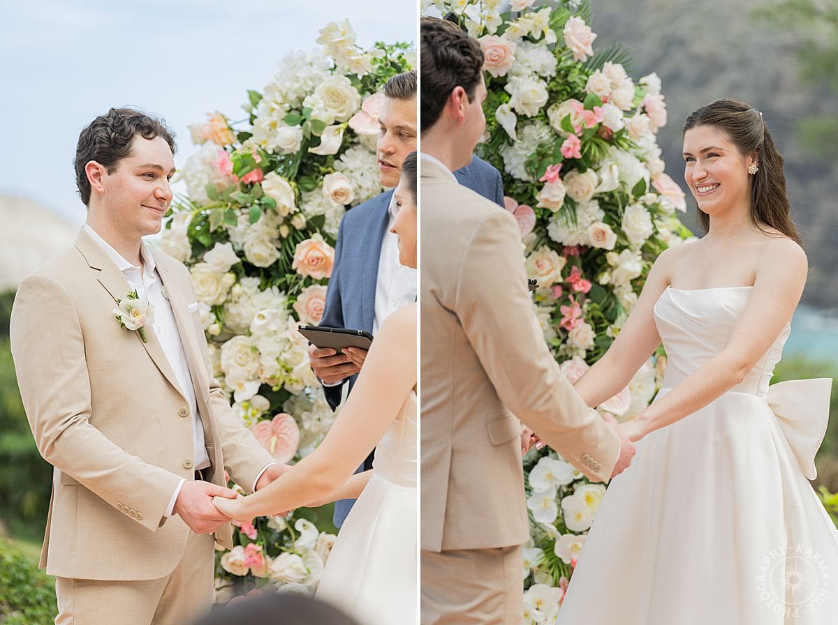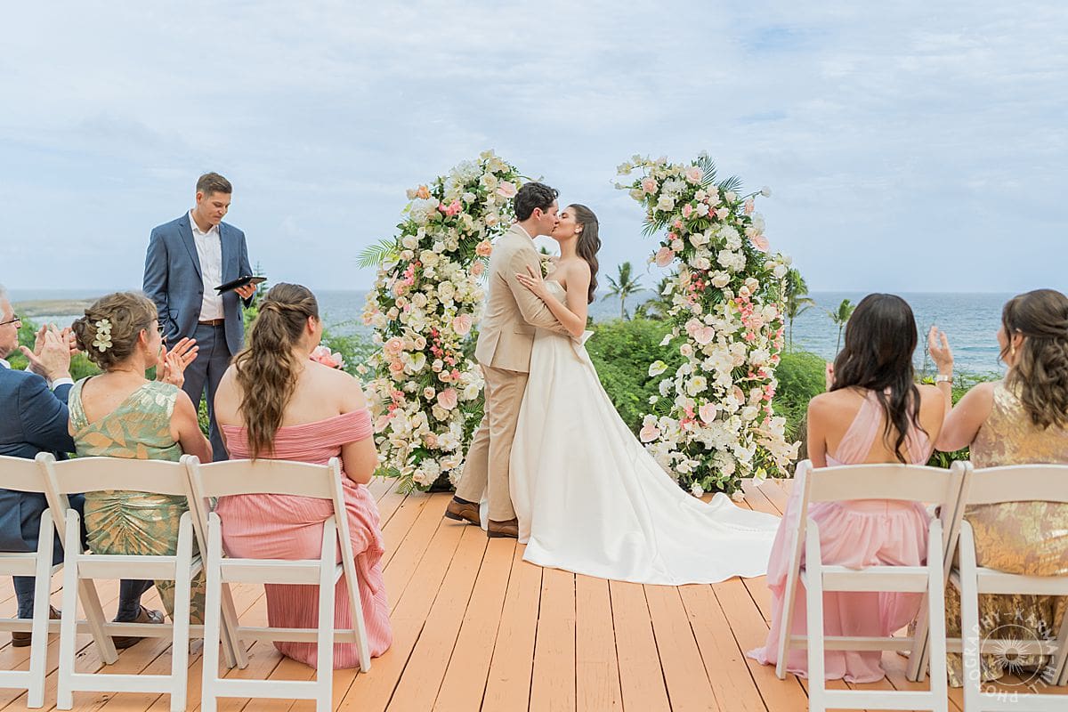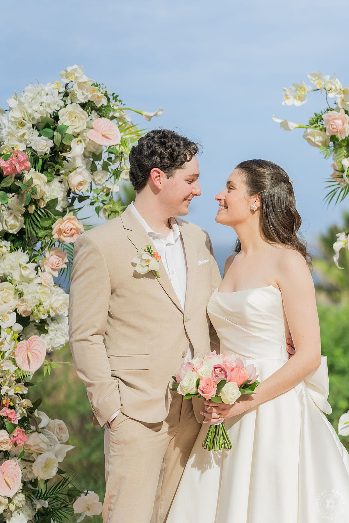 Kristen and Joey’s ceremony was pure island romance from start to finish! They exchanged vows on the deck overlooking the ocean, where the soft sound of waves mingled with laughter and happy tears. Framing the scene were two stunning floral silk towers, lush with tropical blooms in soft pastels and greenery, creating a dreamy archway that seemed to blend seamlessly with the horizon. It was absolutely stunning!