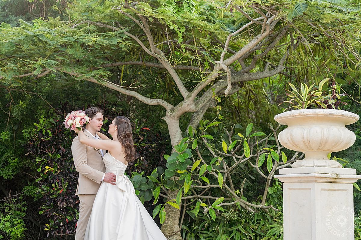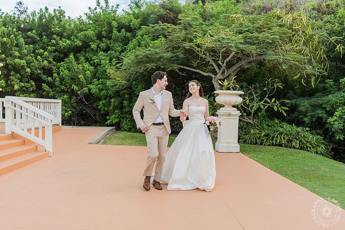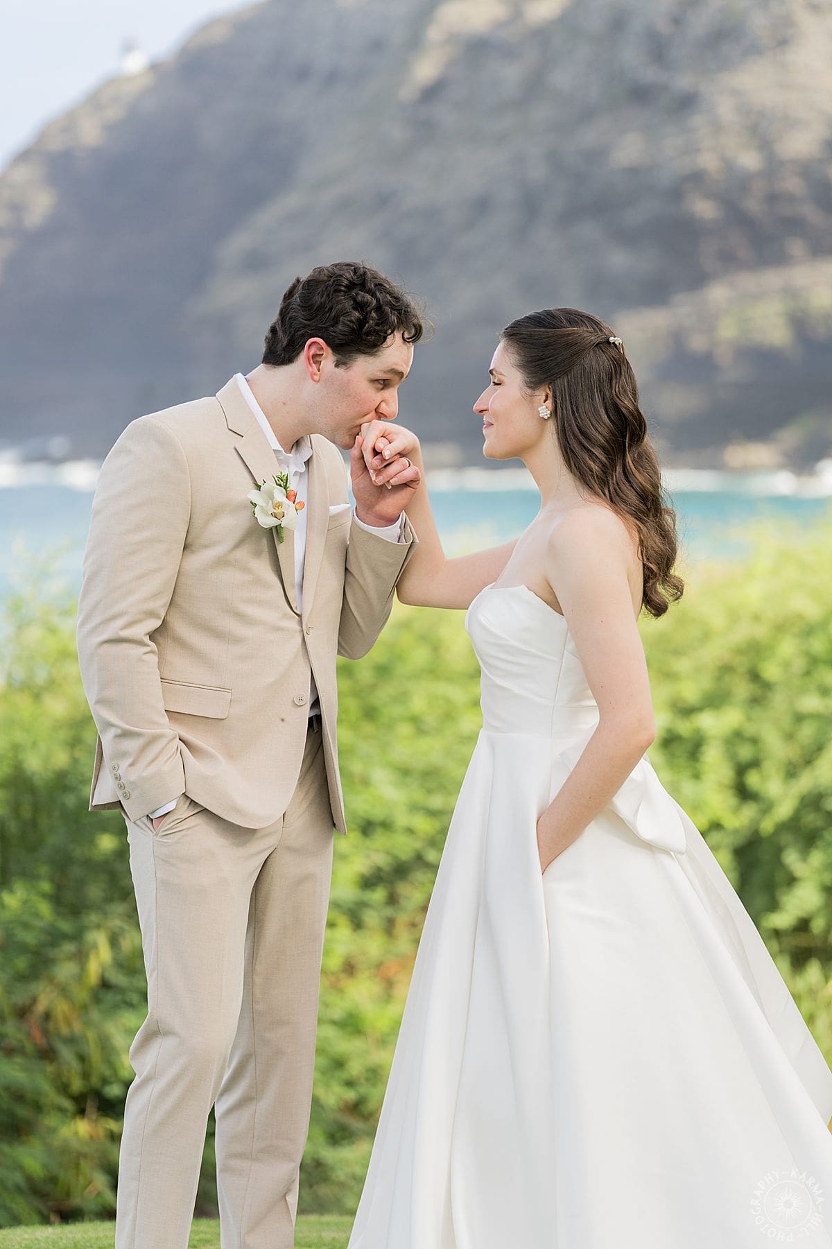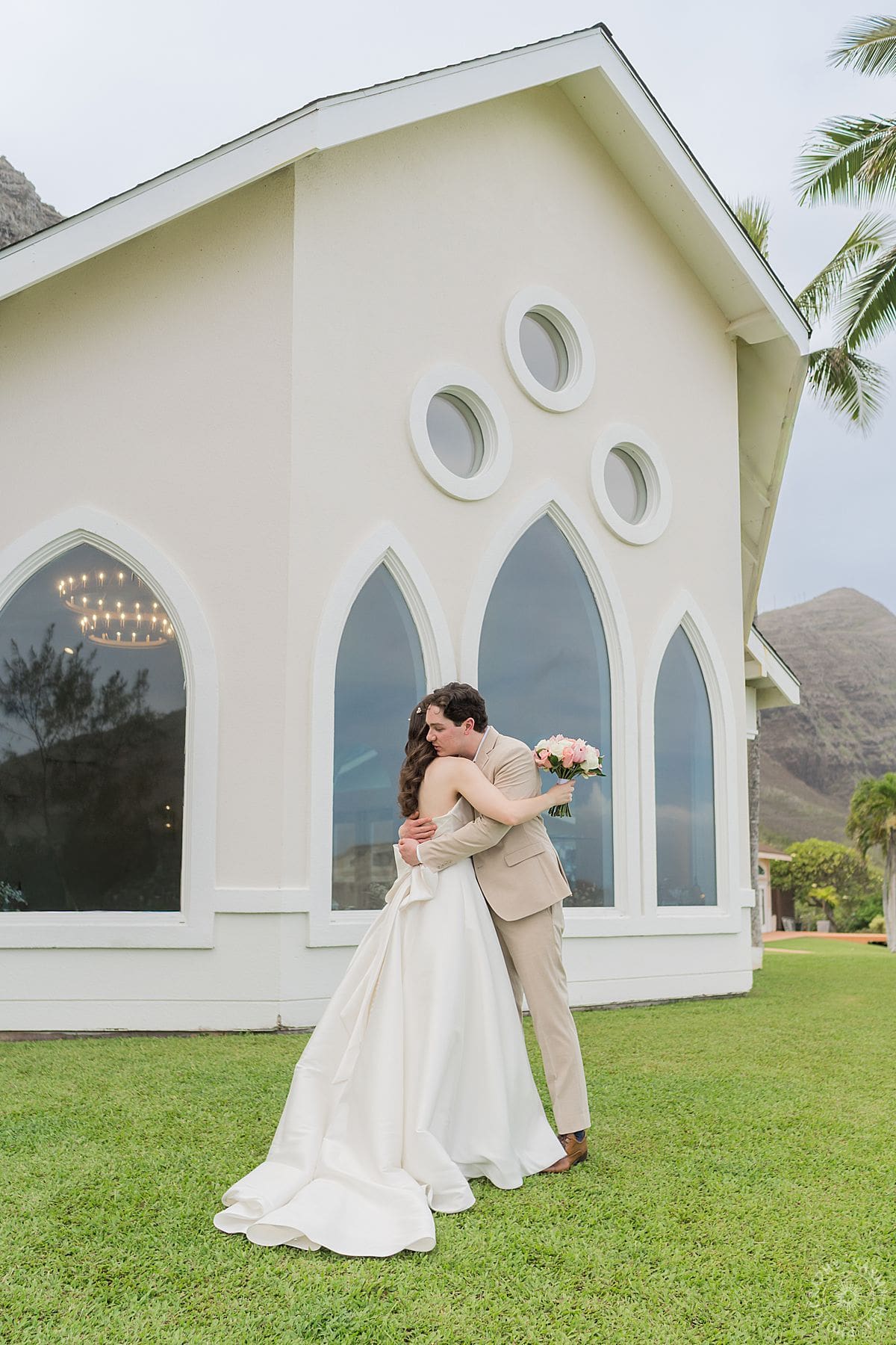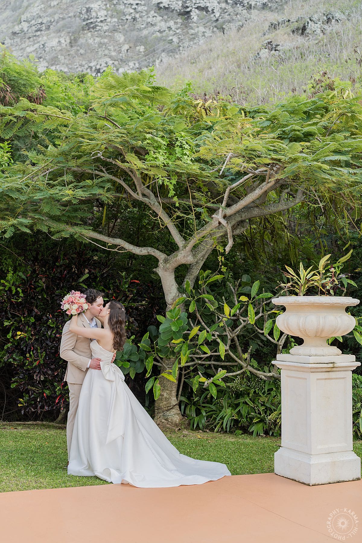 Afterwards, they snuck away for more beautiful portraits to continue their Oahu wedding photography. The lush grounds and beautiful chapel were the most idyllic settings for their first moments as husband and wife! There are so many beautiful, tucked-away spots for romantic and intimate moments. From the ocean view deck to the lush grounds, there were endless gorgeous photographic opportunities for these lovebirds! Just scroll down to see for yourself…