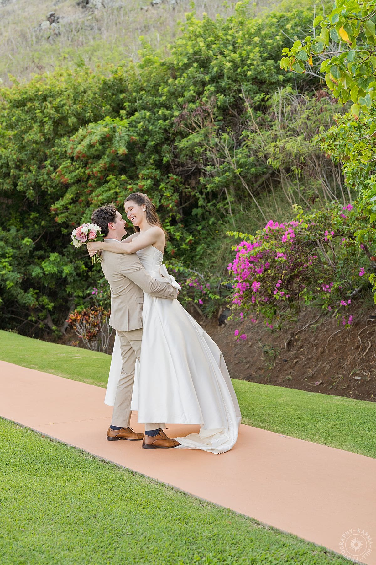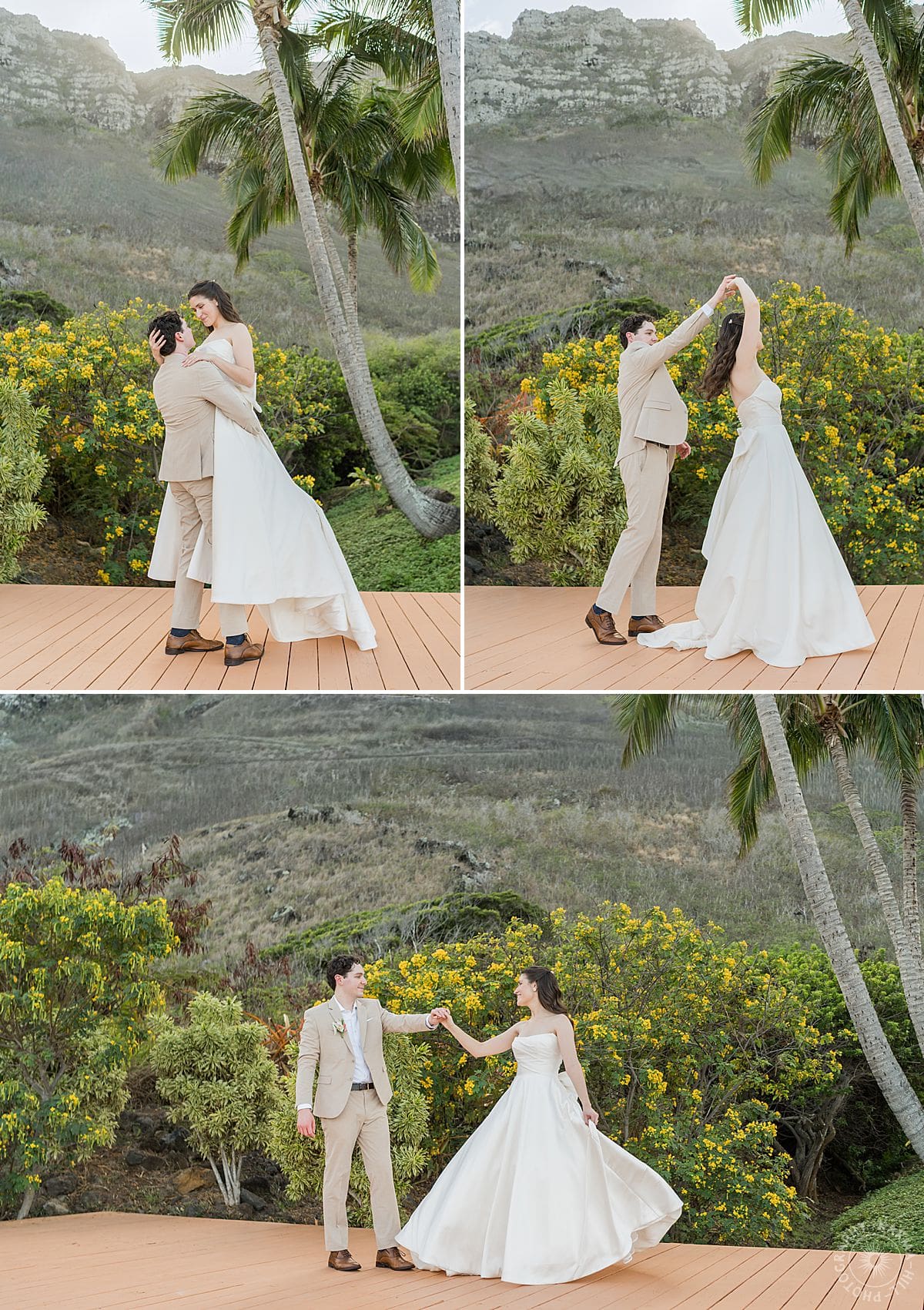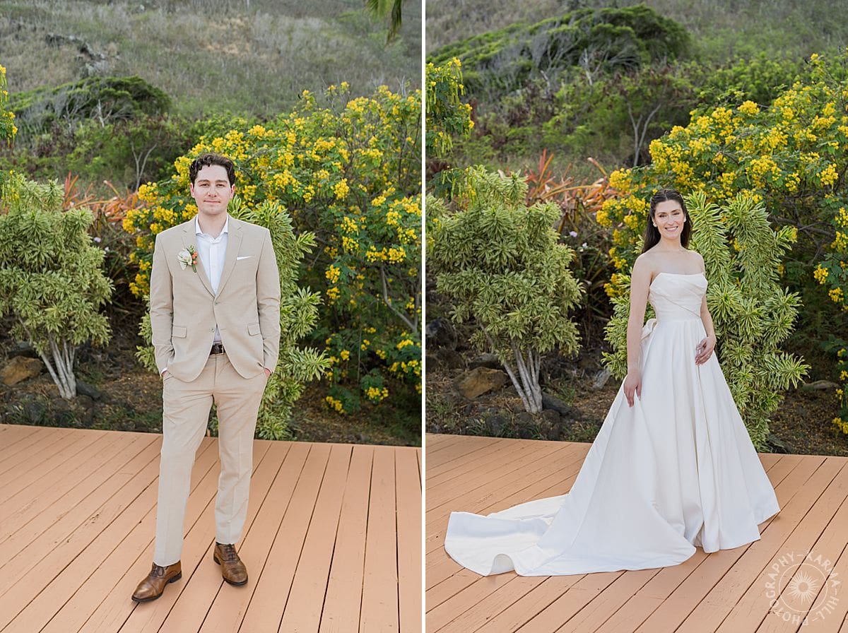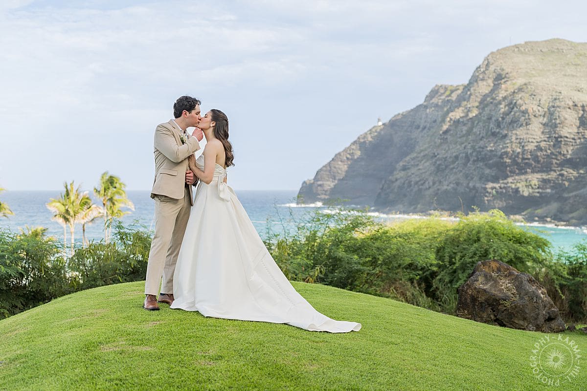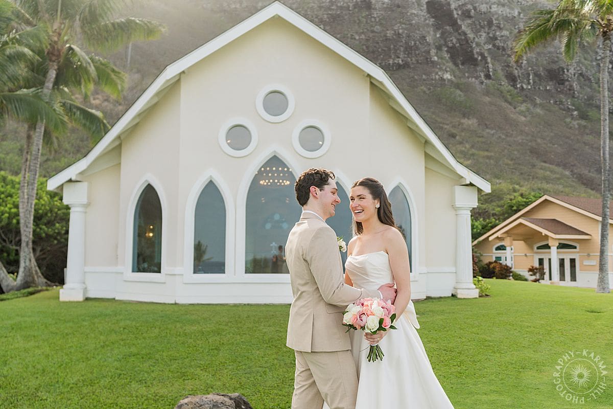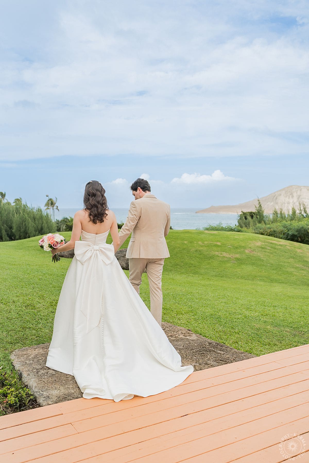 Afterwards, they snuck away for more beautiful portraits to continue their Oahu wedding photography. The lush grounds and beautiful chapel were the most idyllic settings for their first moments as husband and wife! There are so many beautiful, tucked-away spots for romantic and intimate moments. From the ocean view deck to the lush grounds, there were endless gorgeous photographic opportunities for these lovebirds! Just scroll down to see for yourself…