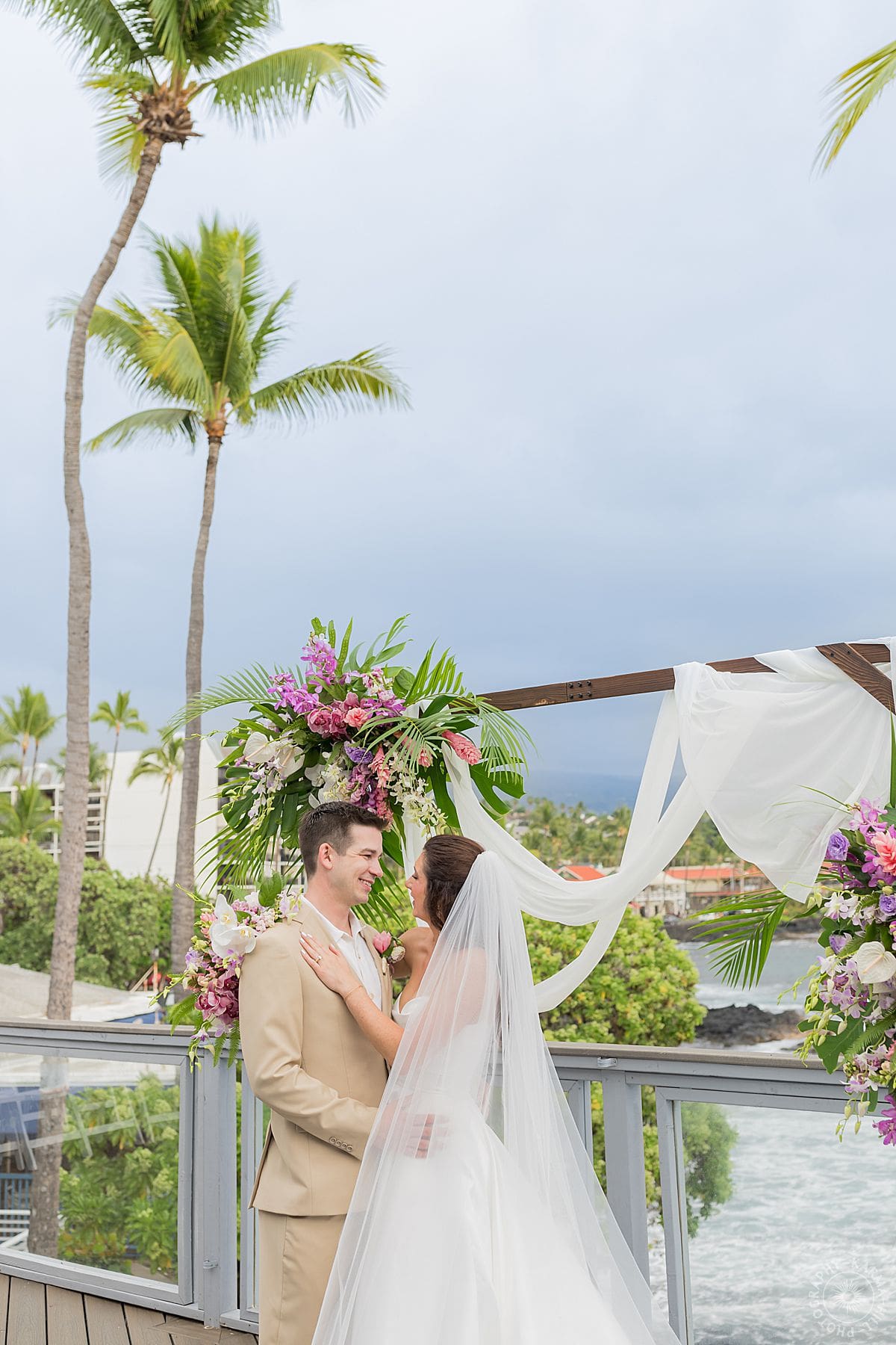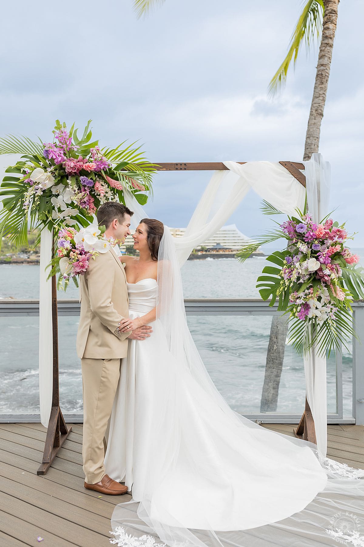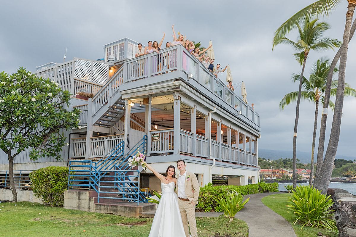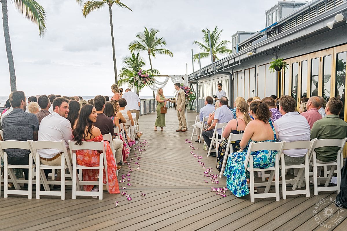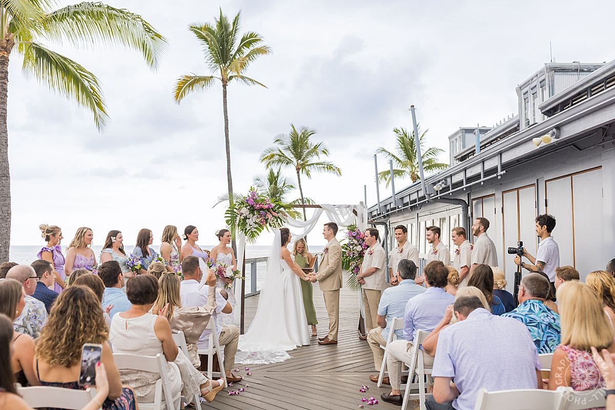 Their Big Island wedding photography continued at the stunning Papa Kona venue, which was serving major tropical romance. The flowers were lush and vibrant, the view was amazing, and their people showed up in full force. The ceremony was everything, sincere, warm, a little funny, and totally them. You could feel how much it meant.