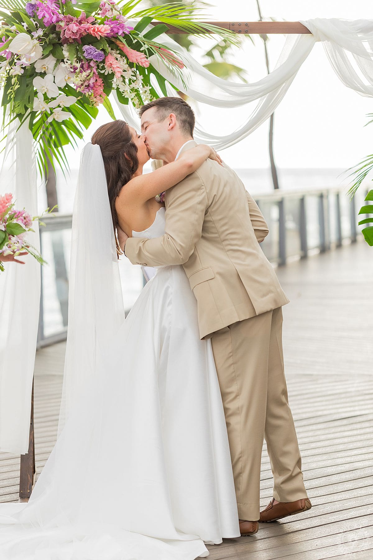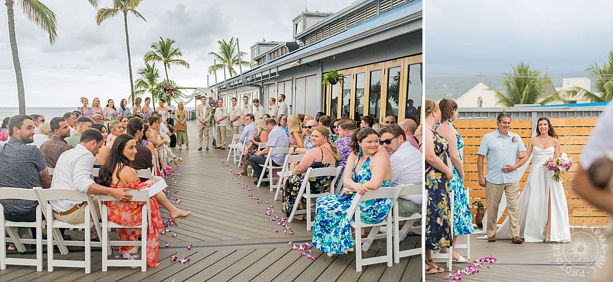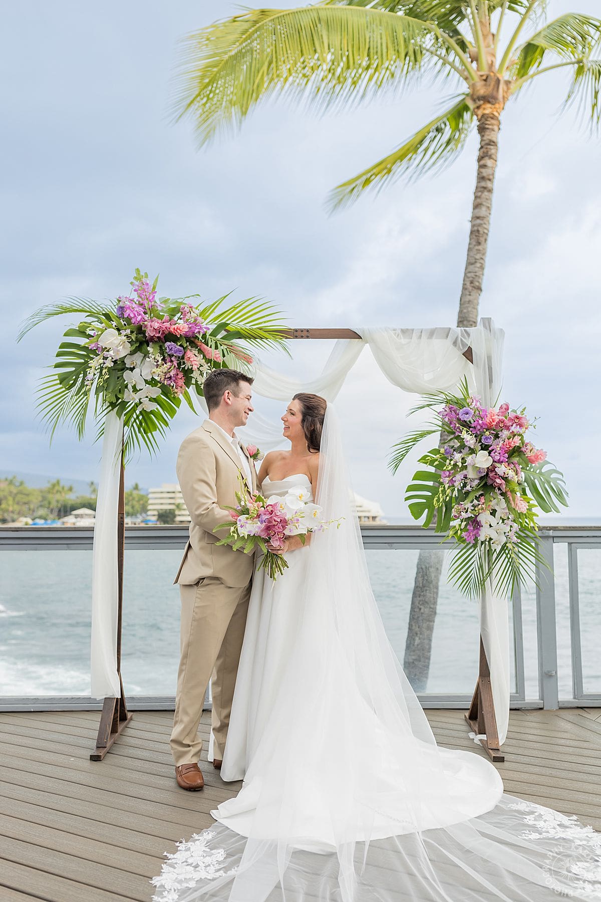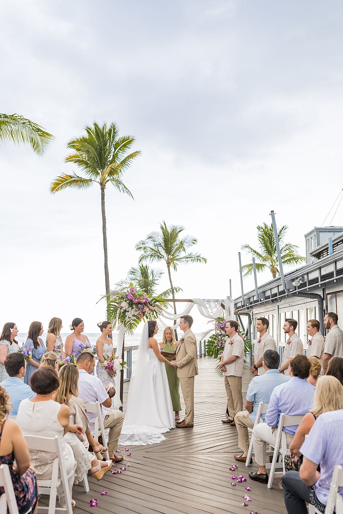 Their Big Island wedding photography continued at the stunning Papa Kona venue, which was serving major tropical romance. The flowers were lush and vibrant, the view was amazing, and their people showed up in full force. The ceremony was everything, sincere, warm, a little funny, and totally them. You could feel how much it meant.