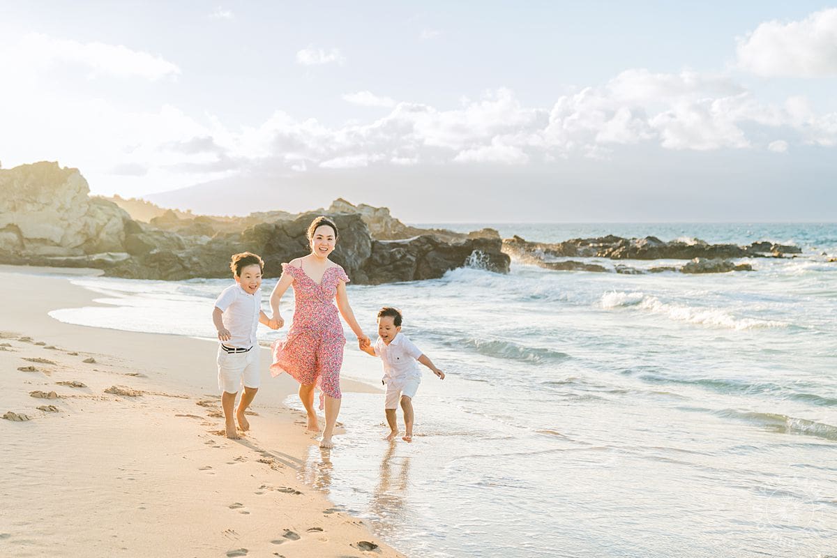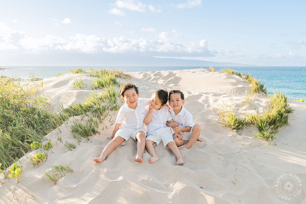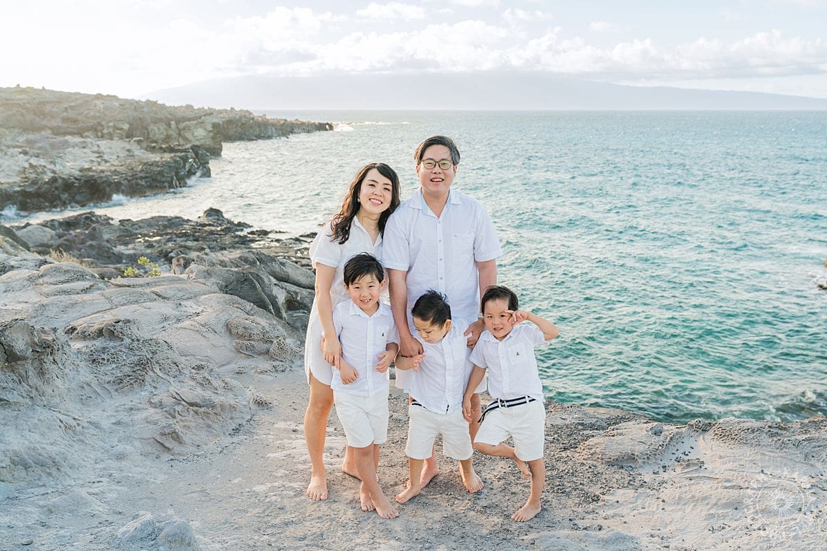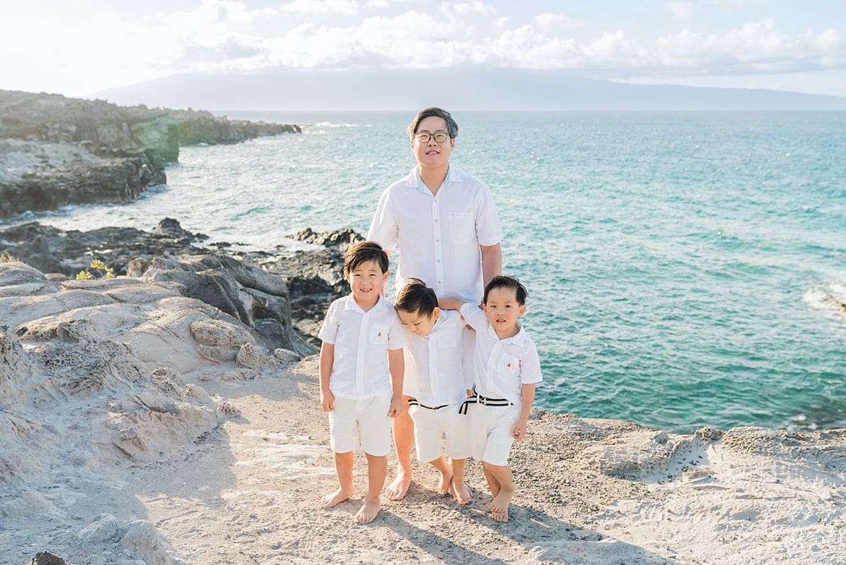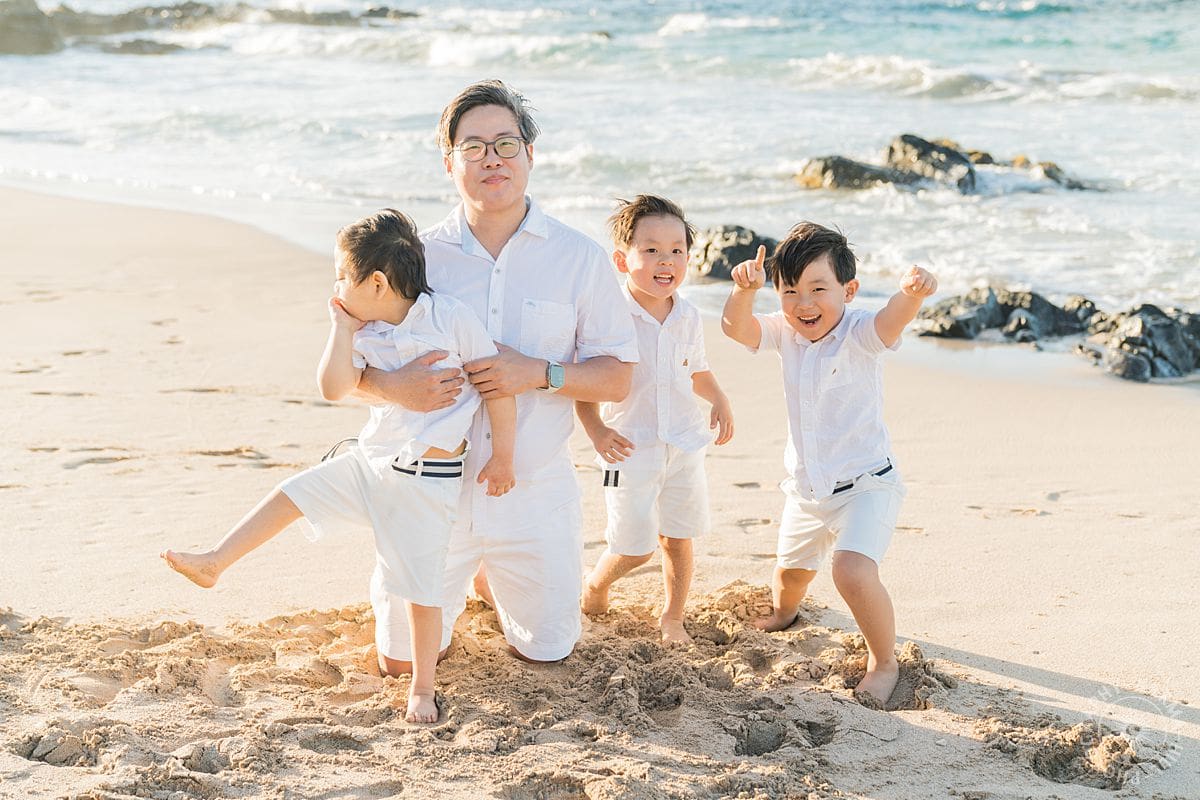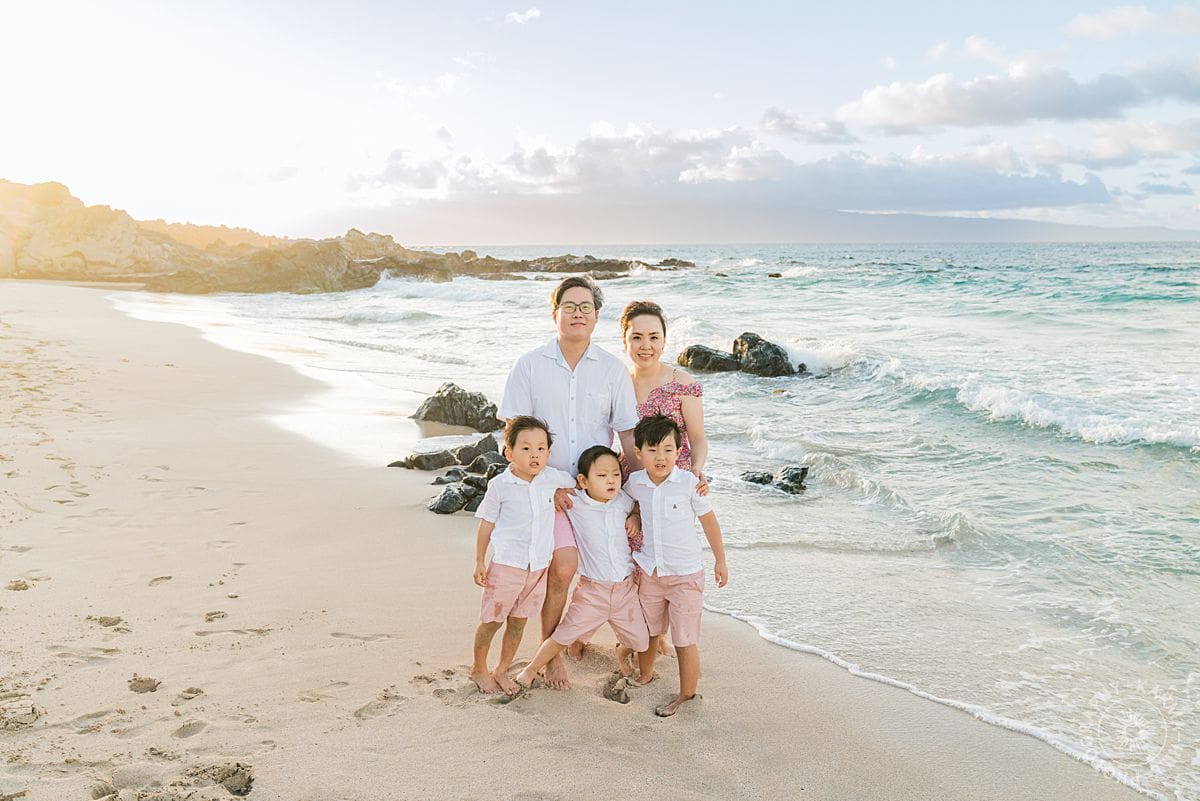 The Lee family showed up to their Maui family portrait session with three energetic boys, and from the very first frame, you could see it: love, light, and laughter. At Ironwoods Beach, the evening sun poured gold over the shoreline, and their portraits reflected every bit of it.