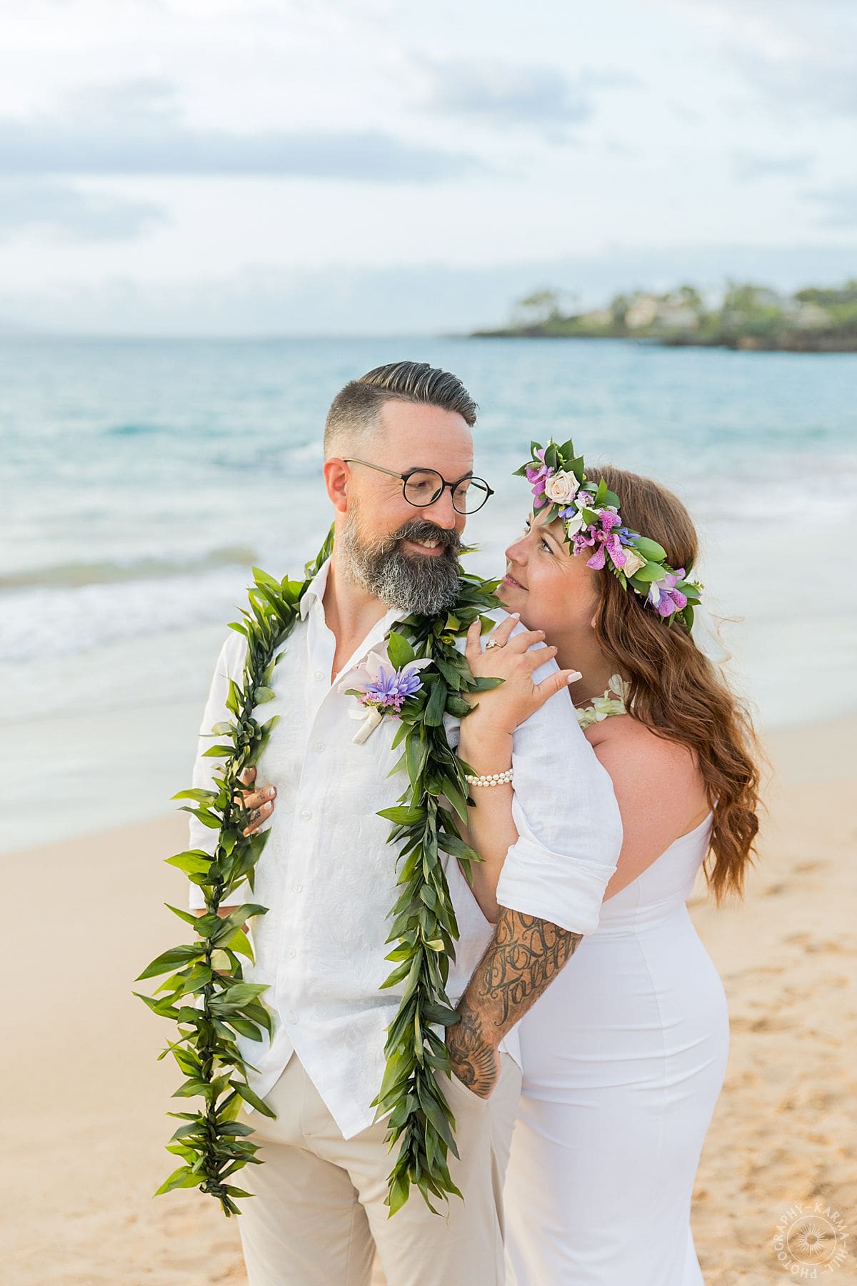 The light at Maluaka Beach did what Maui light always does: it wrapped around them like a blessing. Their photography session captured all of it, the way their fingers laced together like they’ve done it for decades, the soft laughter between them, and the kind of eye contact that said, “Let’s do this again in 25 more years.” Their Maui vow renewal photography was dreamy and froze their special moment in time.