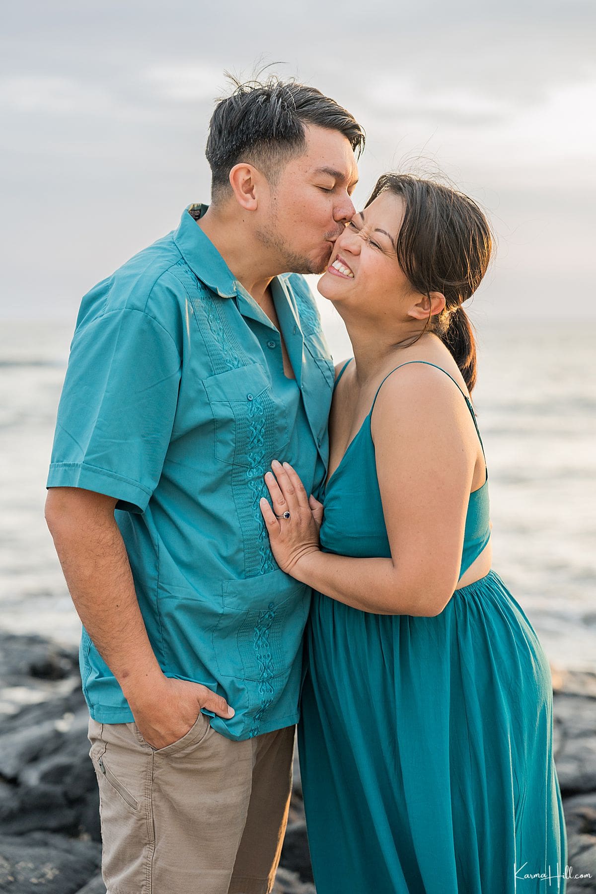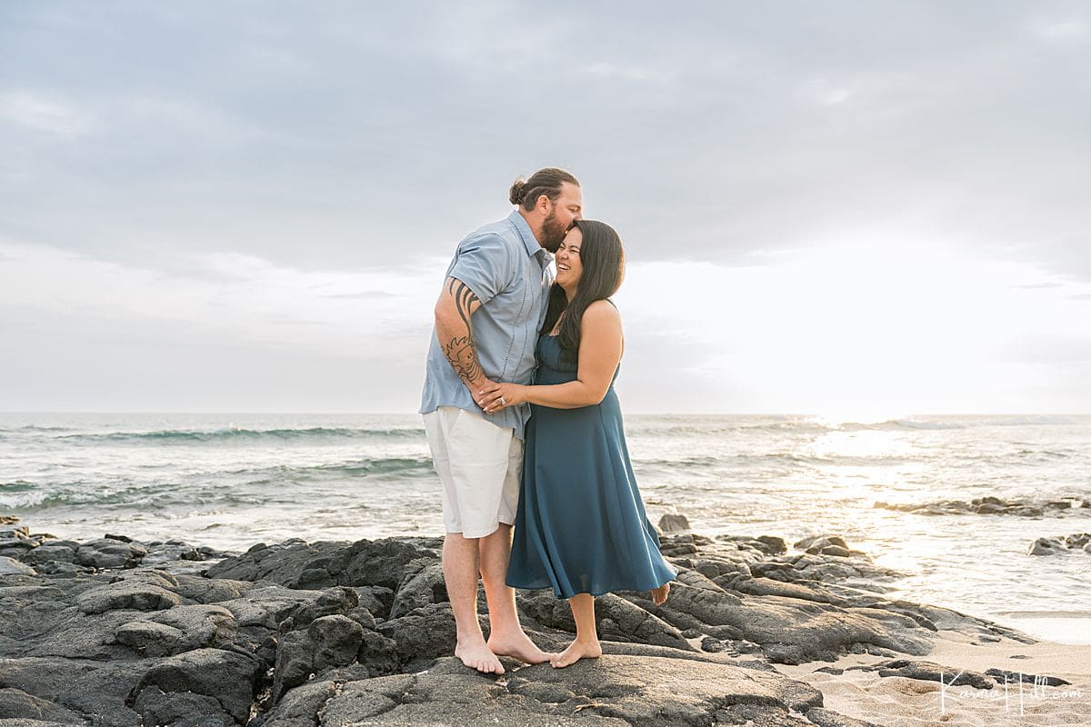 Old Kona Airport Beach was the perfect setting for the Hoxengs’ portrait session. With golden hour lighting and the ocean gently glowing behind them, the vibe was effortless island charm.