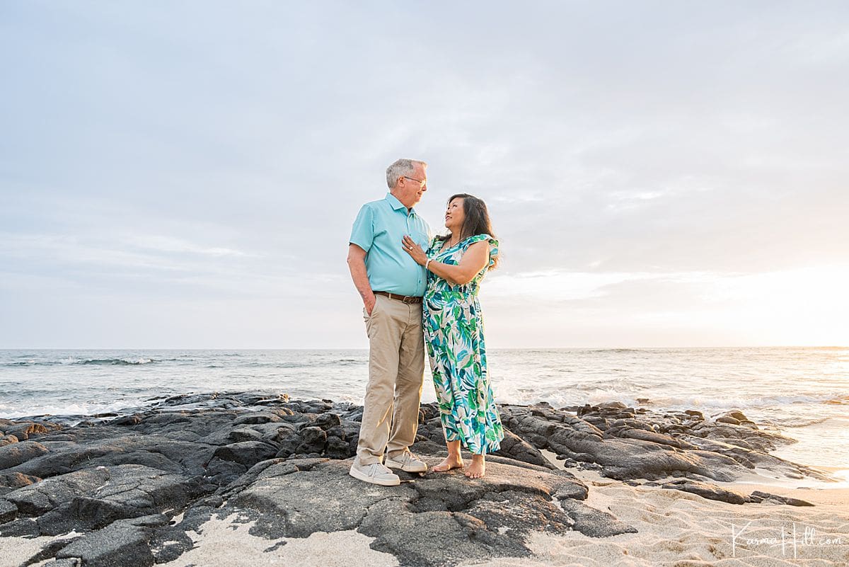 One couple strolled hand-in-hand with their daughter, caught mid-laugh. A little girl stood confidently on the lava rocks, her smile brighter than the setting sun behind her. Grandparents and grandkids posed beneath the palms, surrounded by love and pure island magic.