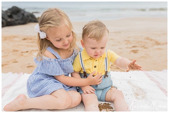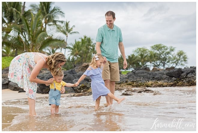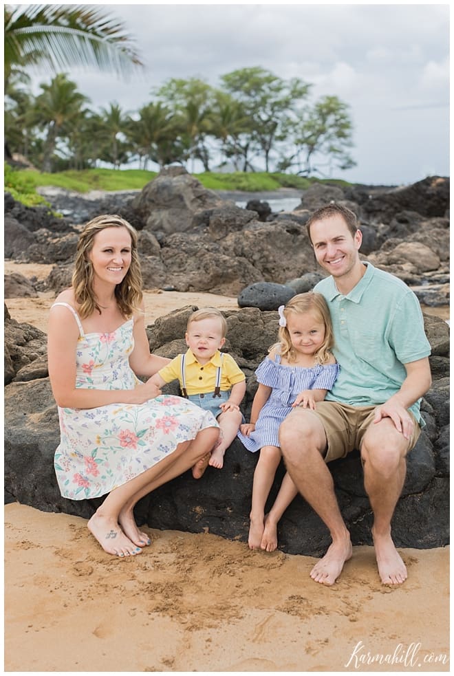 Leo’s time was focused on high fives and blowing kisses, both adorably executed. Then there’s his big sister. With the best sassy smile we’ve seen in a while, she was an absolute hoot. Small in stature but big on life, she had no trouble whipping out the poses to entertain the camera. We had so much fun with these four. Venturing away from Makena Cove, where they were married, they loved Polo Beach’s stretch of shore. Though the sky was painted with cloud cover, it made for a soft dreamy look…and it meant no one had to squint! Thank you, Murphy Family, for letting Karma Hill Photography capture the memories made on this trip. We look forward to future anniversary trips!!! Happy Anniversary and Warm Aloha!!!