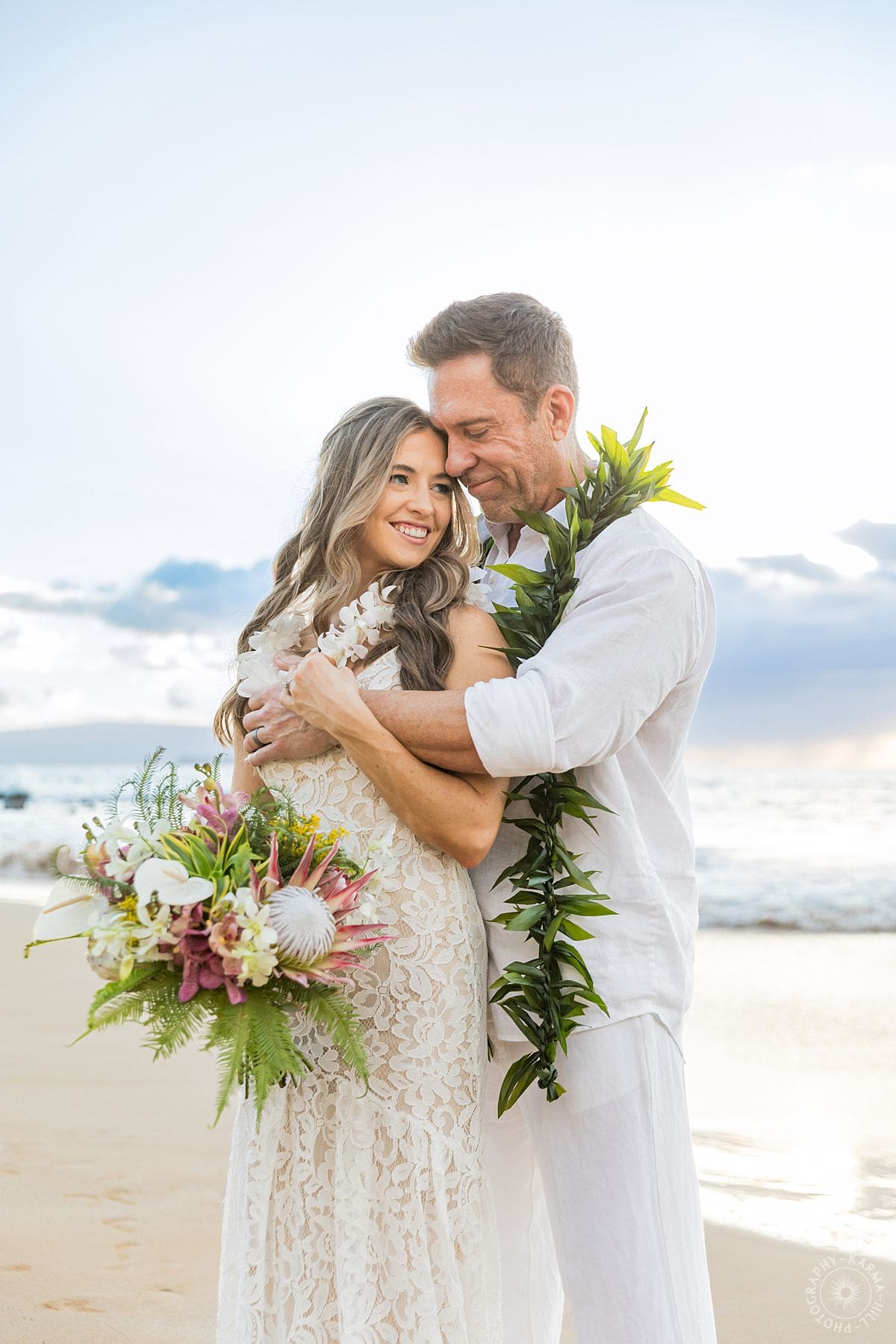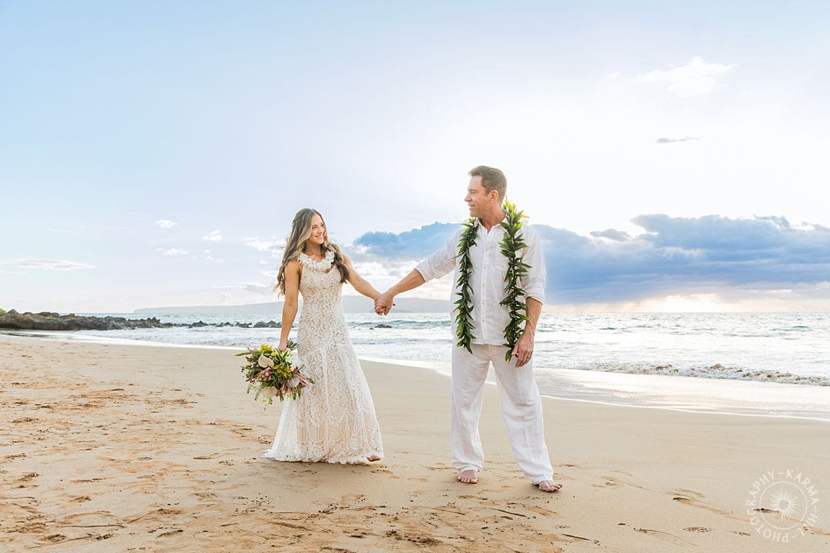 Their Maui wedding at Polo Beach was the perfect reflection of that spirit. Instead of a big, traditional celebration back home, they chose something more meaningful: an intimate “just us” moment in paradise. The ocean breeze, the sound of the waves, the soft light stretching across the horizon, it all felt timeless, like the world had slowed down just for them…