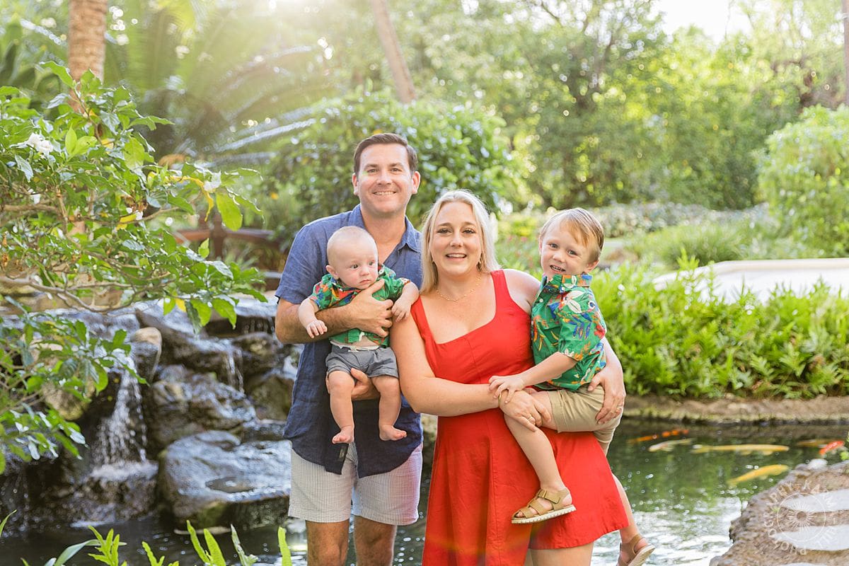 We started the session strolling through the resort’s lush tropical gardens, where the palms swayed and the sunlight filtered through like something out of a vacation dream. Monica and Patrick couldn’t stop beaming, kissing little cheeks, twirling Braden in their arms, and soaking up the pure joy of being in the moment with their boys. Tyler gave us the softest smiles, and Braden? He had us all laughing with his beach-bound energy and big-brother pride.