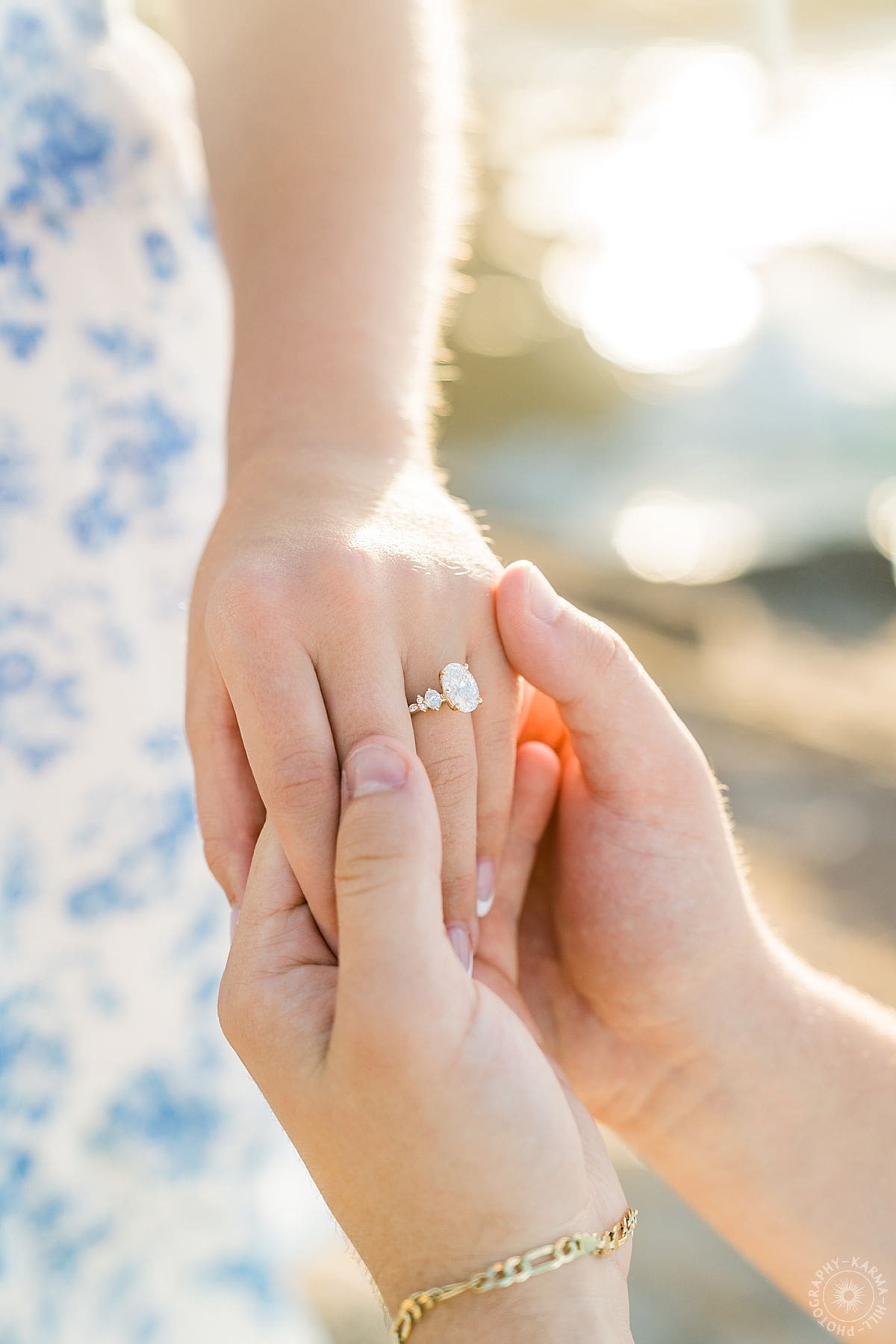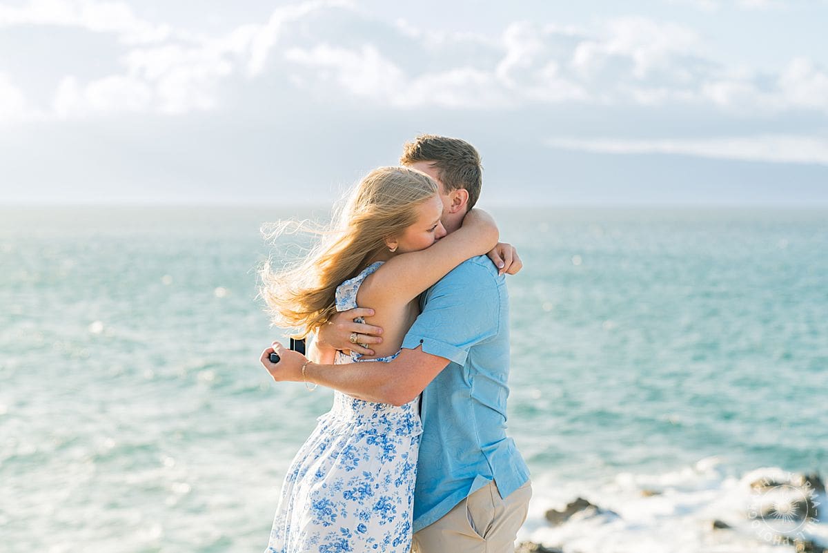 Afterward, the magic continued with more Maui proposal portraits that perfectly captured the joy of the moment. Our photography style leans into both candid emotions and timeless elegance: the shocked laughter, the happy tears, the big bear hug, and the quiet glances that say everything without words. Ironwoods gave us sweeping, dramatic backdrops while the couple brought the sparkle of love. And a sparkling new diamond looks pretty good on her finger and against the sparkling ocean, doesn’t it?! These two made our job so easy! They looked so incredible against the blue horizon on the cliffs, matching perfectly with the scenery.