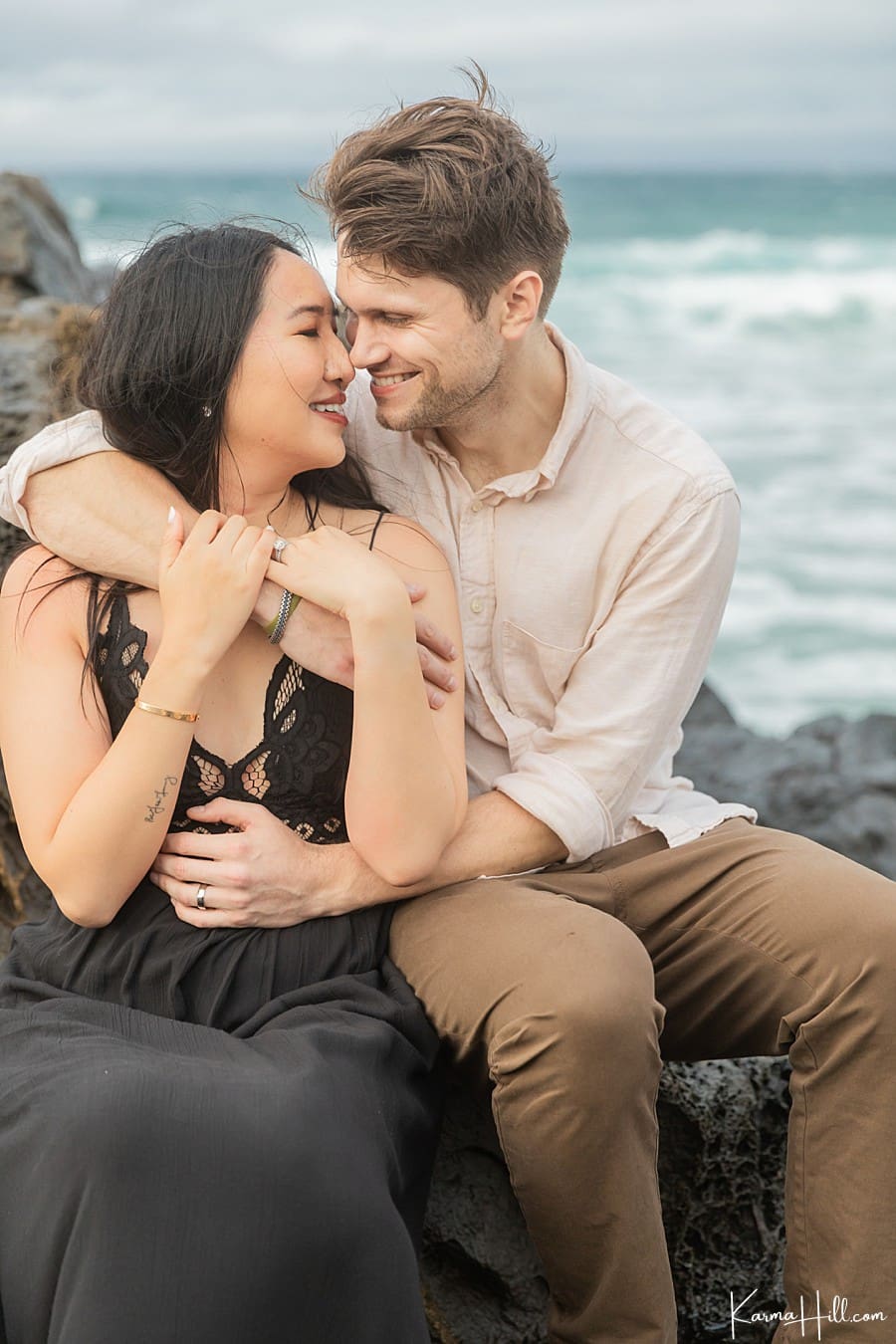 The delicate sky and sapphire ocean at Ironwoods Beach set the scene for this session! You can see how the foamy cerulean waves, dramatic lava rocks, and ivory sand decorate the background delightfully. Although there was heavy cloud coverage, the sunset was full of pastel hues! Most importantly, we like this location because of the breathtaking landscapes — they make every portrait feel enchanting!