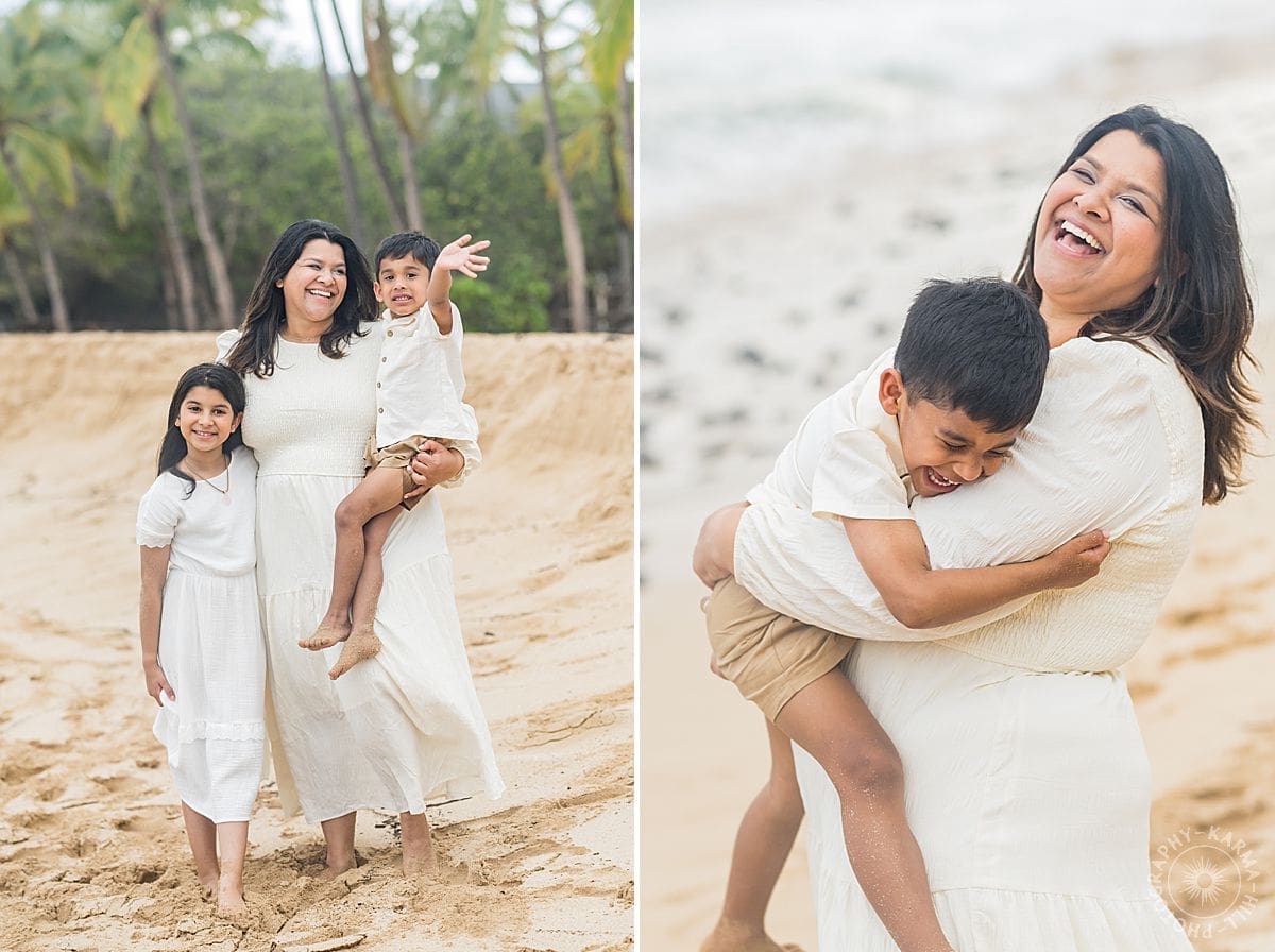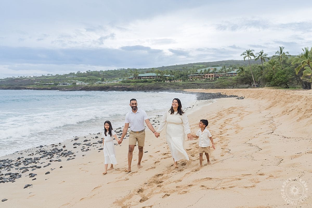 The kids ran barefoot through the sand, clung to their parents in the most heart-melting hugs, and broke into laughter so often it felt contagious. Between the swaying palms and the gentle shoreline at Hulopoe Beach, every frame seemed to capture something real, easy, and joyfully unscripted.