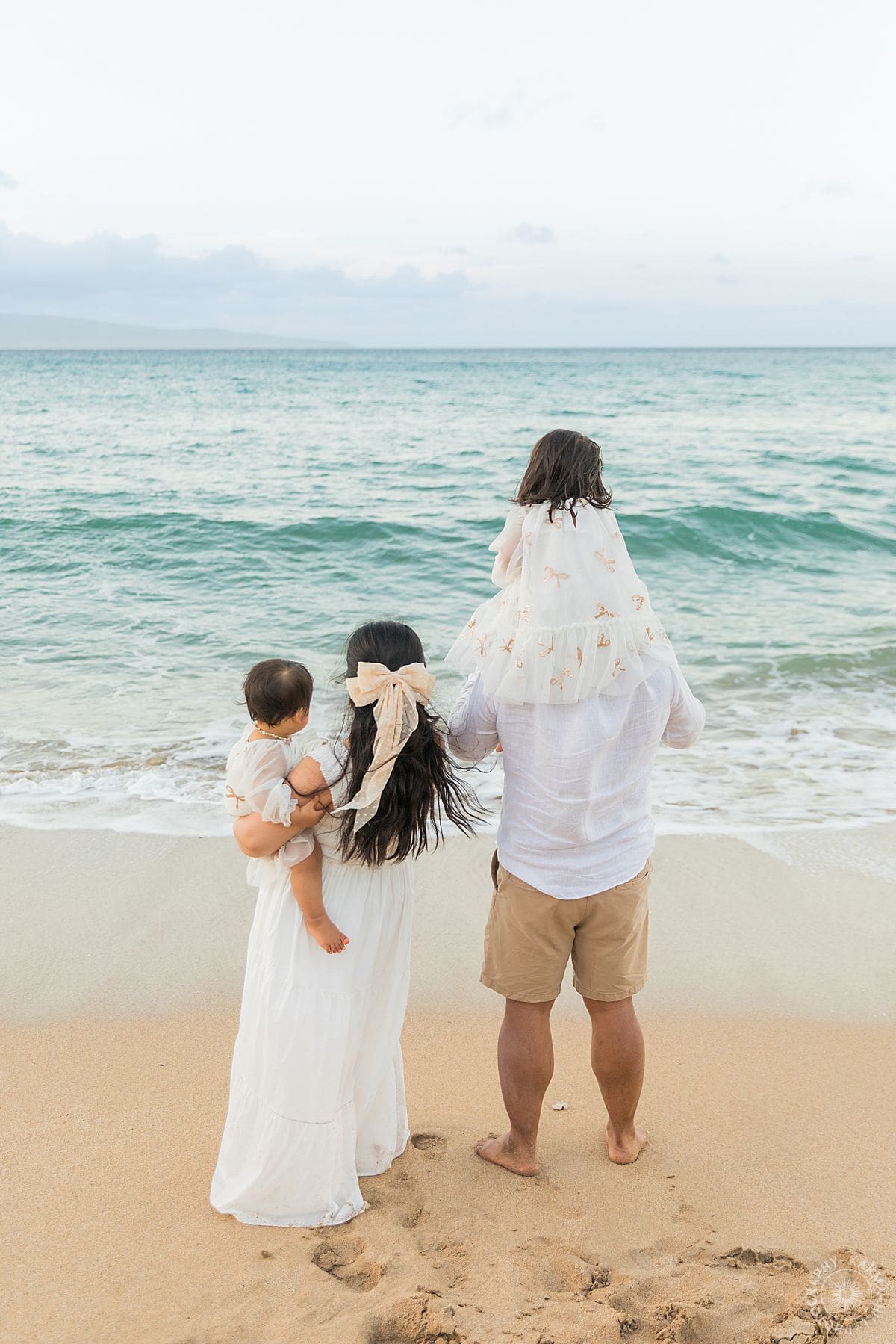 And truly, they looked amazing. Happy in that relaxed, island way. Connected in the way that only real family love can feel. Every image shimmered with those soft pastel tones, creamy sand, pale blue water, and the delicate blush of sunset that make Maui portraits so timeless!