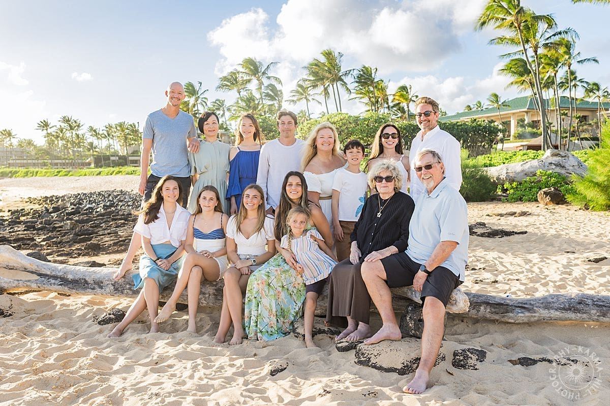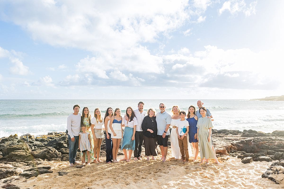 There are moments when a family finally aligns in one place, calendars cleared, flights coordinated, everyone there. And you can feel how special it is the instant it happens. The Smyth family’s Kauai family portrait at Shipwrecks Beach was exactly that kind of moment. Visiting a place they already knew and loved, they gathered for their very first full family get-together, fifteen people strong, and it felt nothing short of meaningful!