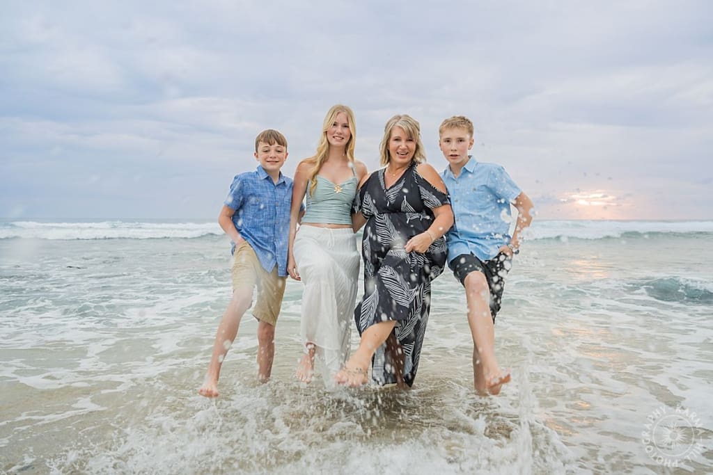 What immediately caught our attention during the Oahu family portrait session was the family’s impeccable coordination. Their choice of sand and brown colors effortlessly blended with the golden hues of the sandy beach, creating a visually stunning backdrop. The cohesion of their outfits added an elegant touch, enhancing the overall aesthetic of the photographs.