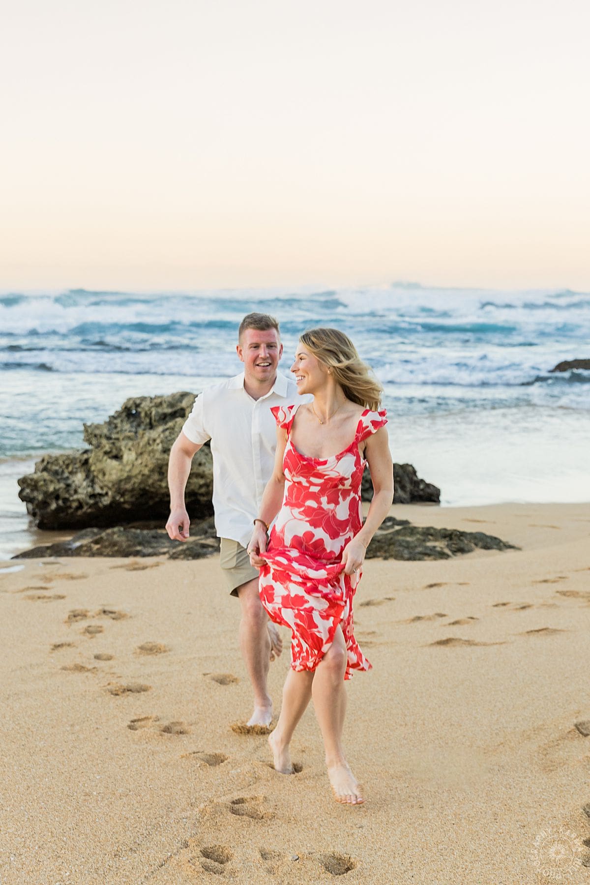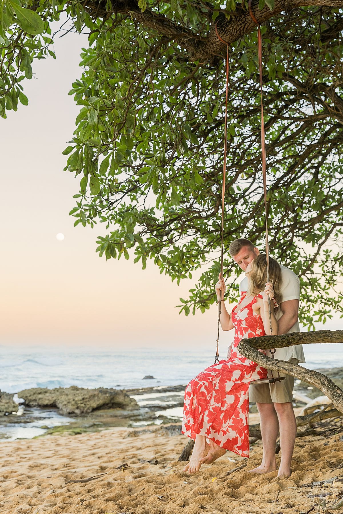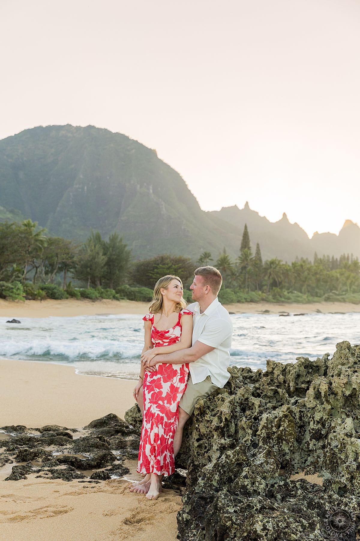 The ocean stretched endlessly behind them, the mountains wrapped the shoreline like a secret, and the light did that soft, golden thing Kauai does best. Taylor’s dress popped beautifully against the natural tones of the sand and sea, adding just the right amount of bold romance to an already stunning scene. Every frame felt calm, intentional, and a little bit cinematic, the kind of backdrop that makes a big life moment feel even bigger.