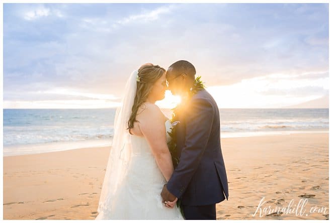 Though they had to keep their work-place romance a secret at first, Stacey and Terrill were ready to shout it from the roof tops after their Beach Wedding in Maui. Falling in love across the lobby of the Bank of America, their relationship has bloomed over the years and they couldn’t wait to begin their new life together. Leaving Arkansas behind in favor of some fun in the sun, our dazzling duo was blessed with a beautiful evening for this new chapter’s start. The soft cloud cover made for a lovely light filter, which added a dreamy quality to their special day.