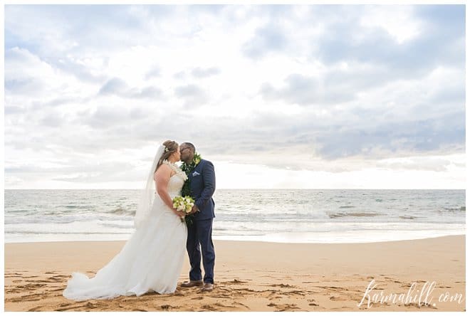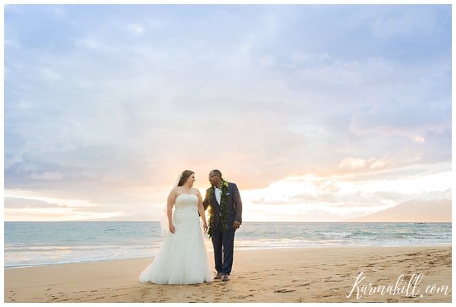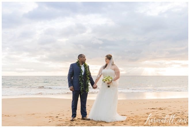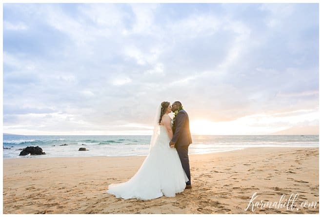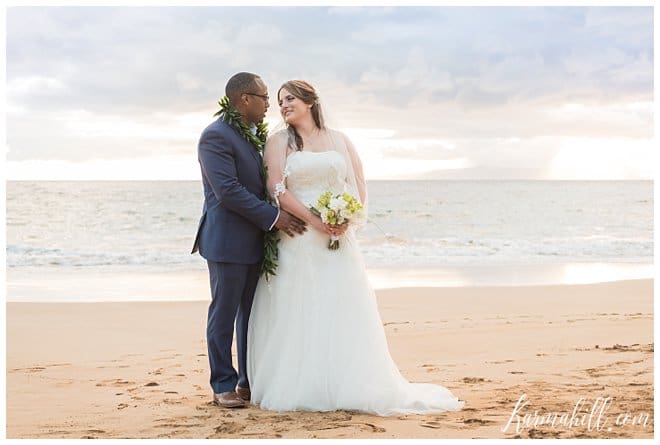 Though they had to keep their work-place romance a secret at first, Stacey and Terrill were ready to shout it from the roof tops after their Beach Wedding in Maui. Falling in love across the lobby of the Bank of America, their relationship has bloomed over the years and they couldn’t wait to begin their new life together. Leaving Arkansas behind in favor of some fun in the sun, our dazzling duo was blessed with a beautiful evening for this new chapter’s start. The soft cloud cover made for a lovely light filter, which added a dreamy quality to their special day.